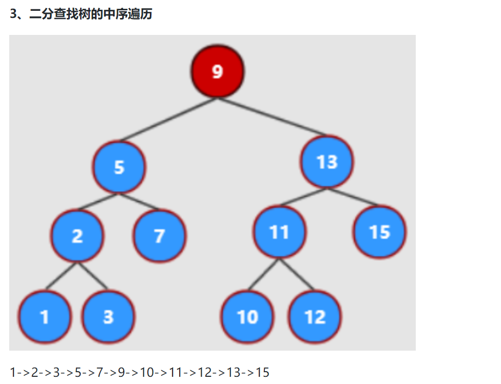 - 中序遍历:左子树---> 根结点 ---> 右子树