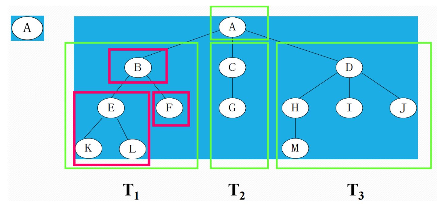 - 除根节点以外的其他结点可分为m(m>0)个互不相交的有限集T1, T2, T3 ...,Tm,其中每个结合本身也是一颗树,并且称之为根的子树(SubTree)