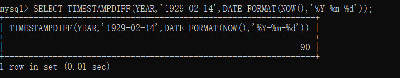 SELECT TIMESTAMPDIFF(YEAR,'1929-02-14',DATE_FORMAT(NOW(),'%Y-%m-%d'));