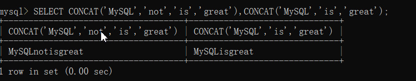 SELECT CONCAT('MySQL','not','is','great'),CONCAT('MySQL','is','great');