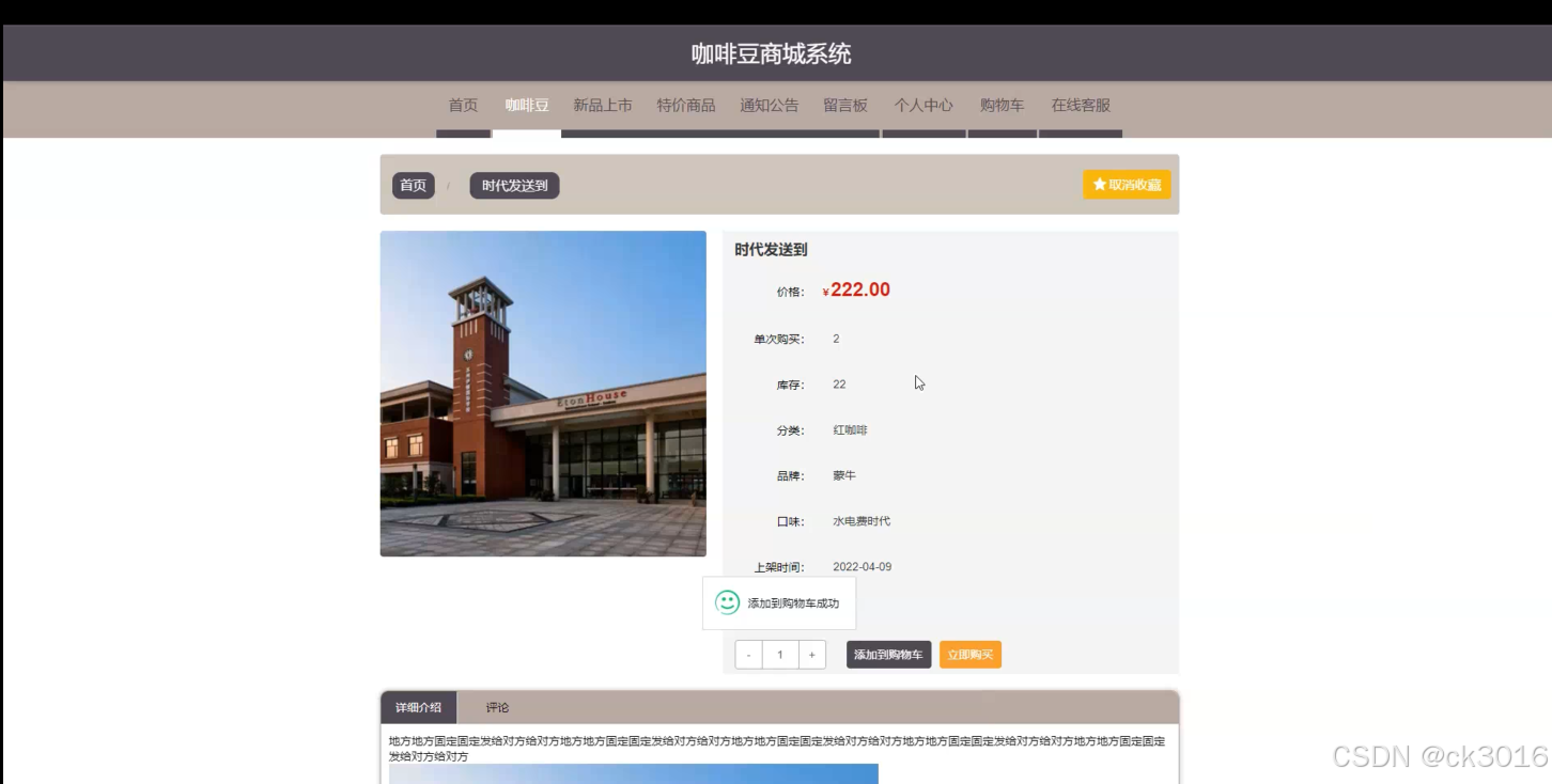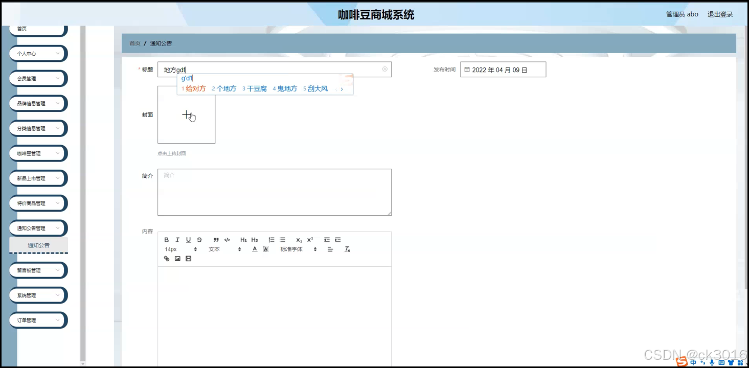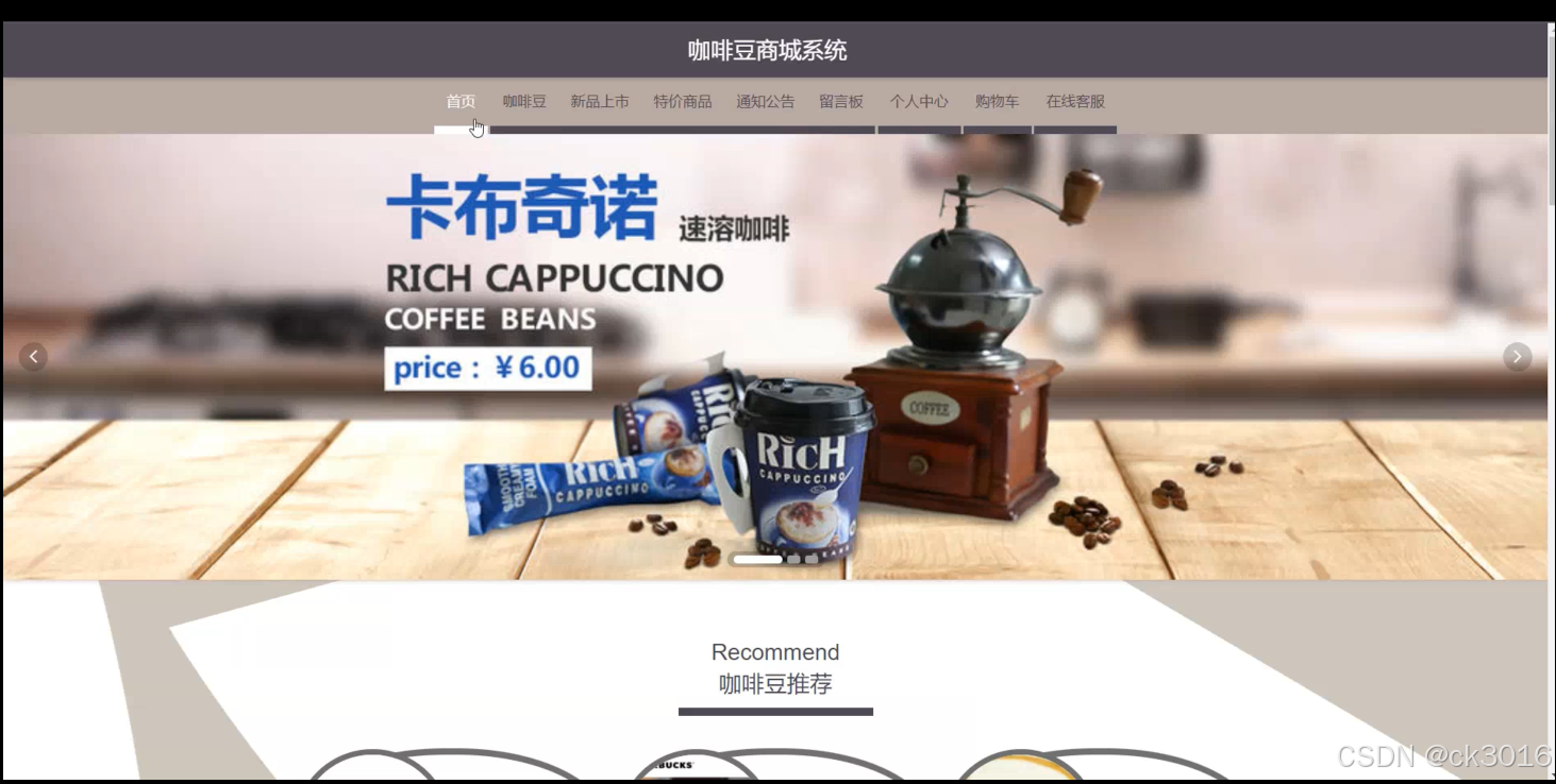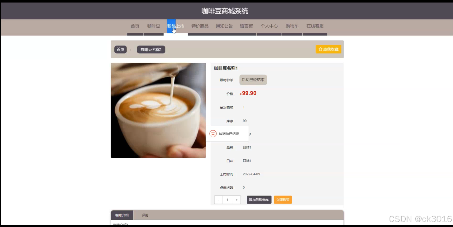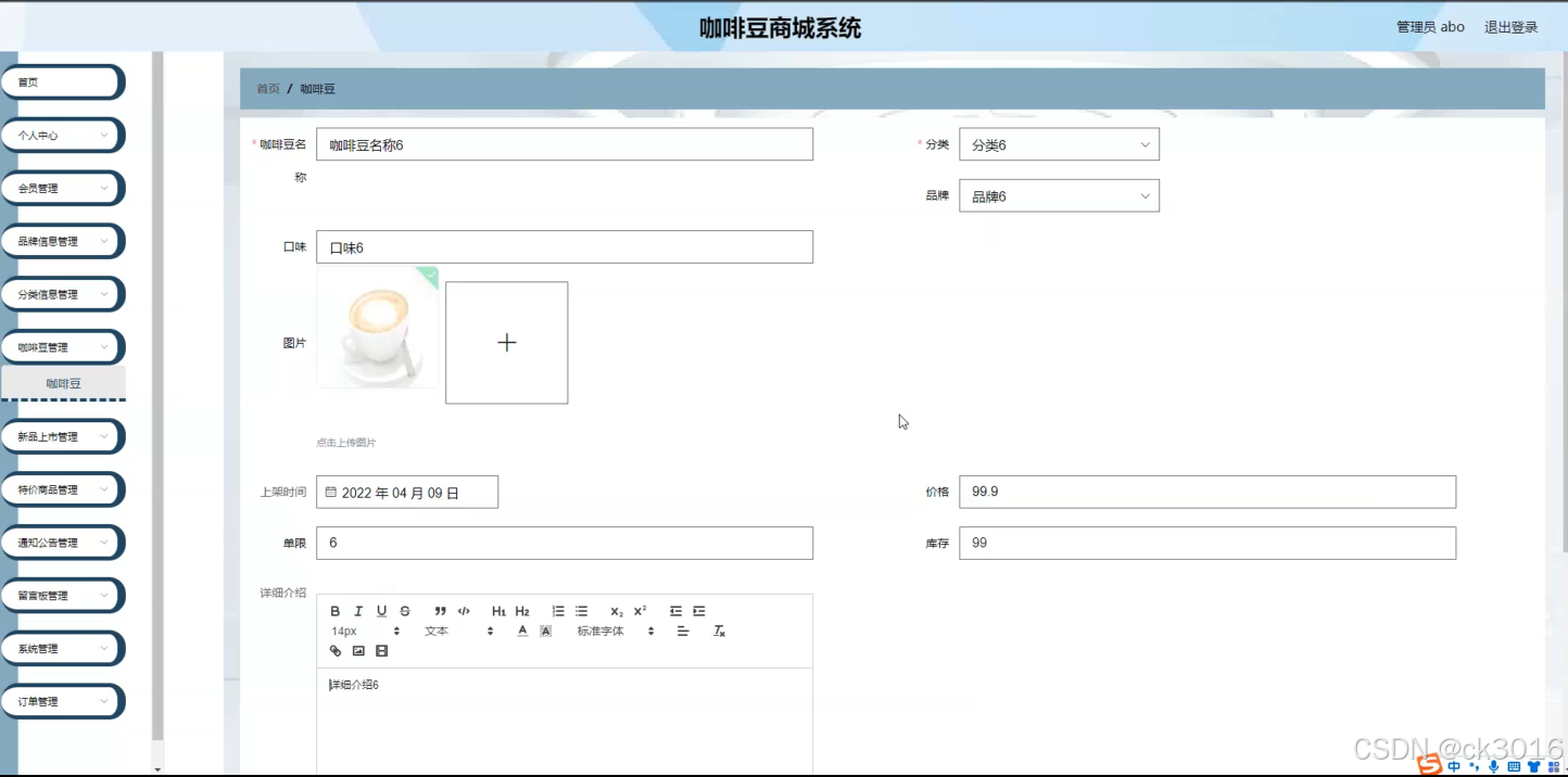 系统内容:会员,品牌信息,分类信息,咖啡豆,新品上市,特价商品,通知公告
