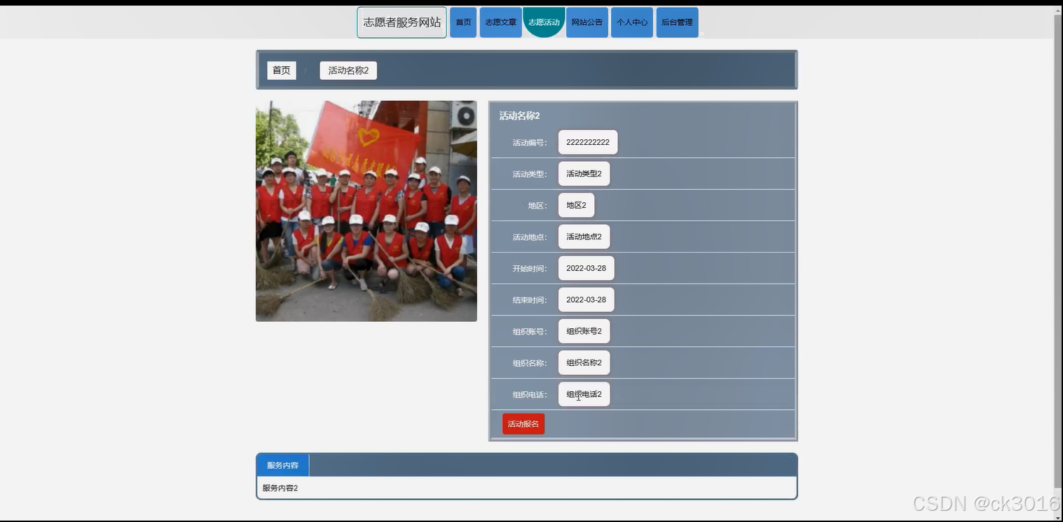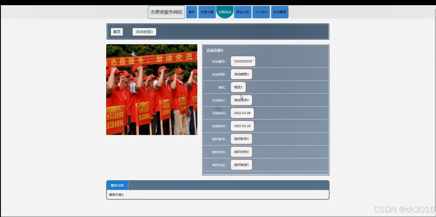 本项目旨在设计并实现一个功能全面、用户友好的志愿者服务网站vrd4s,旨在优化志愿者招募流程,提供便捷的志愿者注册与筛选功能,降低招募成本,提高招募效率;强化志愿者培训与管理,提供丰富的在线培训资源,实现志愿者信息的有效管理与跟踪;促进活动组织与交流,支持活动发布、报名、签到与反馈,搭建志愿者与活动组织者的交流平台。
