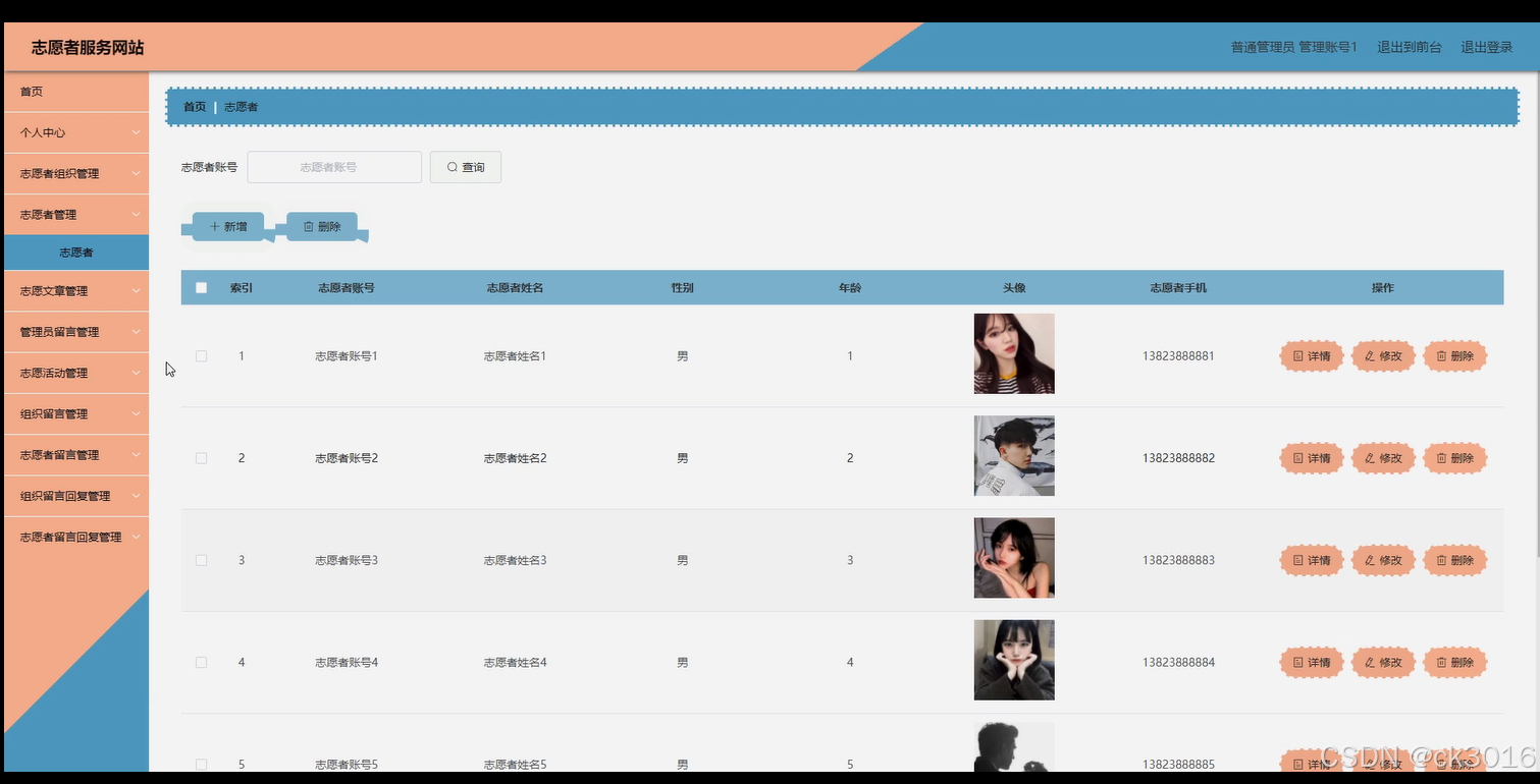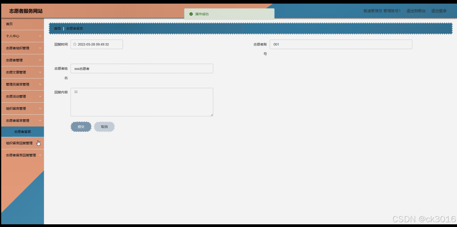 系统内容:志愿者,普通管理员,活动类型,地区,志愿文章,管理员留言,志愿活动,活动报名,志愿者留言,管理员回复,志愿者留言回复