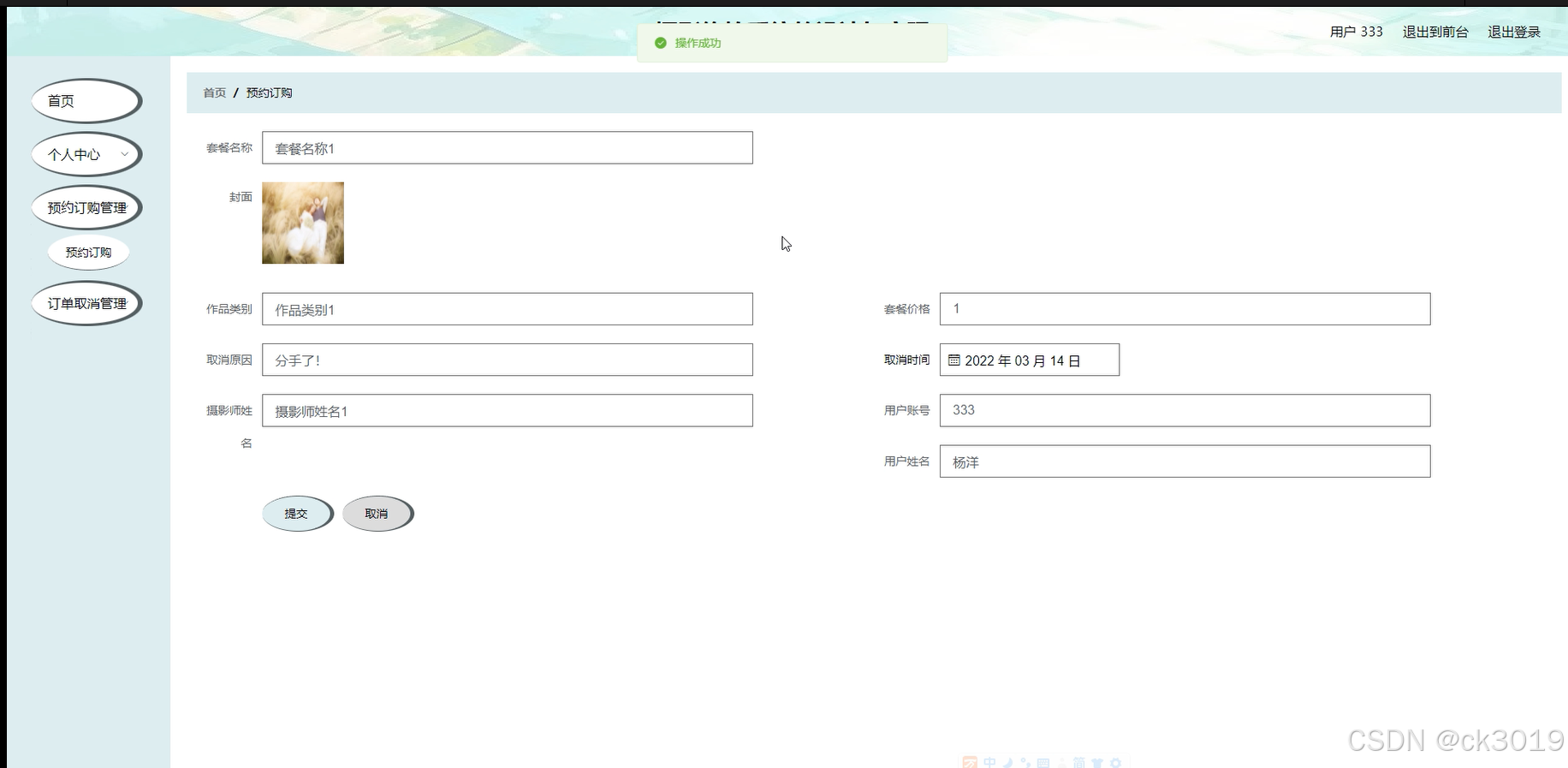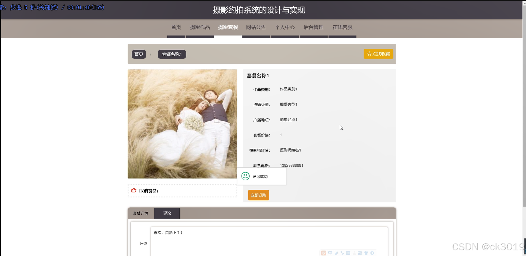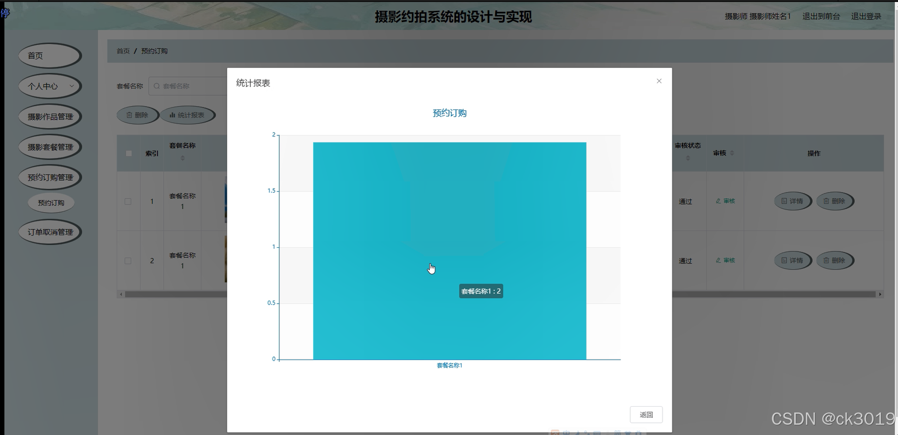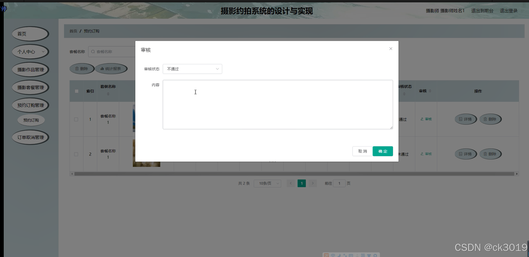 系统内容:用户,摄影师,拍摄类型,作品类别,摄影套餐,摄影作品,预约订购,订单取消