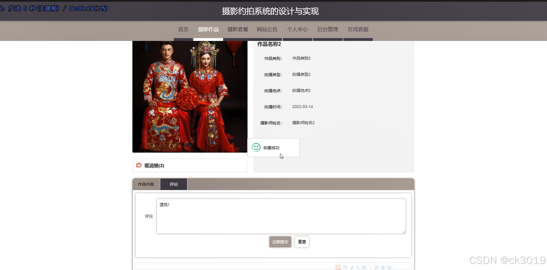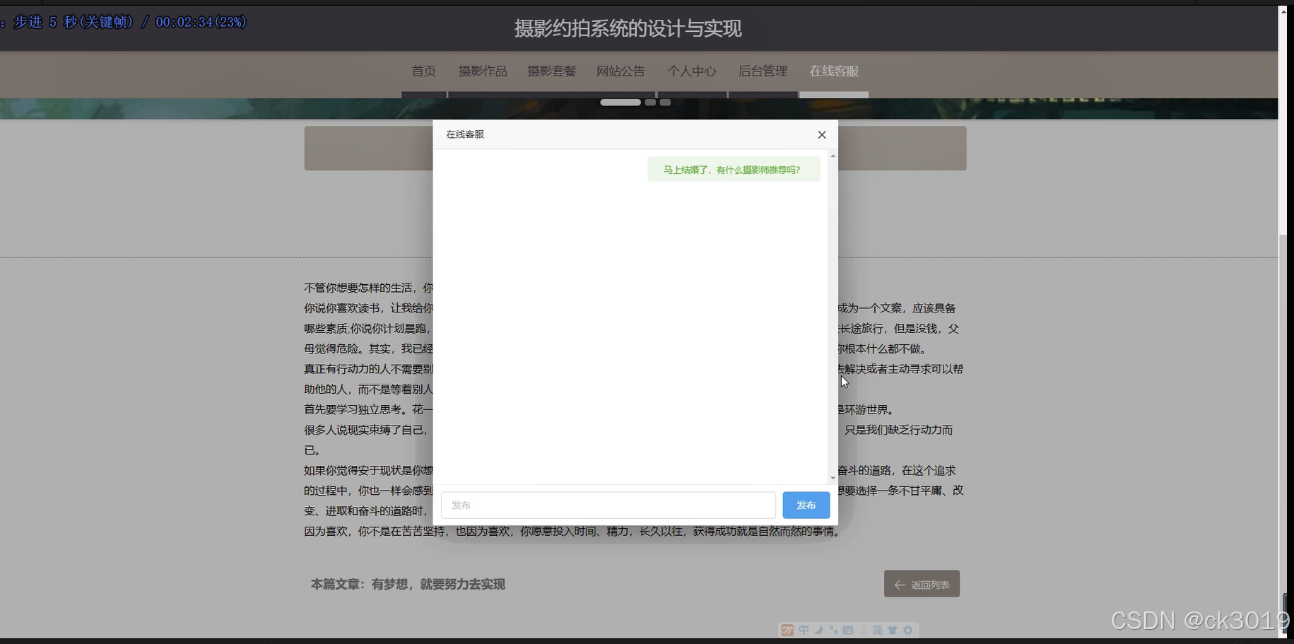 随着互联网技术的不断发展和人们审美需求的提升,摄影作为一种记录生活、表达情感的艺术形式,越来越受到大众的喜爱。然而,传统摄影服务受限于地域、信息不对称等因素,摄影师难以找到合适的拍摄对象,而需求方也难以快速匹配到符合期望的摄影师。为了打破这一壁垒,设计并实现一个基于SpringBoot的摄影约拍系统具有重要意义。该系统通过网络平台将摄影师与拍摄需求方有效连接起来,提供线上预约、交流、下单等服务,实现摄影服务的便捷化、高效化,满足市场多元化、个性化的需求。
