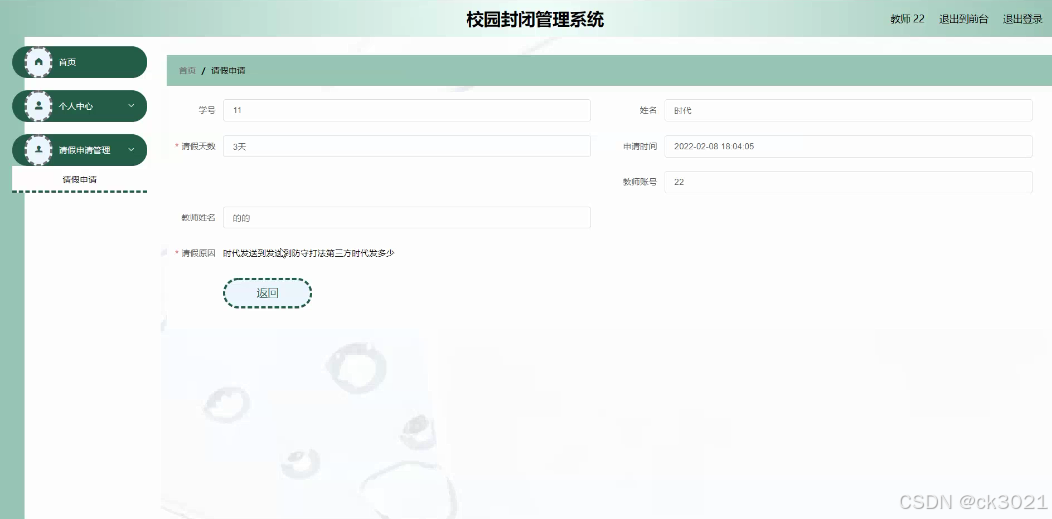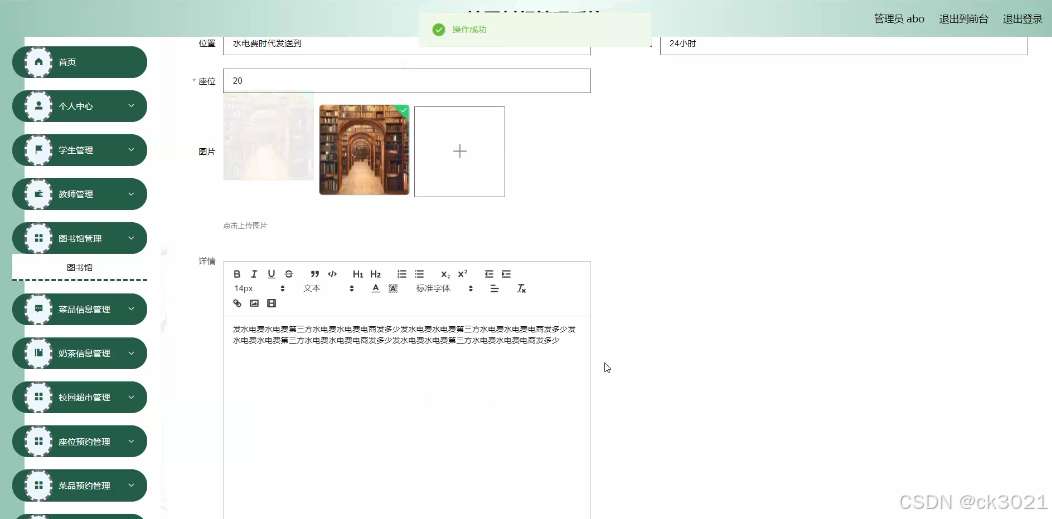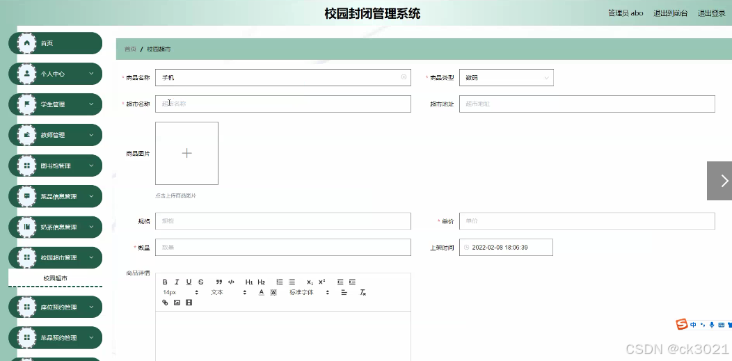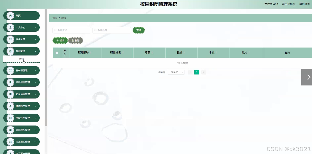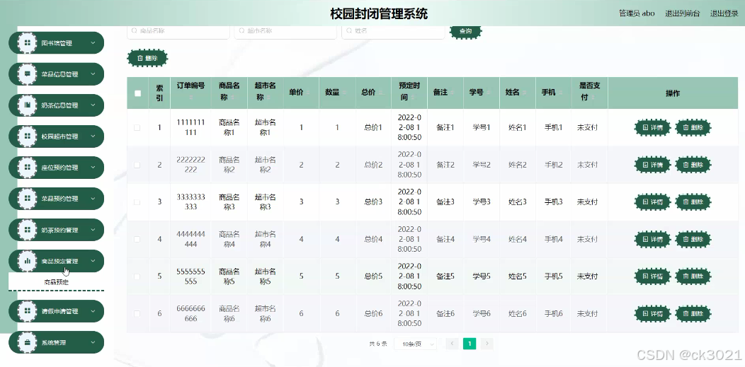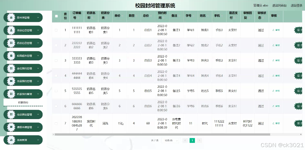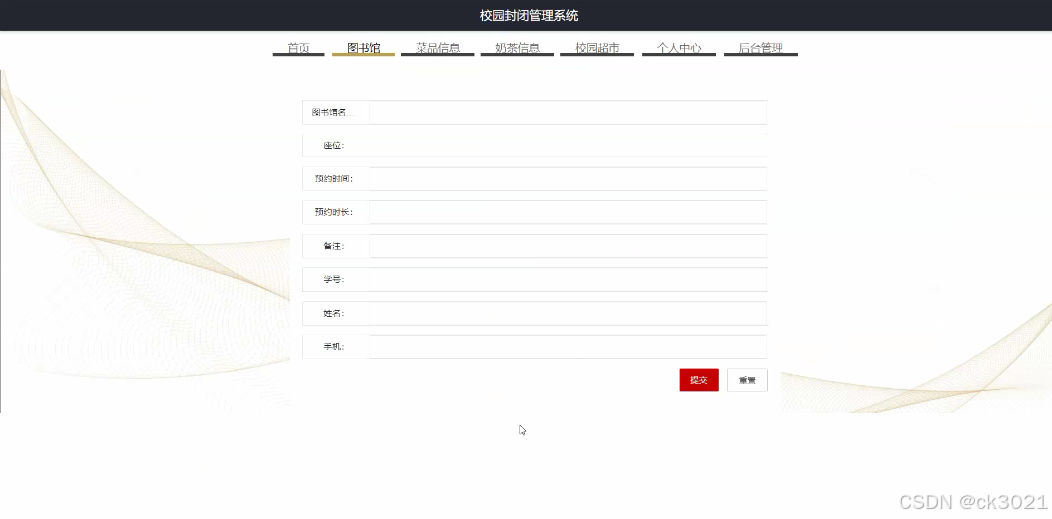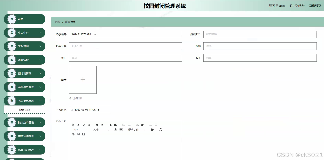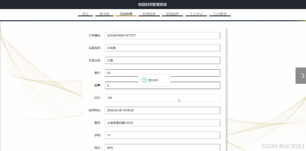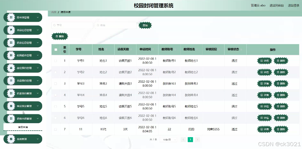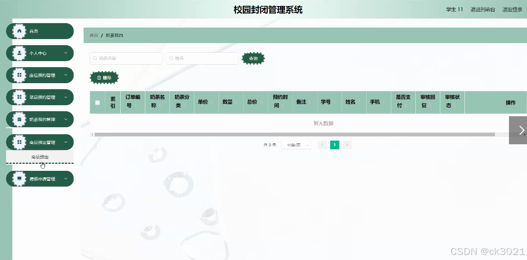 | 学生,教师,图书馆,菜品信息,奶茶信息,校园超市,座位预约,菜品预约,奶茶预约,商品预定,请假申请 |