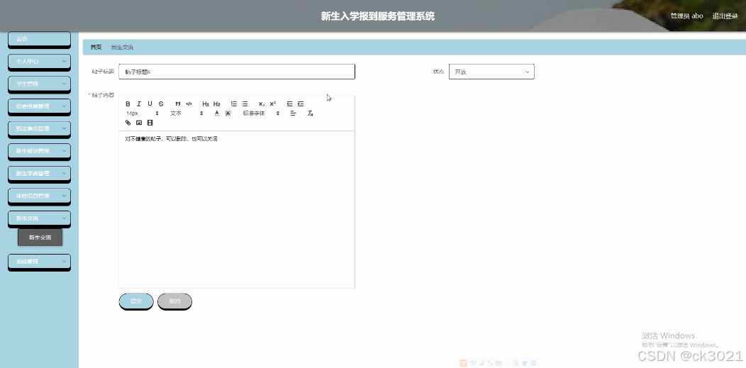 系统统一规范报到信息发布、预定宿舍、新生学费管理、体检信息管理等流程,明确操作步骤与标准,提升新生入学报到管理的专业性与规范性,增强新生与学校管理部门对系统的信任度。