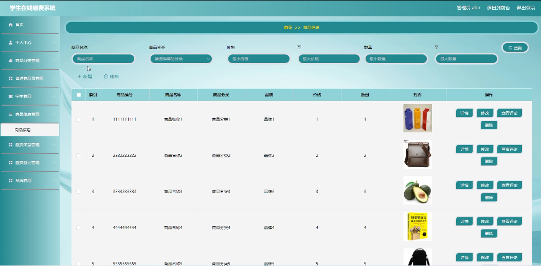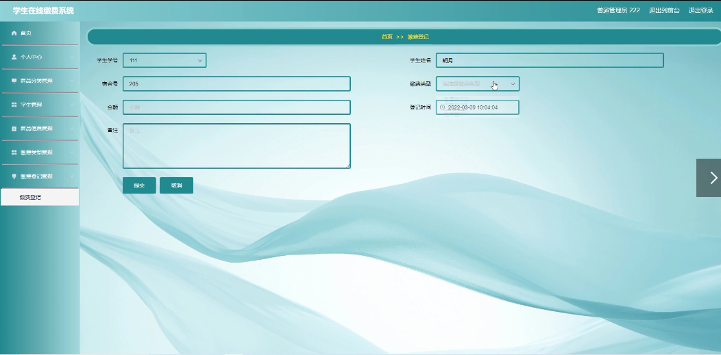 | 学生,商品信息,商品分类,缴费类型,缴费登记,普通管理员 |