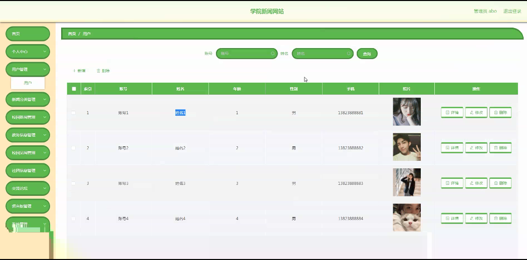 | 用户,教务信息,校园见闻,社团信息,新闻分类,校园新闻,考研信息 |