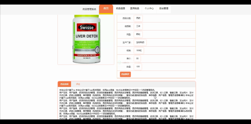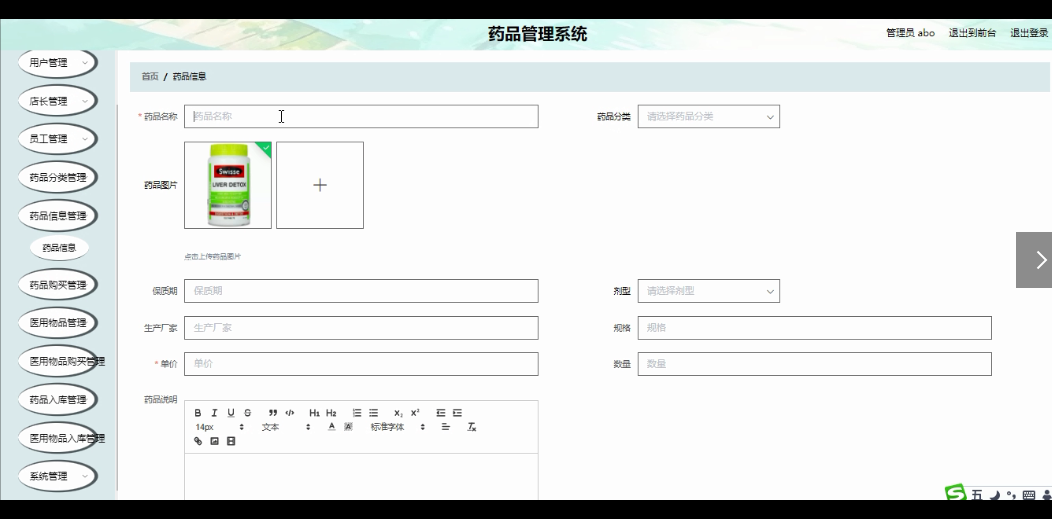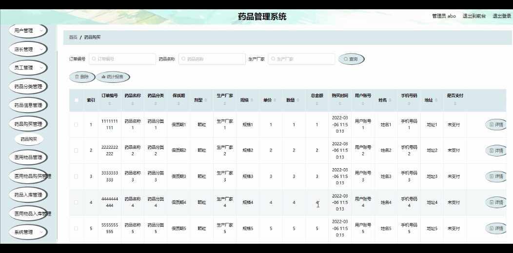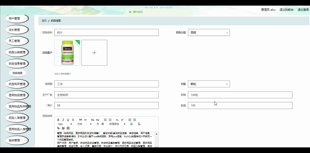 本项目旨在运用 Spring Boot 框架开发一套全面、高效的药品管理系统,深度整合用户、店长、员工、药品分类、药品信息、药品购买、医用物品、医用物品购买、药品入库、医用物品入库等关键环节。通过该系统,用户能够便捷地获取药品和医用物品信息,完成购买操作。员工能够高效管理药品和医用物品信息,准确处理入库流程,为用户提供优质服务。店长能够实时掌握各类数据,进行数据分析,为采购、库存管理和人员调度提供有力支持,全面提升药品管理系统的整体效能,提高药品和医用物品管理的准确性与效率,保障药店及相关医疗场所的正常运营。