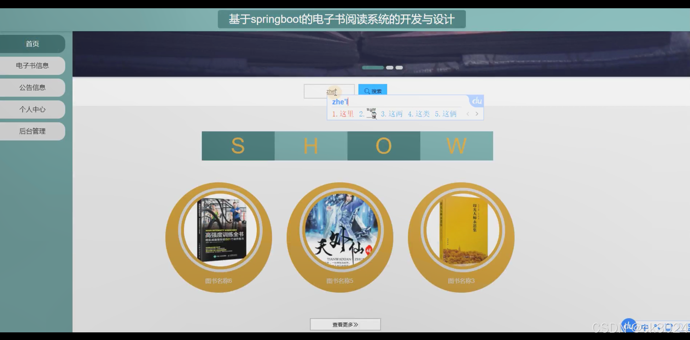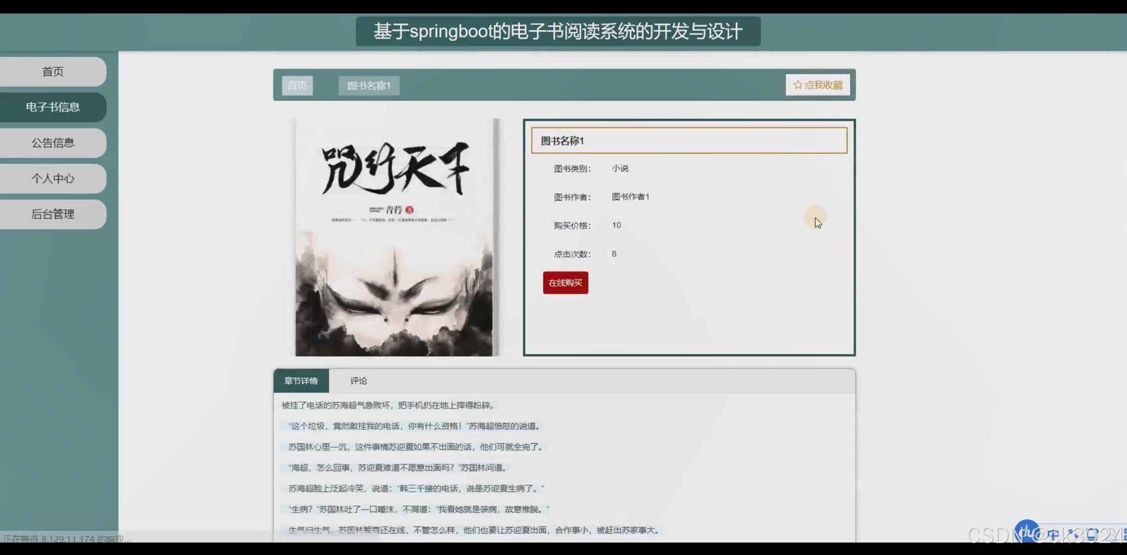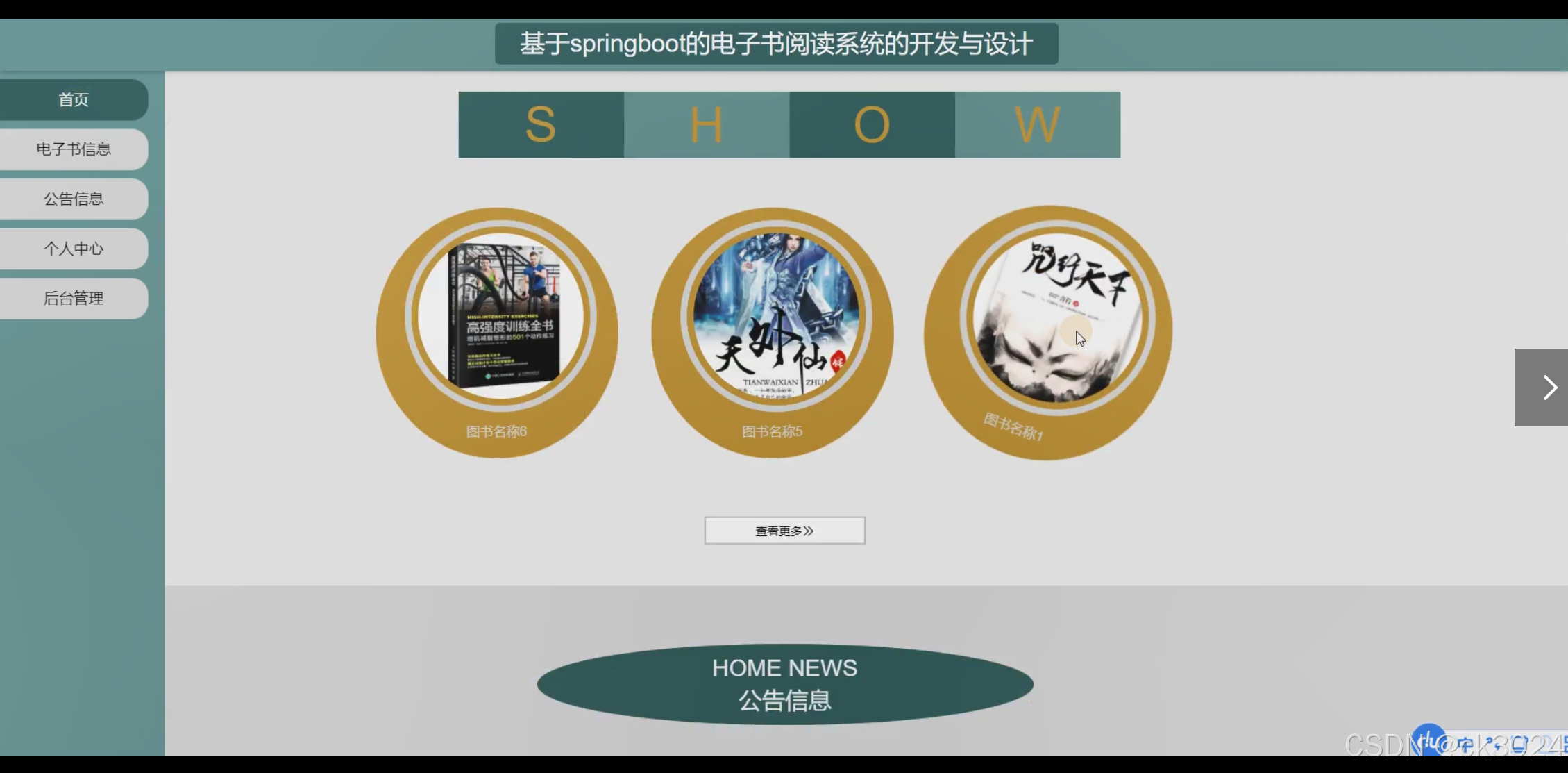 - 成功开发基于 Springboot 的电子书阅读系统,实现电子书阅读高效管理与用户便捷使用,显著提升电子书阅读系统的运行效率与用户体验。为用户提供优质的电子书阅读平台,为数字出版从业者创造良好的销售与管理环境。