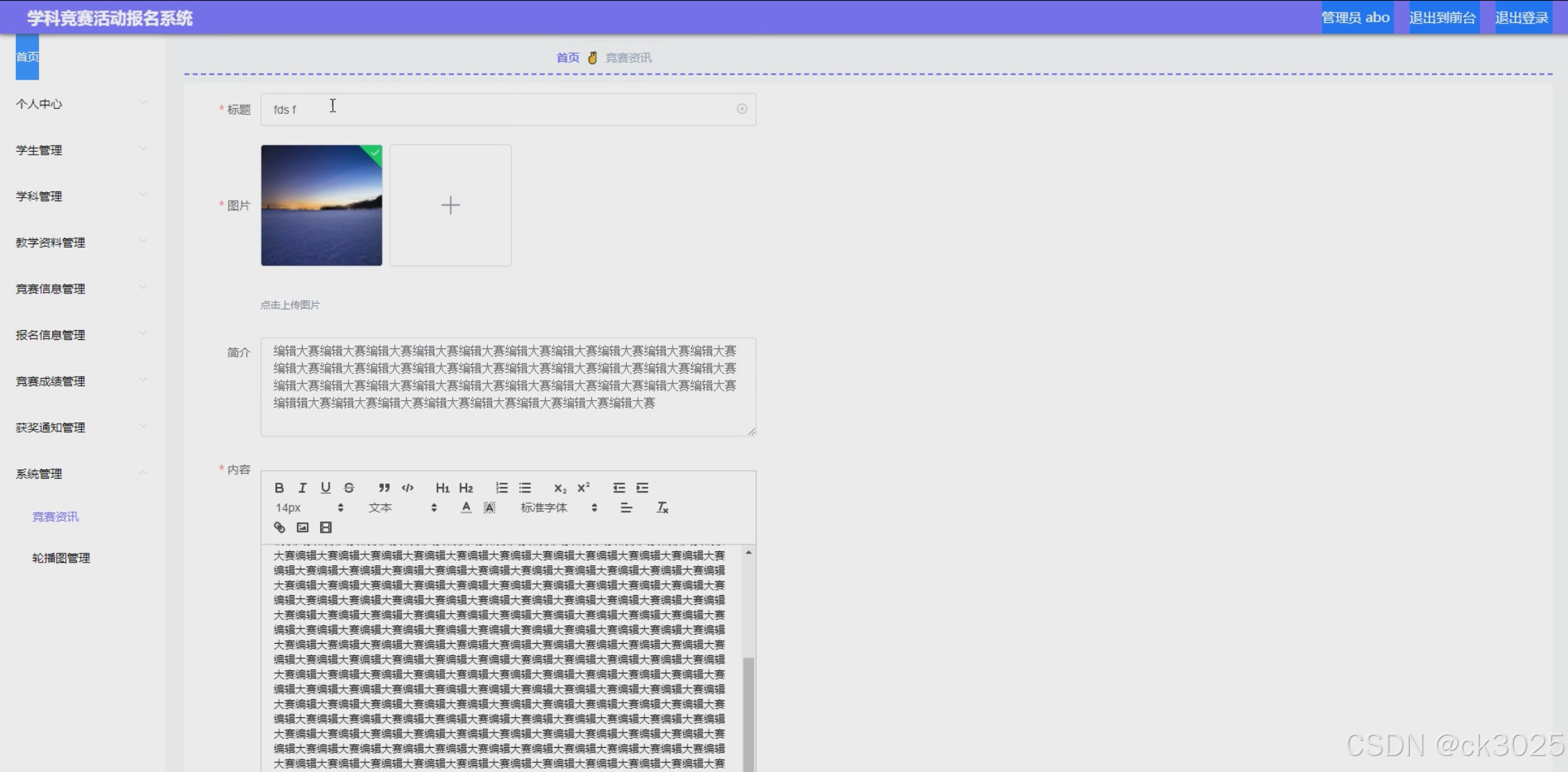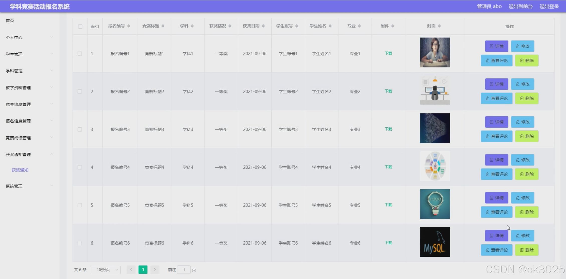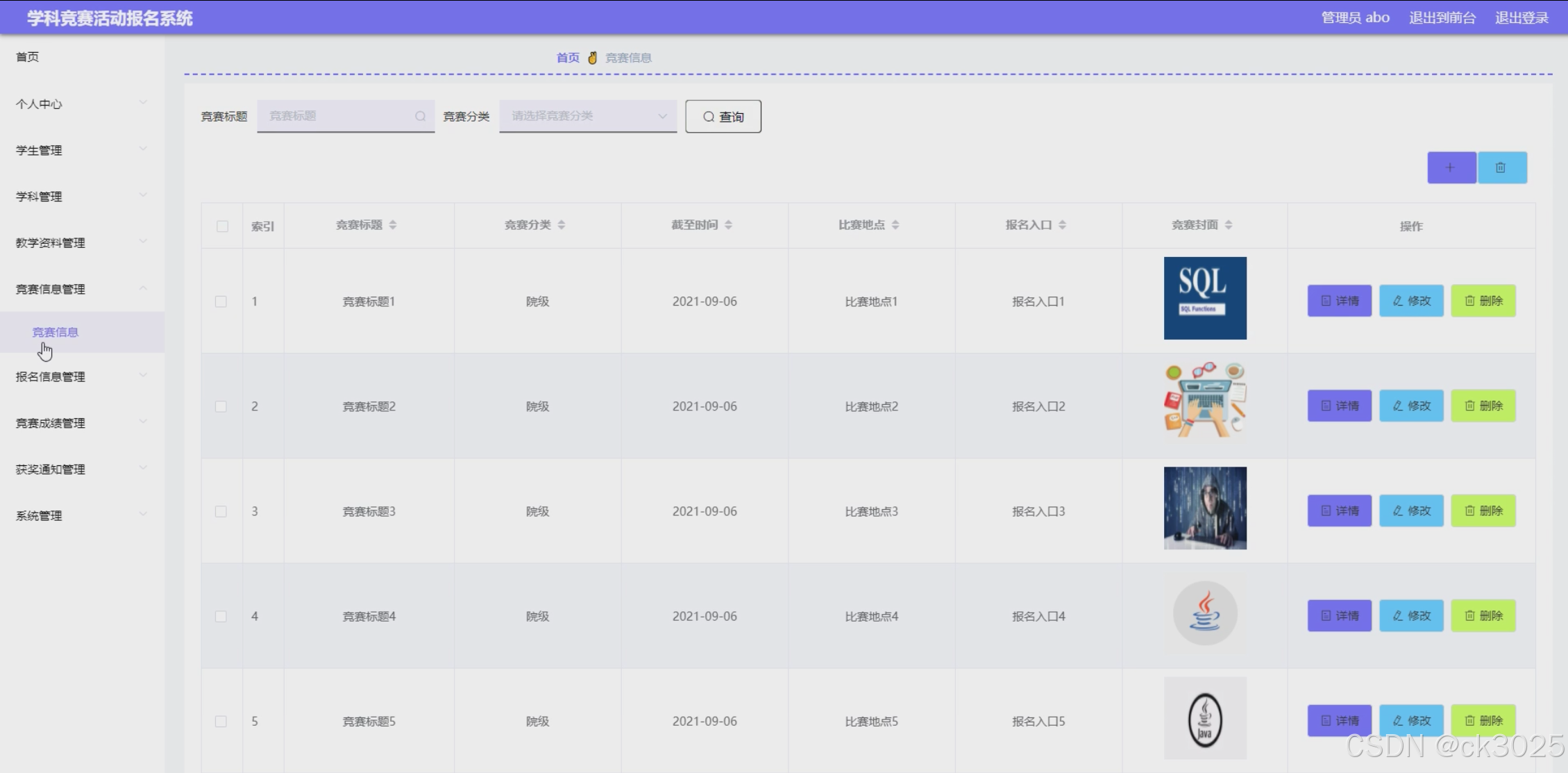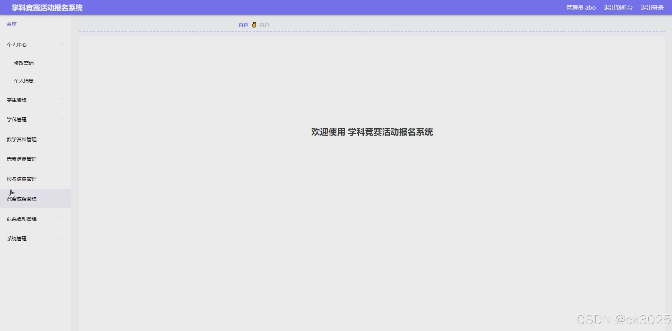 本系统旨在为学生、教师及管理人员提供一个便捷、高效、全面的竞赛活动报名平台。主要功能包括学生信息管理、学科资料查阅、竞赛信息发布、在线报名、竞赛成绩及获奖信息公示等,旨在提升竞赛活动的参与度、透明度与公正性。