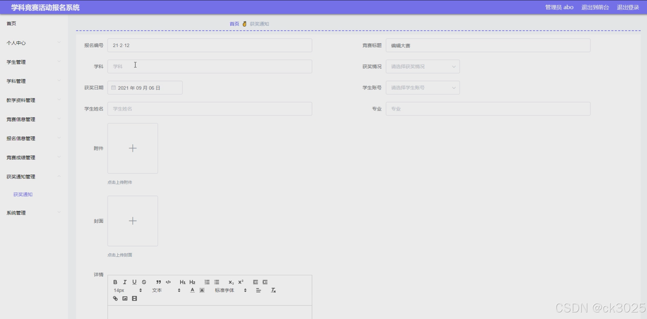 - 竞赛成绩与获奖信息管理:管理员录入并公示学生的竞赛成绩及获奖情况。