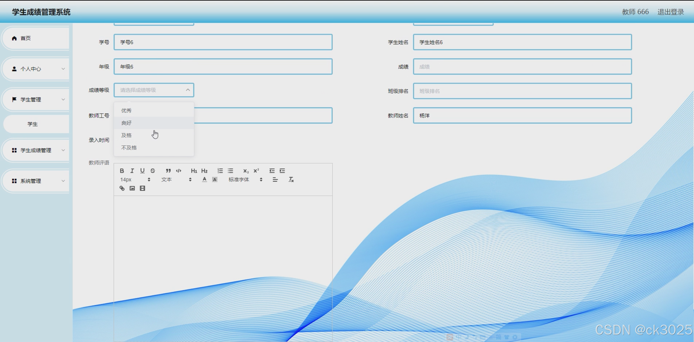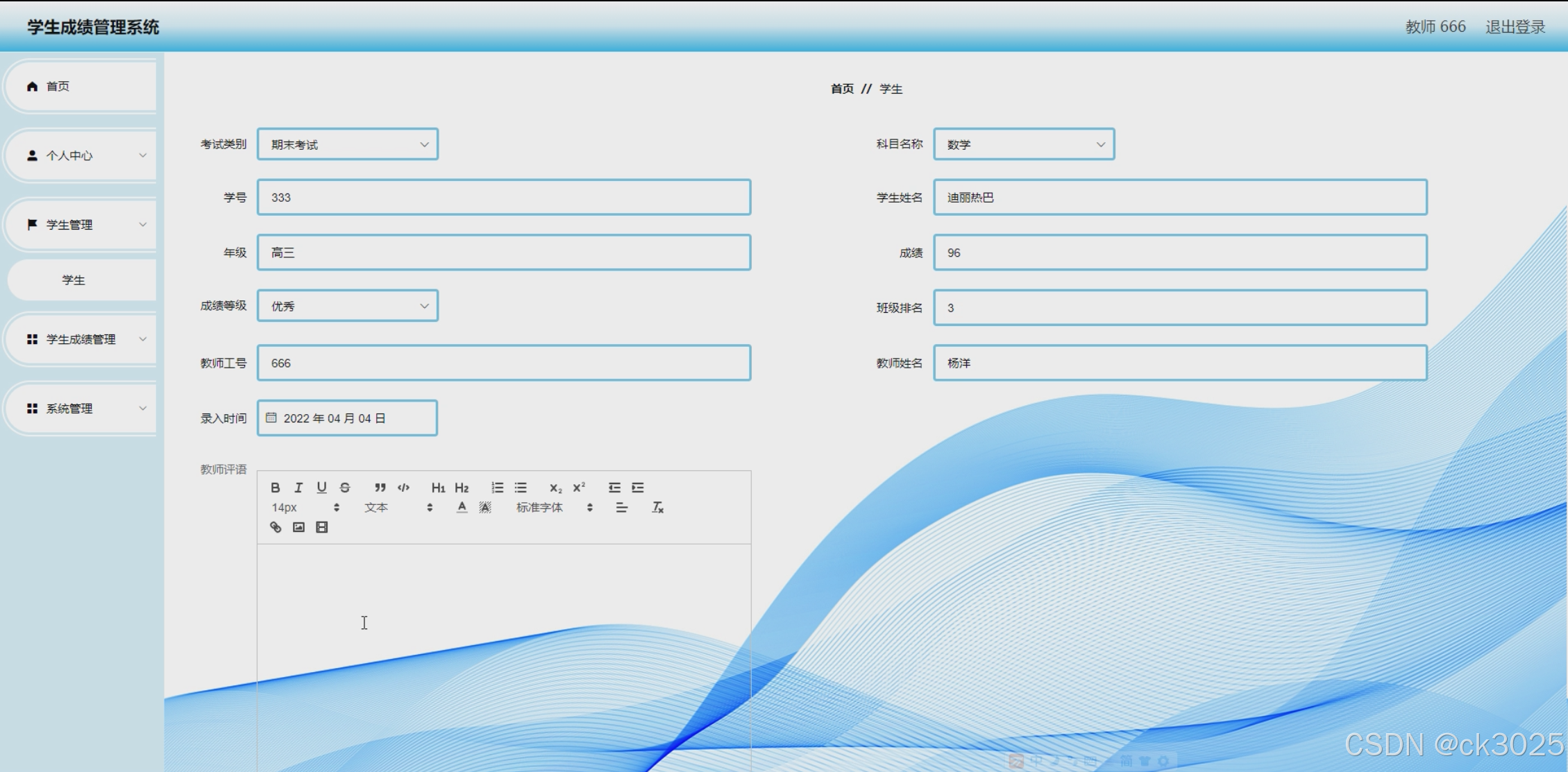 - 成绩录入:教师可录入所授课程的考试成绩,支持批量导入与手动录入两种方式。