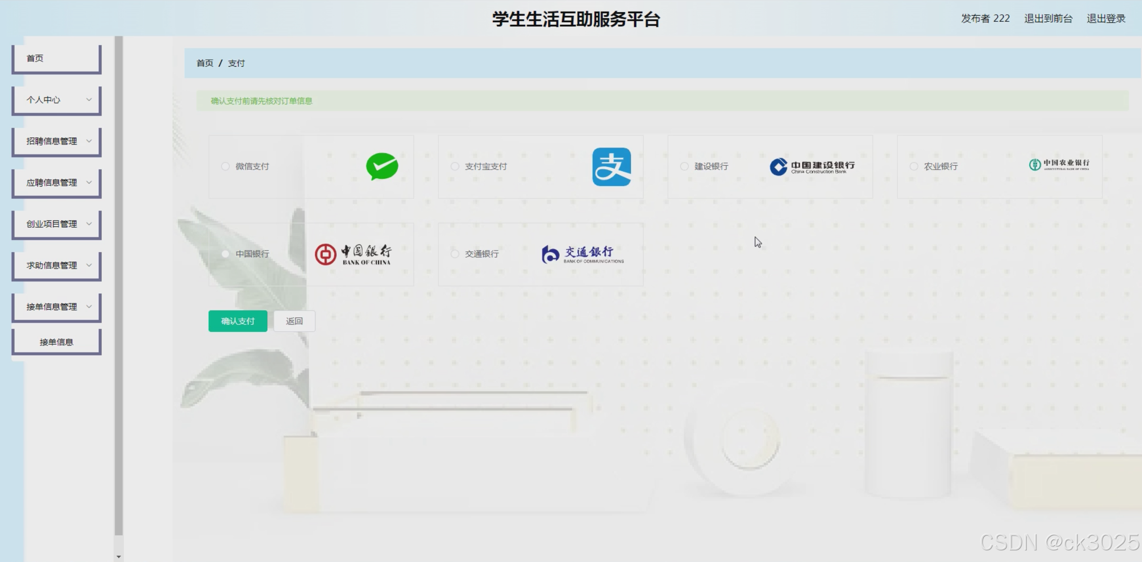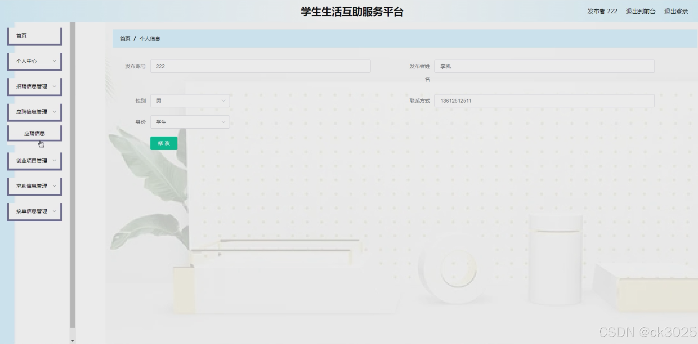 | 学生,发布者,招聘信息,应聘信息,创业项目,求助信息,接单信息 |