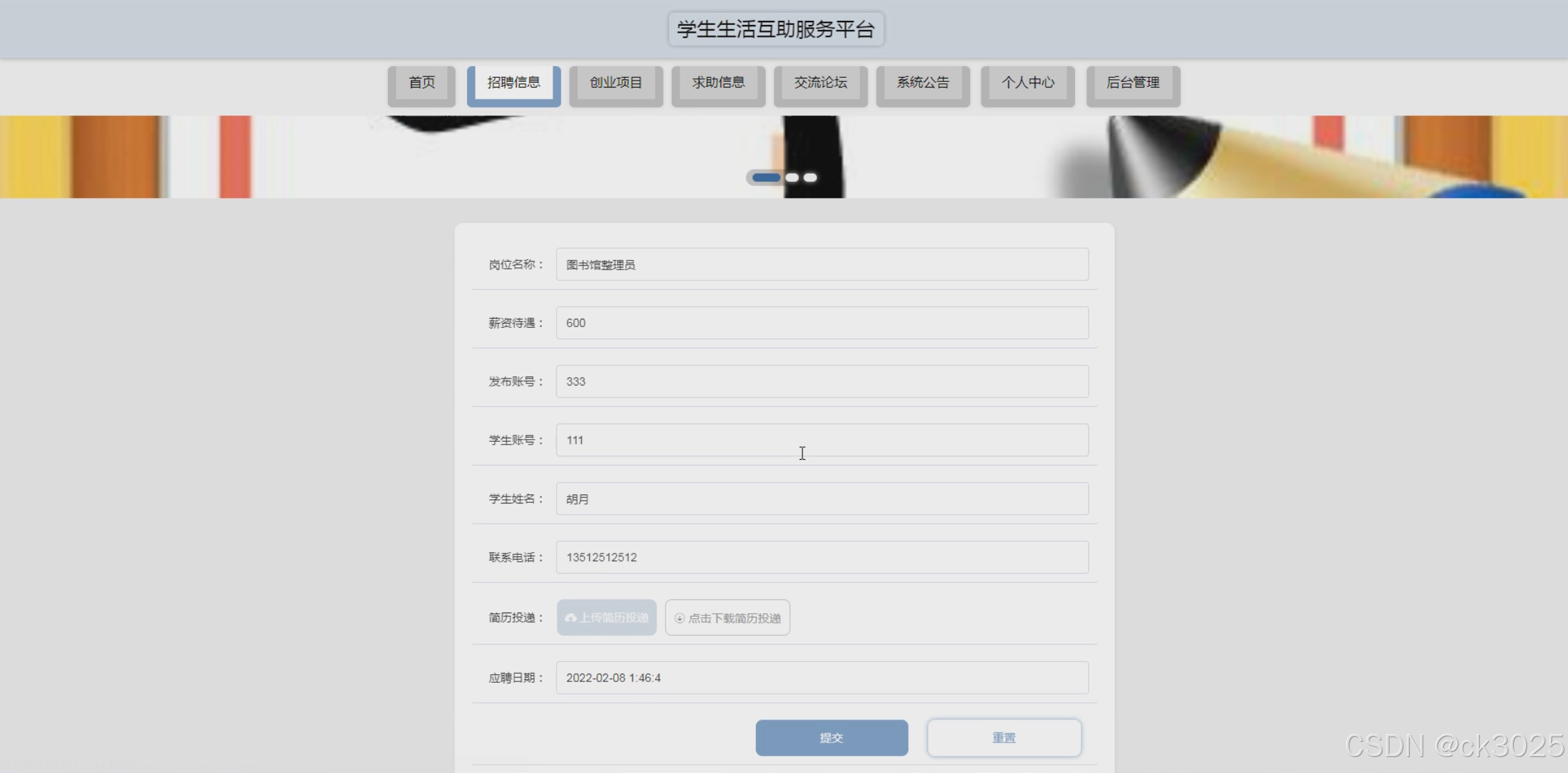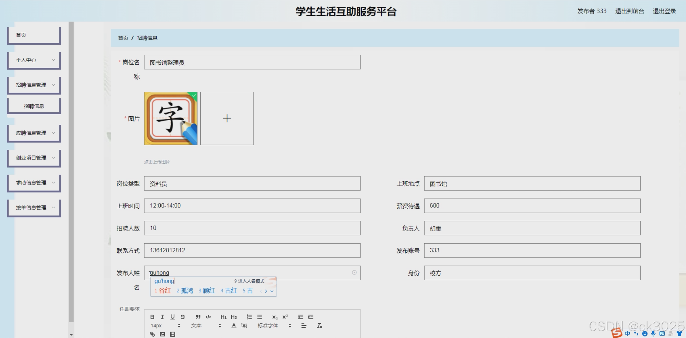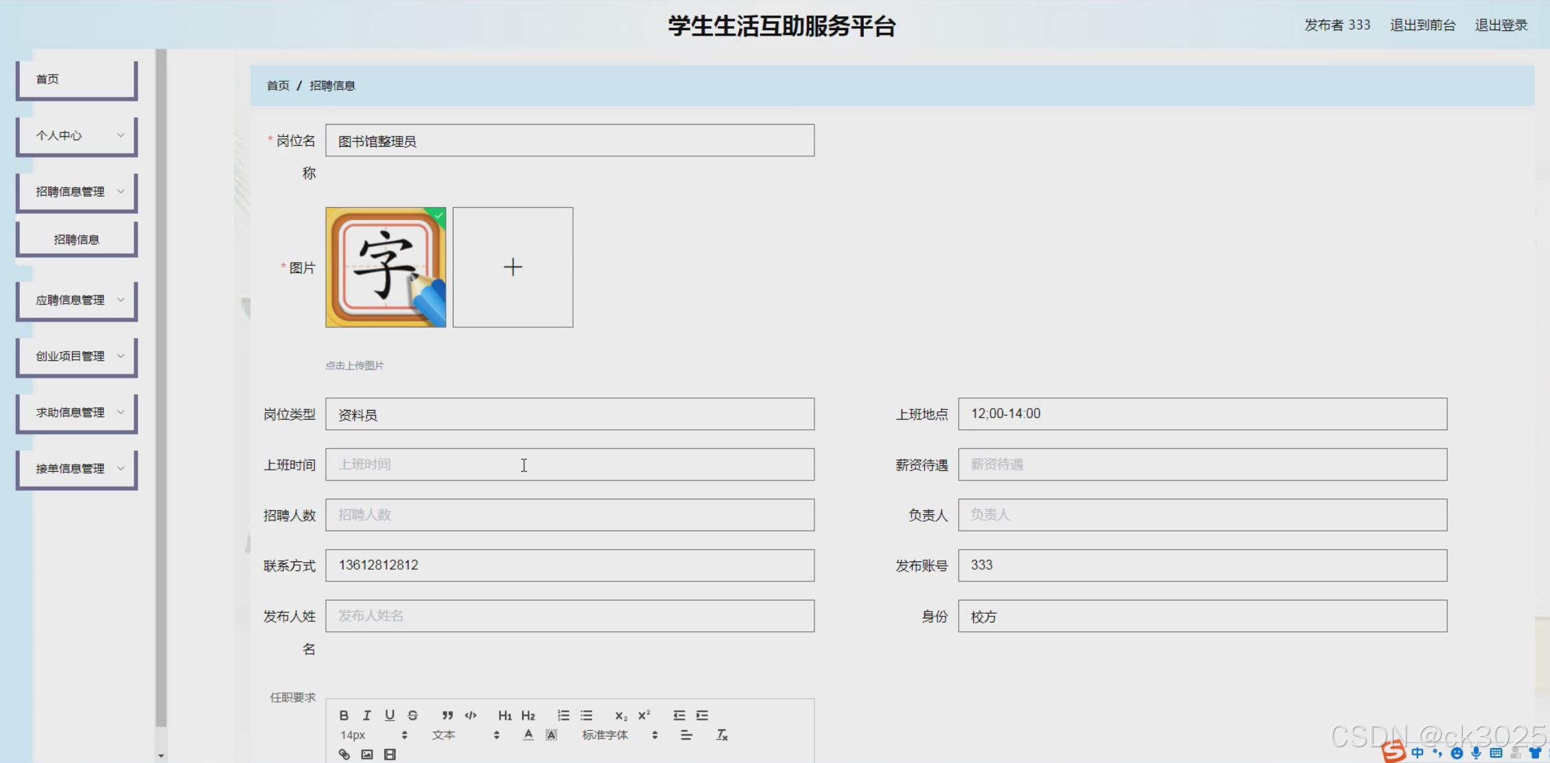 - 招聘信息:支持企业或个人发布招聘信息,包括岗位名称、工作地点、薪资待遇等,便于学生寻找合适的就业机会。