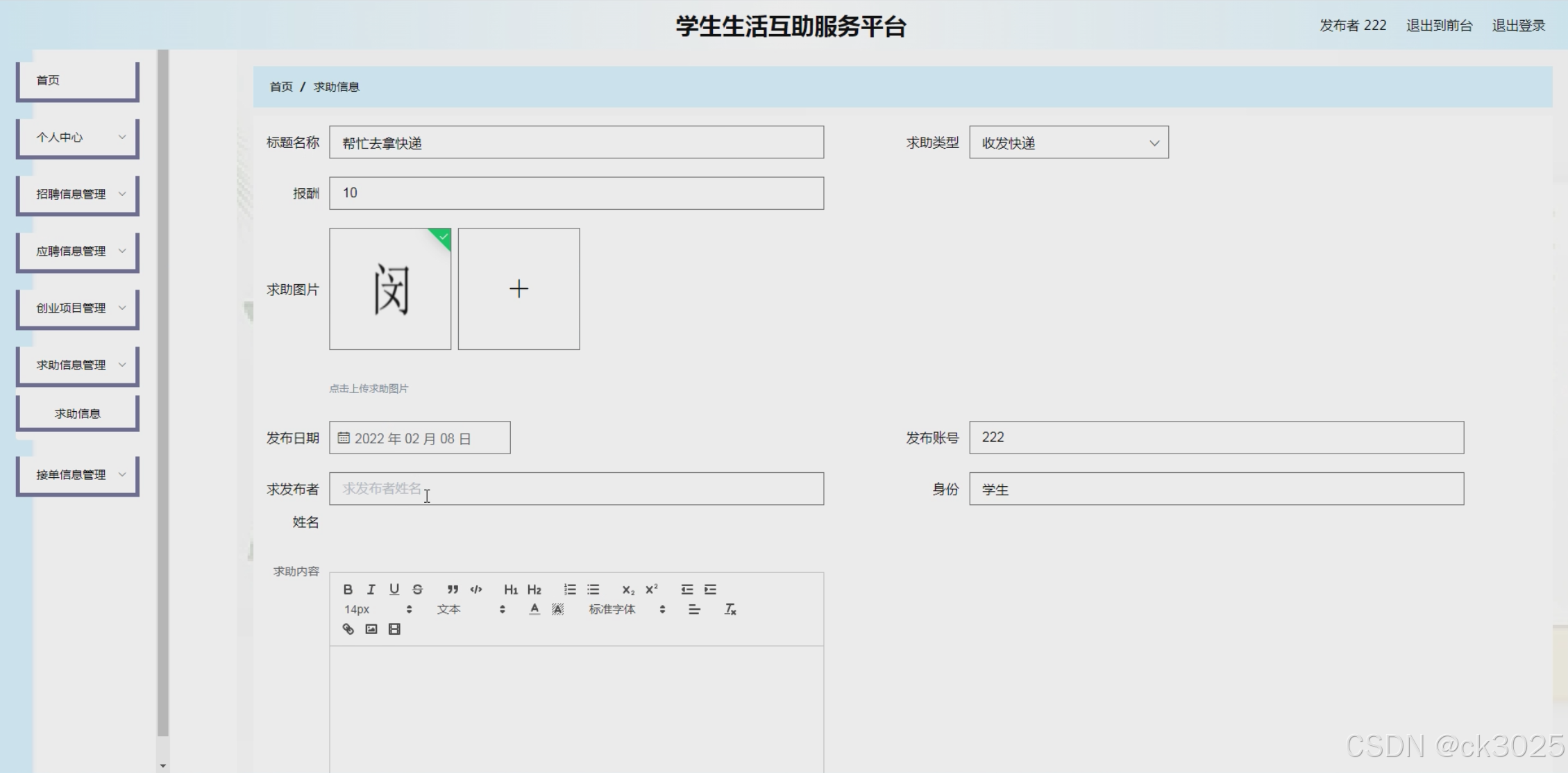 - 求助信息:支持学生发布求助信息,如寻找丢失物品、寻求学习资料等,促进同学间的互助与关怀。