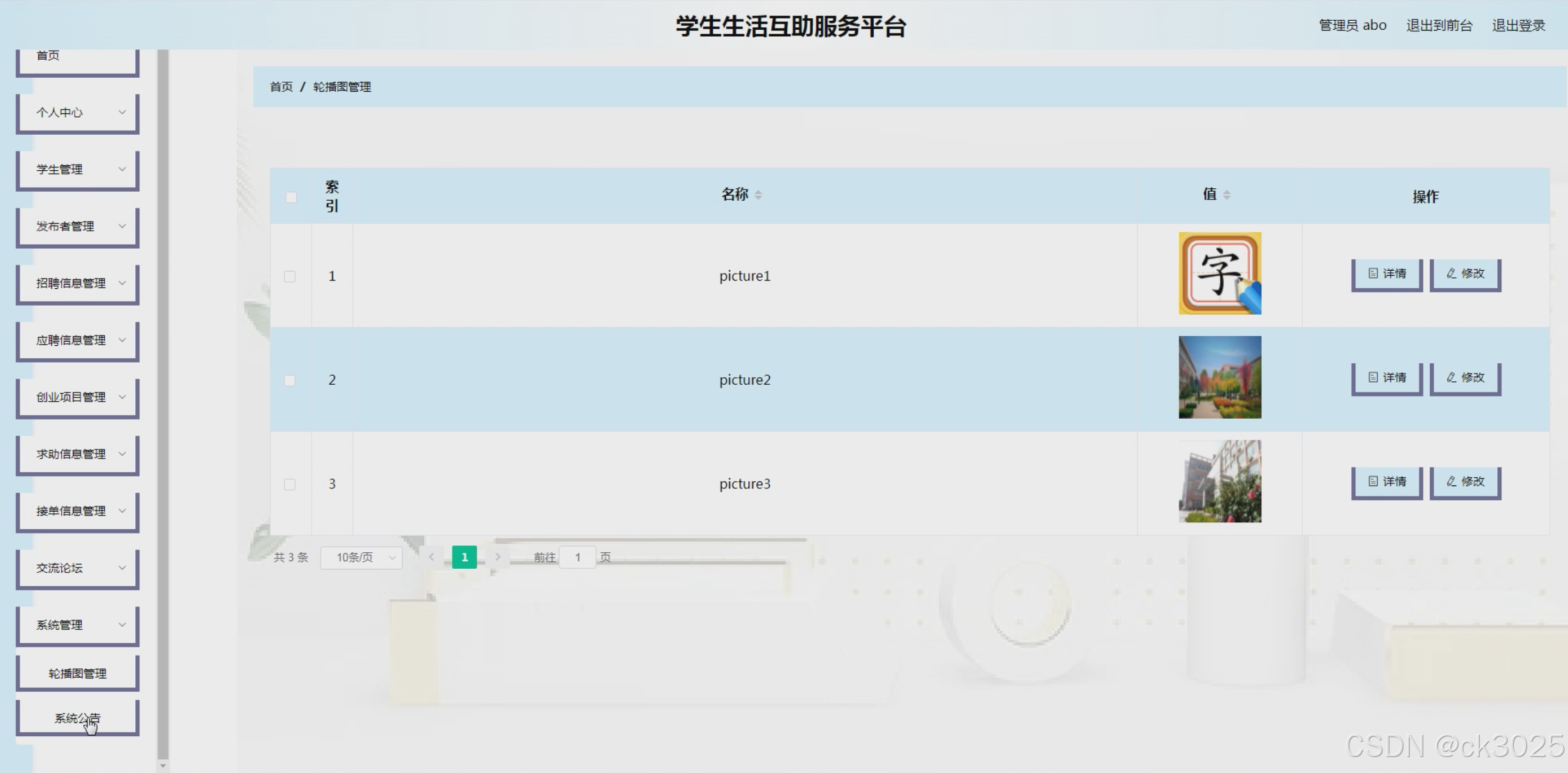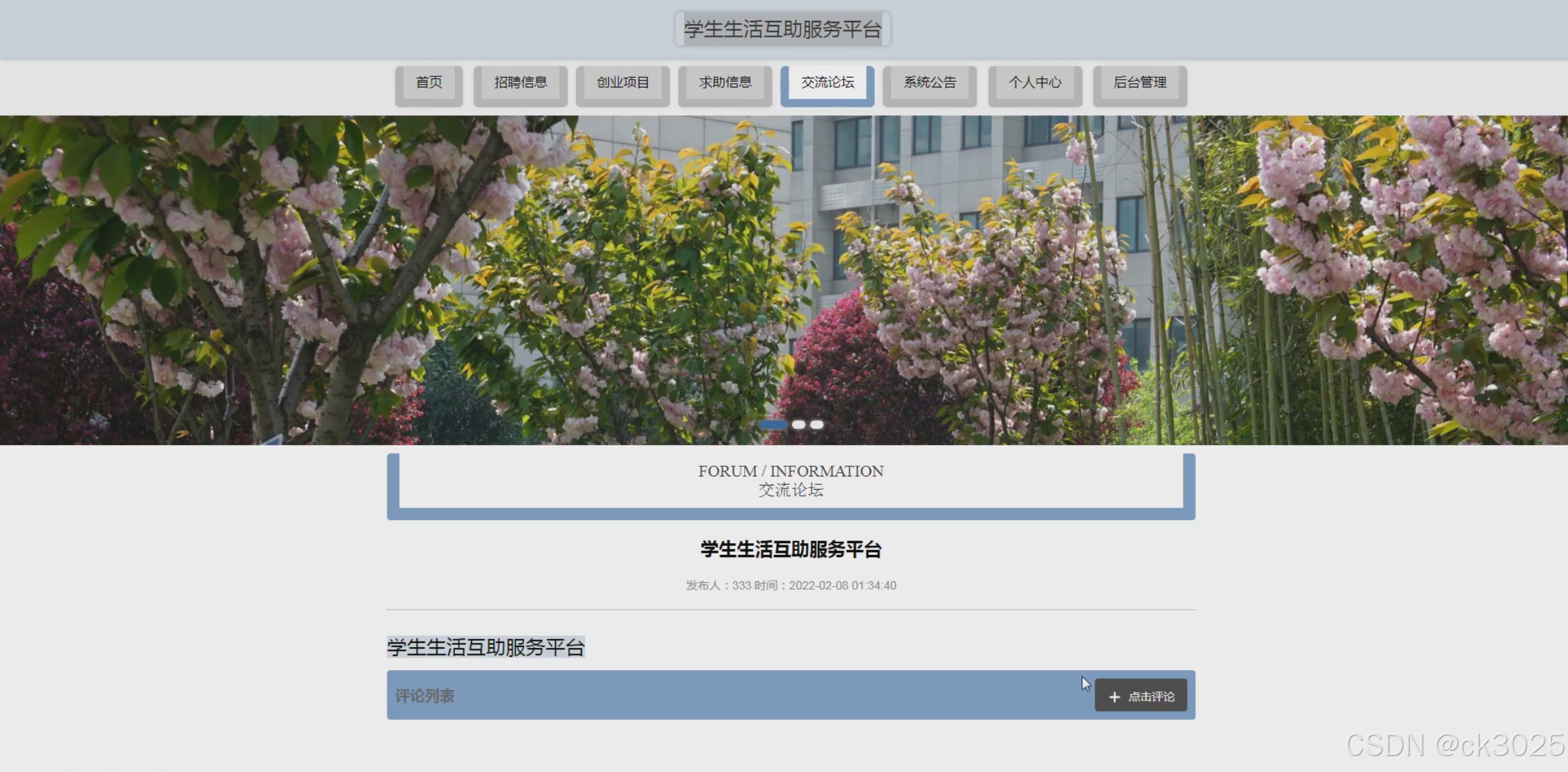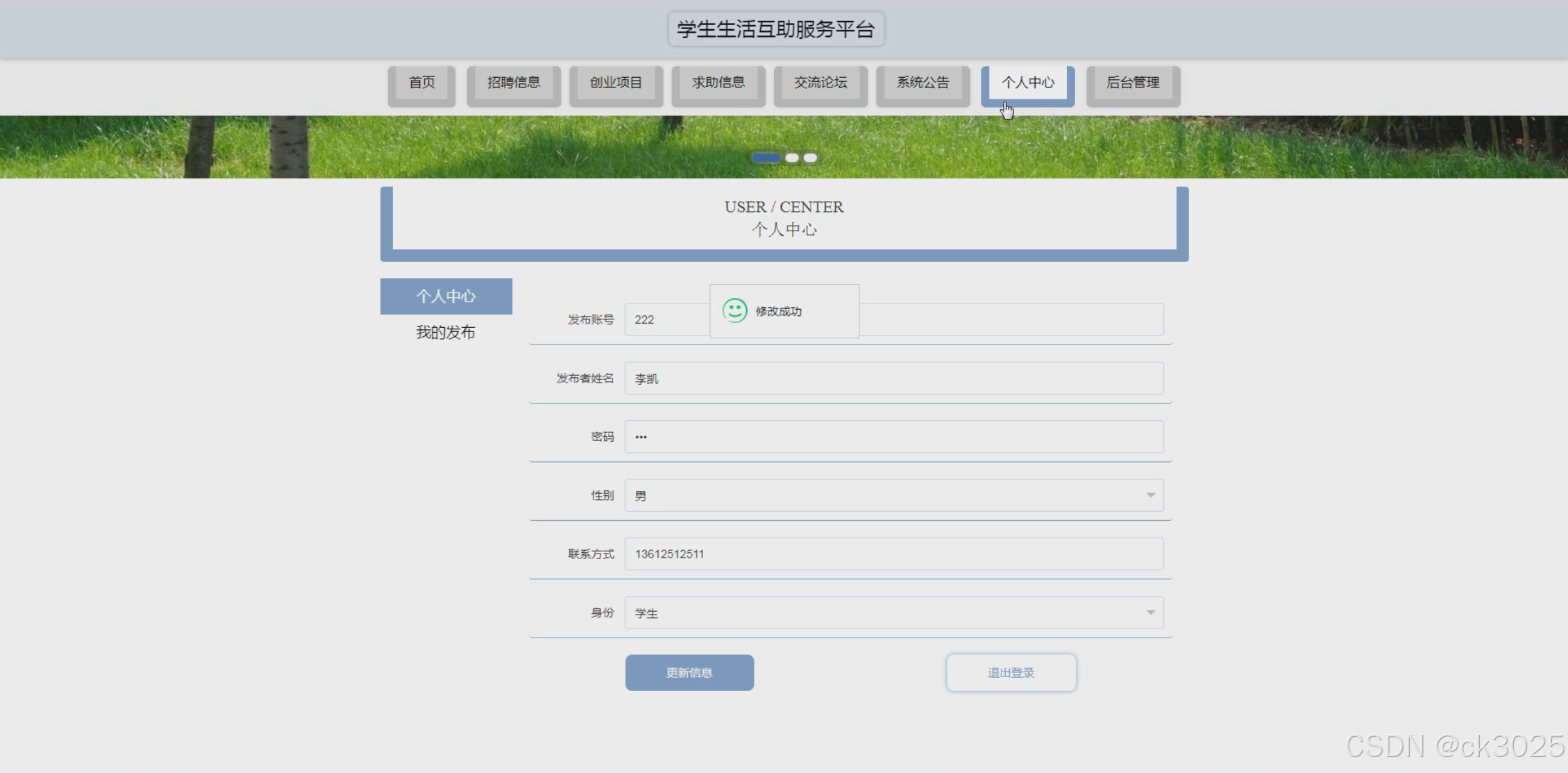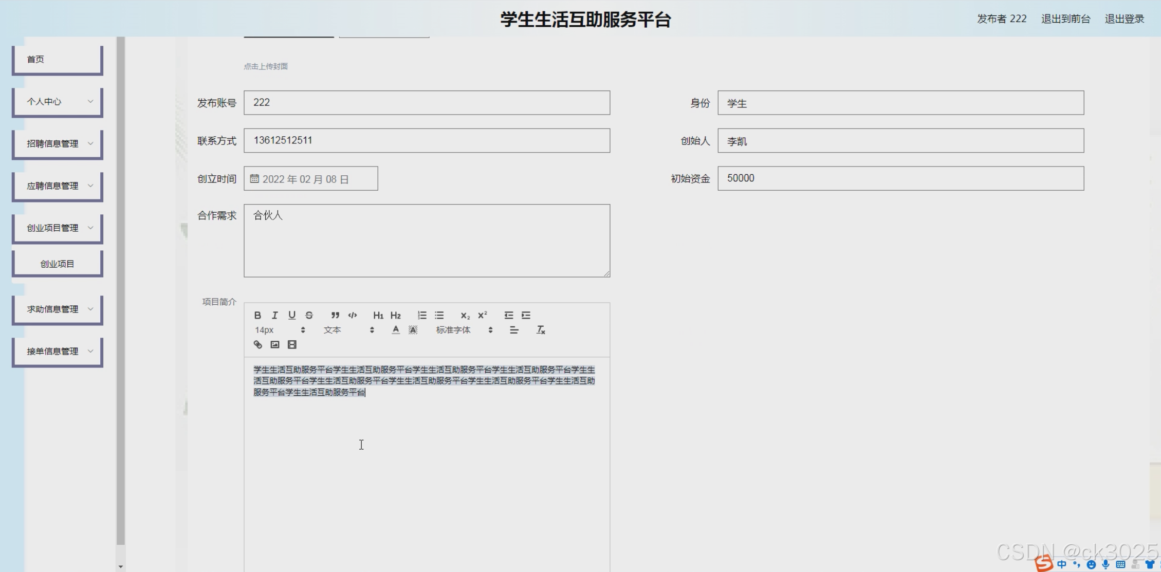 - 创业项目:展示学生的创业项目,包括项目简介、资金需求、合作方式等,为学生创业提供展示与合作的平台。