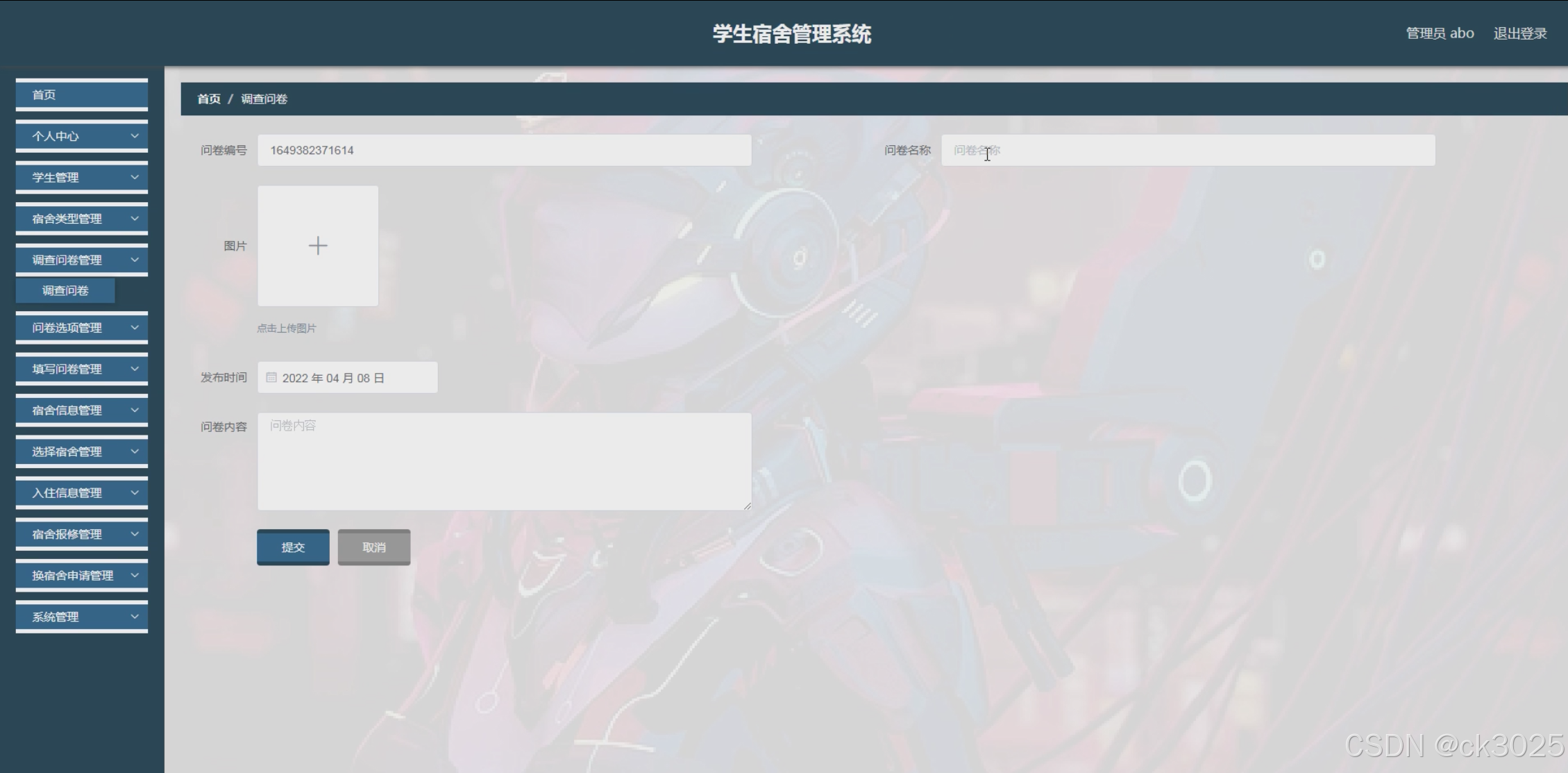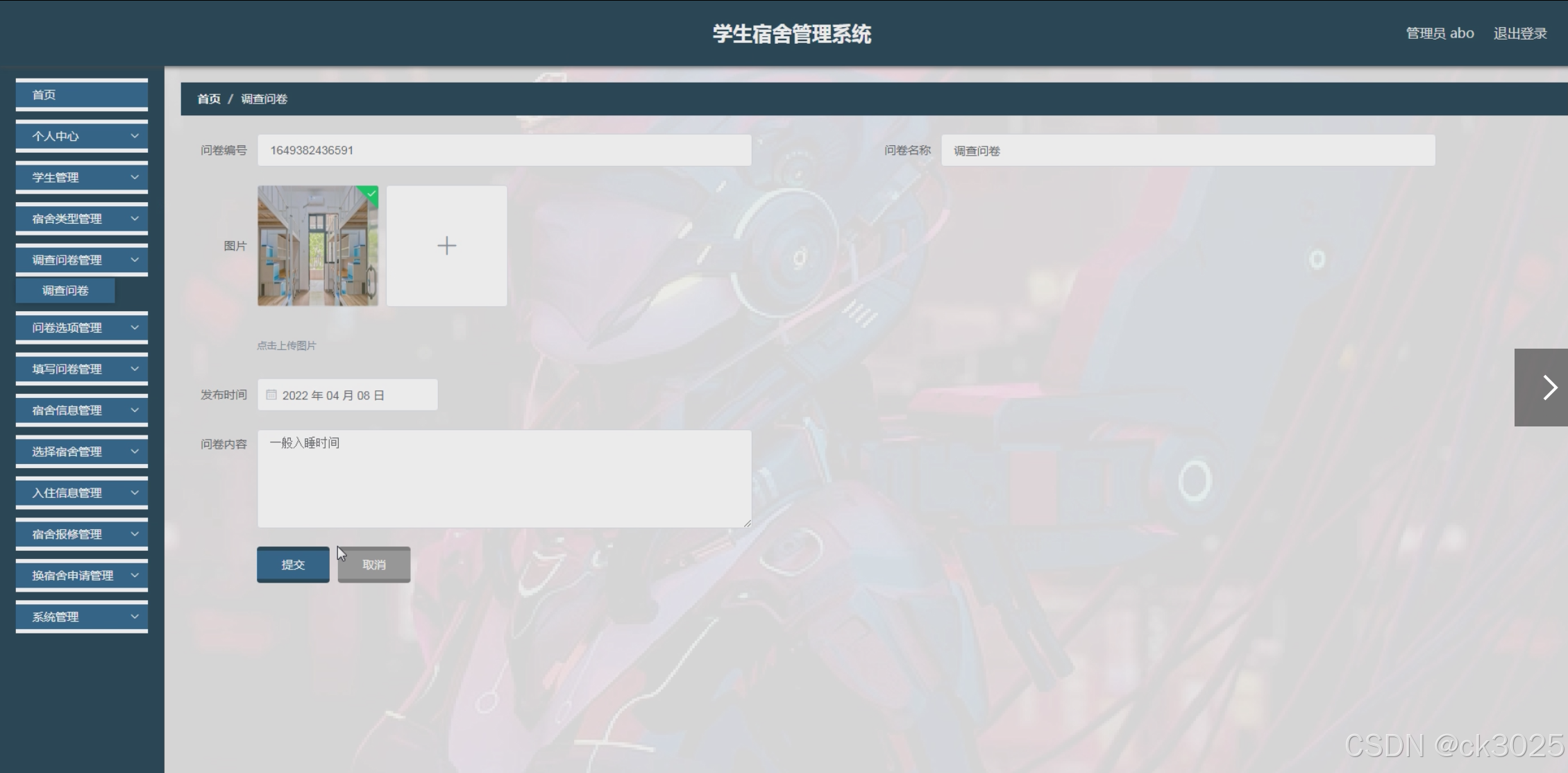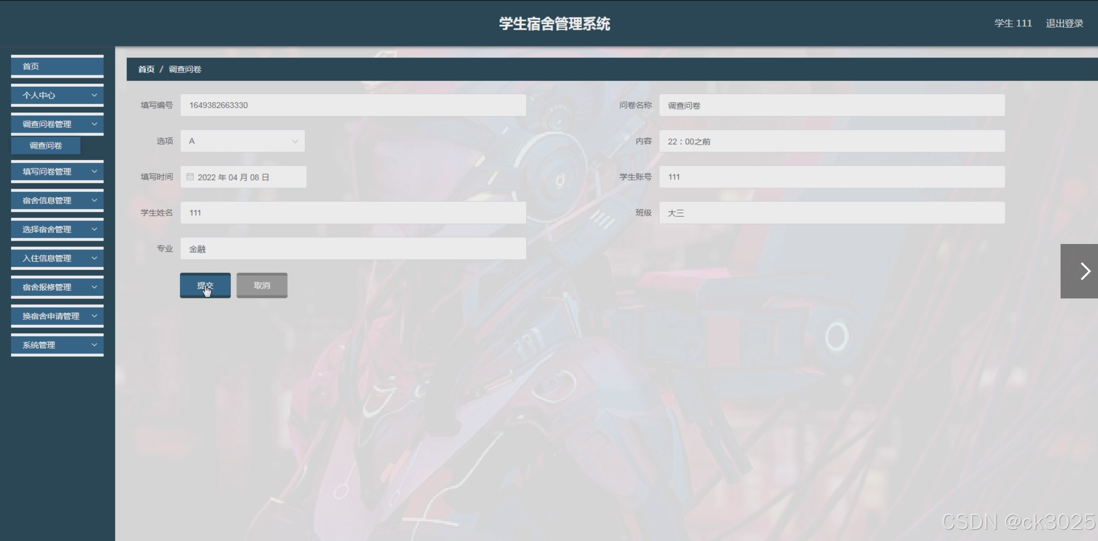 - 填写问卷:学生通过系统填写问卷,提交个人意见和建议,便于学校及时了解并解决宿舍管理中的存在问题。