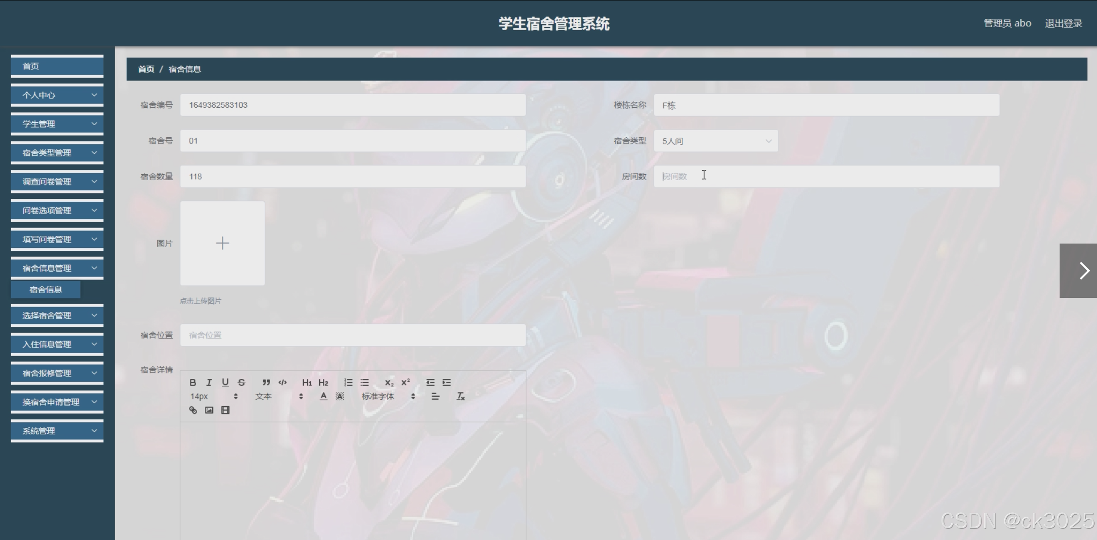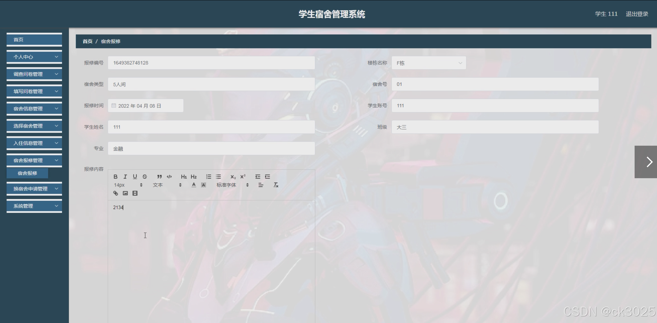 - 报修申请:学生可通过系统提交宿舍报修申请,包括报修项目、问题描述、期望解决时间等。