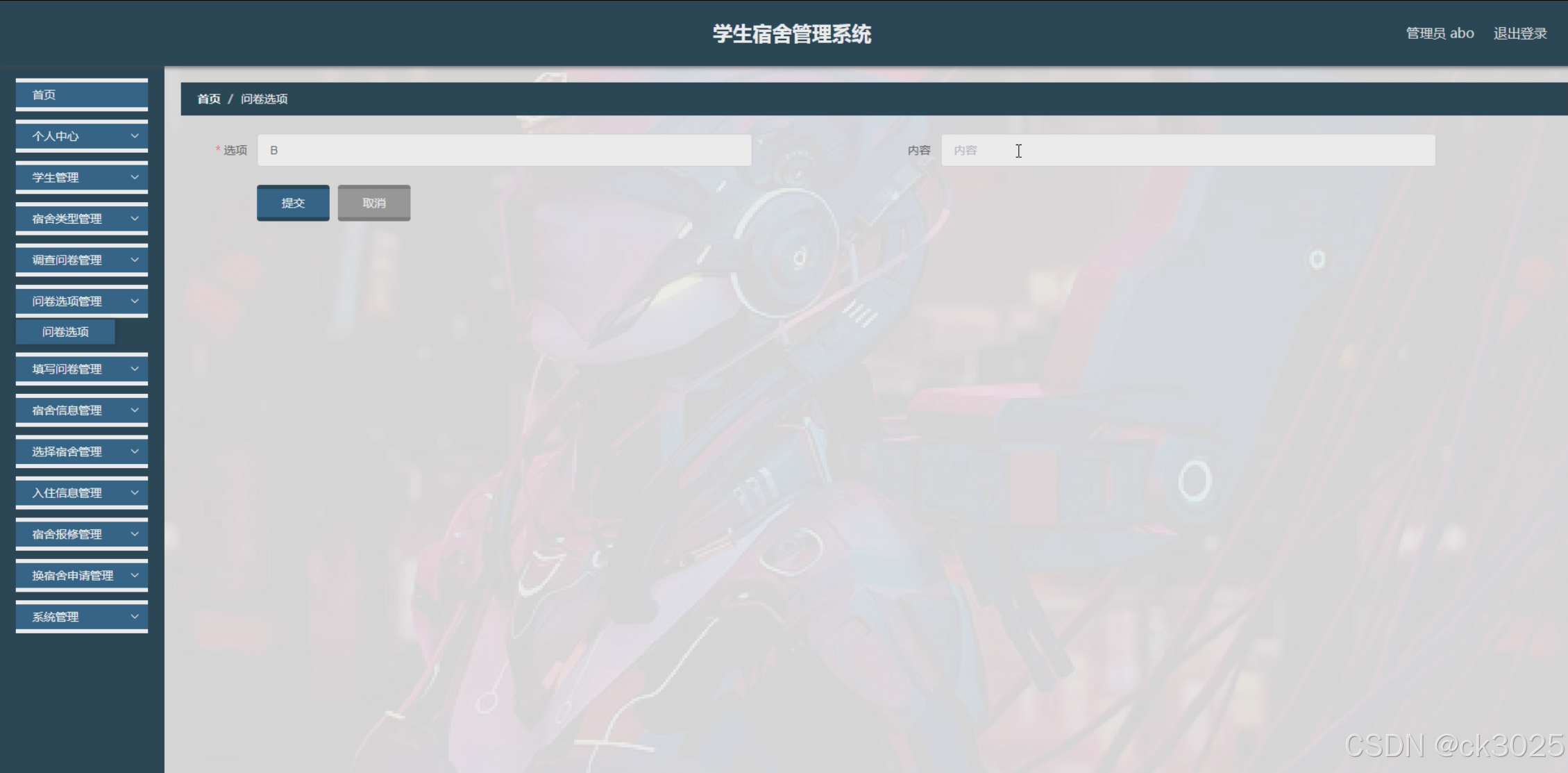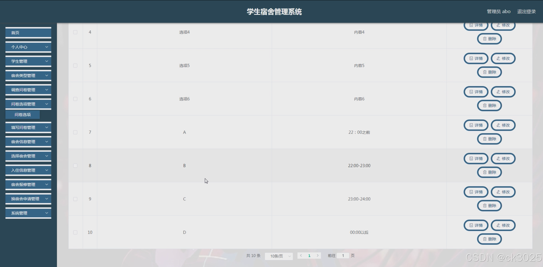 | 学生,宿舍类型,宿舍信息,选择宿舍,入住信息,宿舍报修,换宿舍申请,问卷选项,调查问卷,填写问卷 |