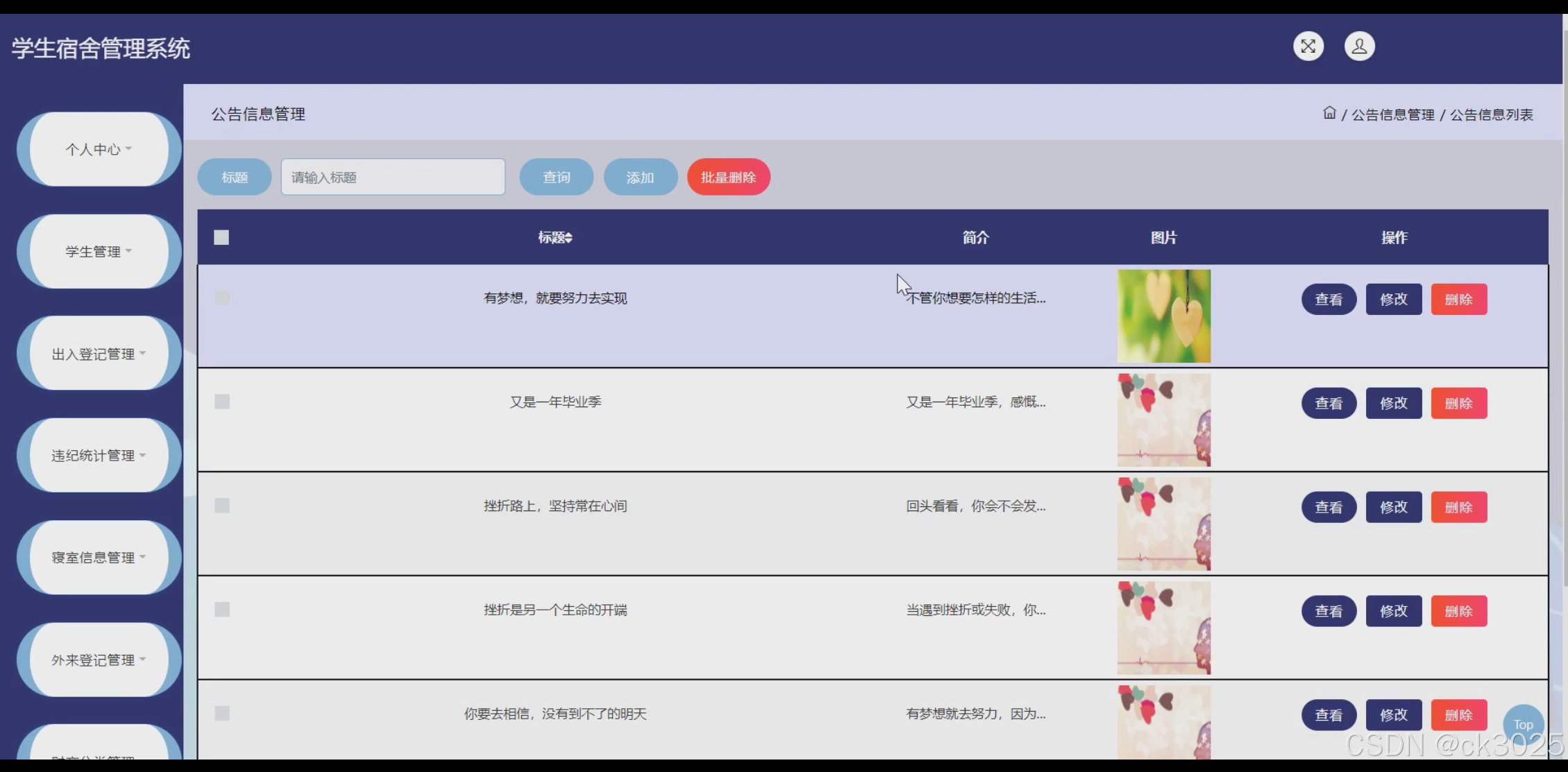 随着高等教育的普及,学生宿舍作为校园生活中的重要场所,其管理效率和安全性直接影响到学生的日常生活和学习。传统的人工管理方式不仅效率低下,而且难以全面覆盖所有管理环节,特别是在寝室信息管理、违规事件处理、出入登记以及寝室财产管理方面存在诸多不足。因此,本项目旨在开发一个基于Spring Boot的学生宿舍管理系统,通过信息化手段优化宿舍管理流程,提高管理效率,保障学生住宿安全。