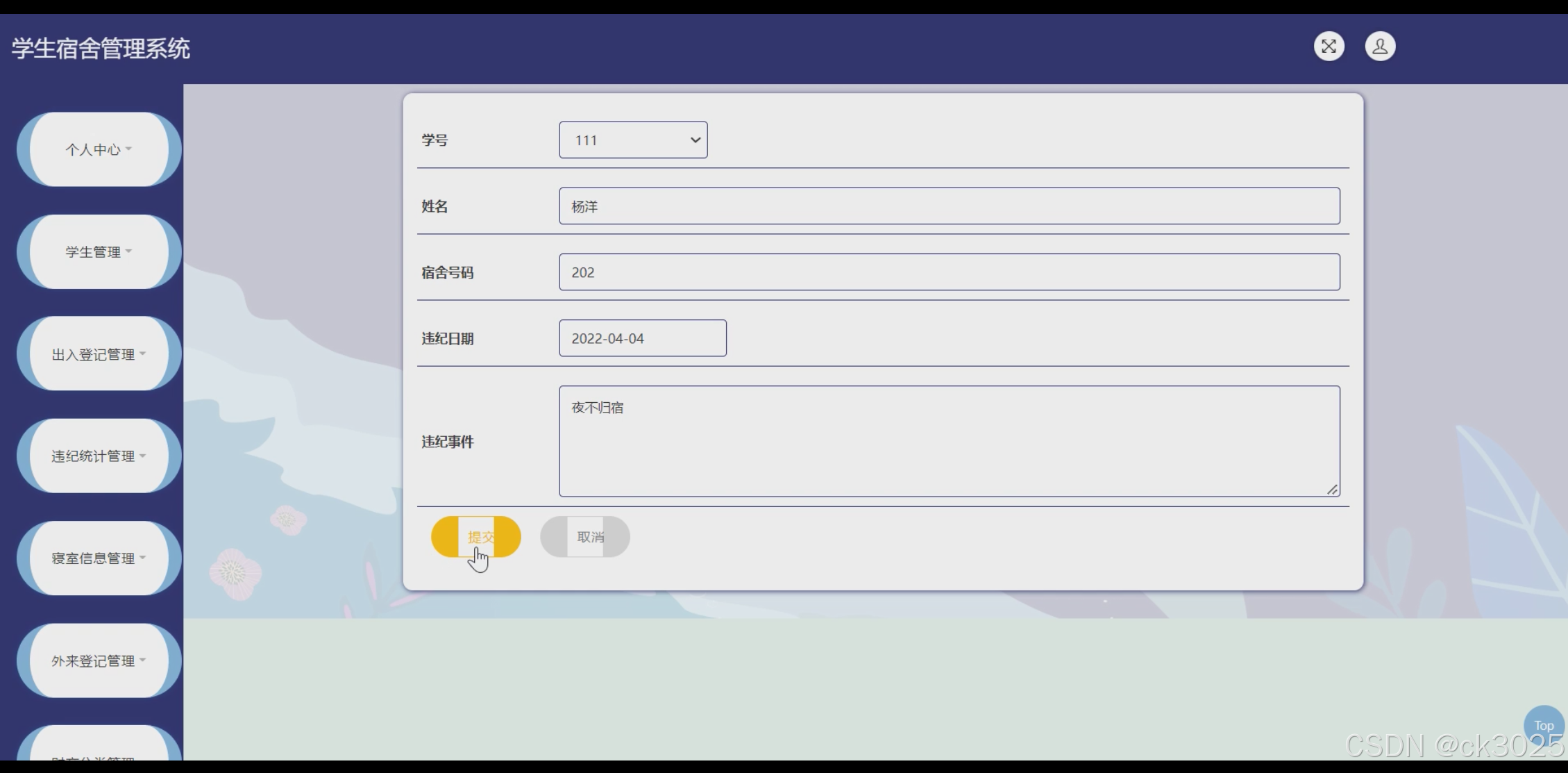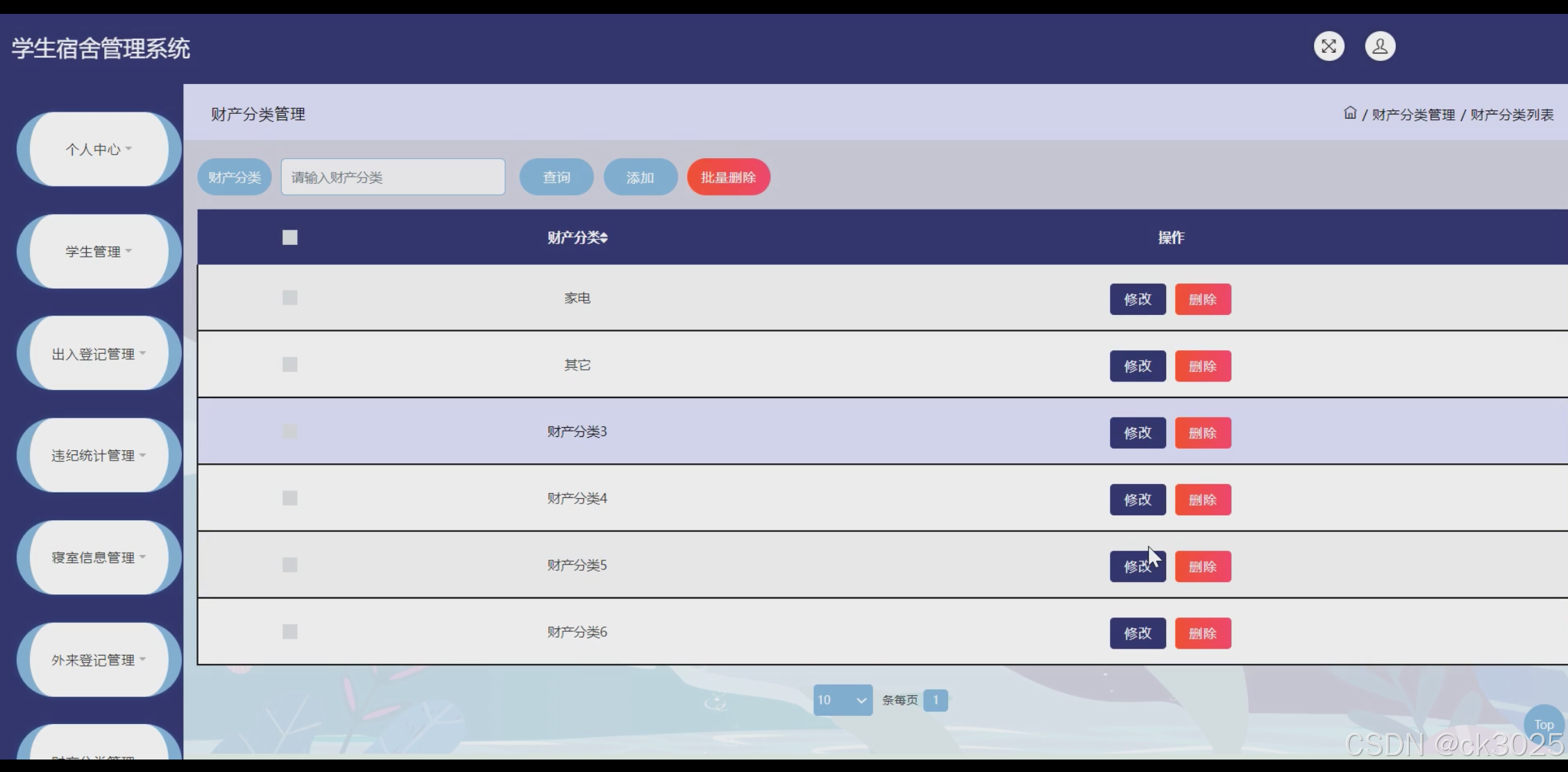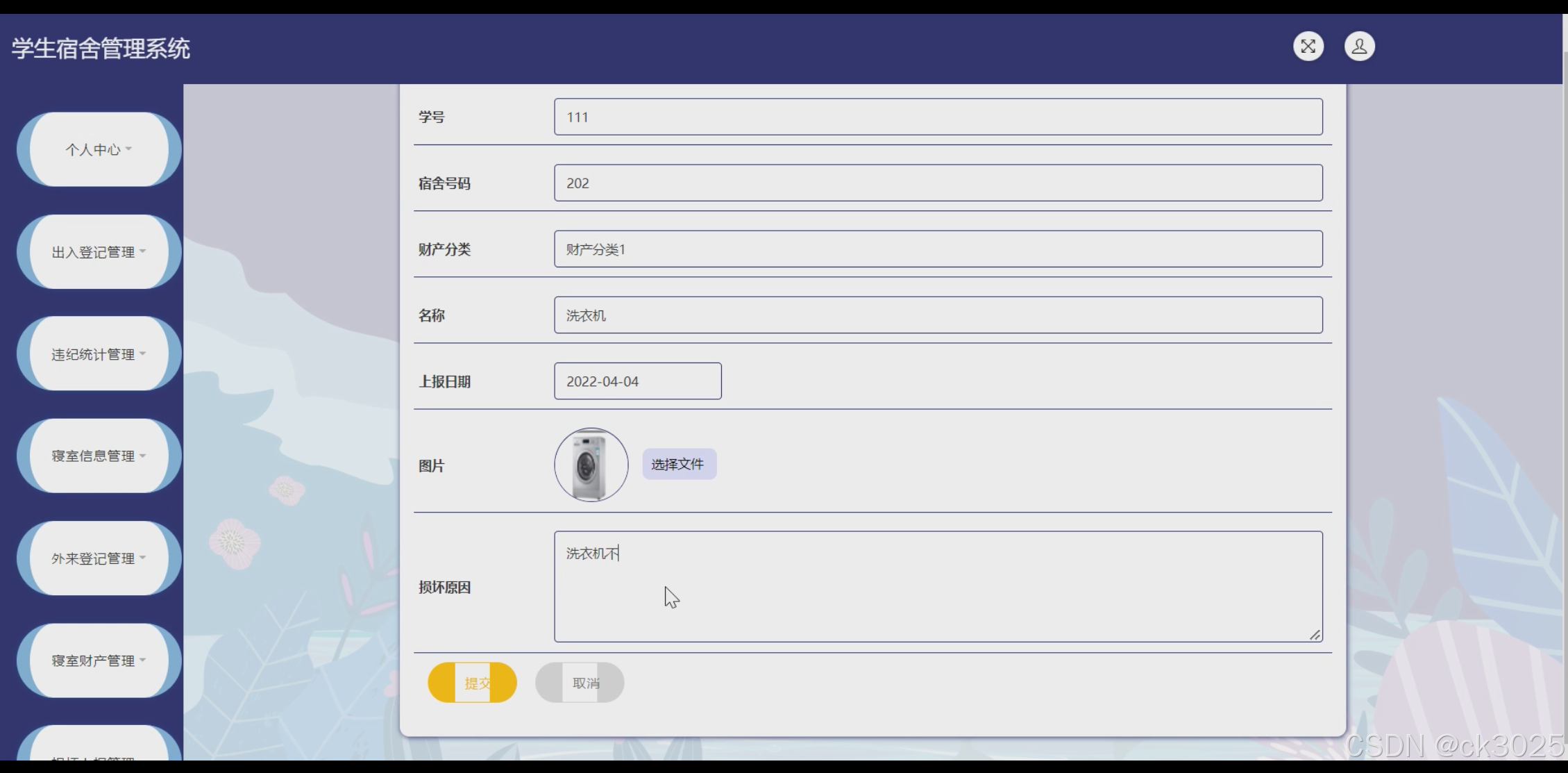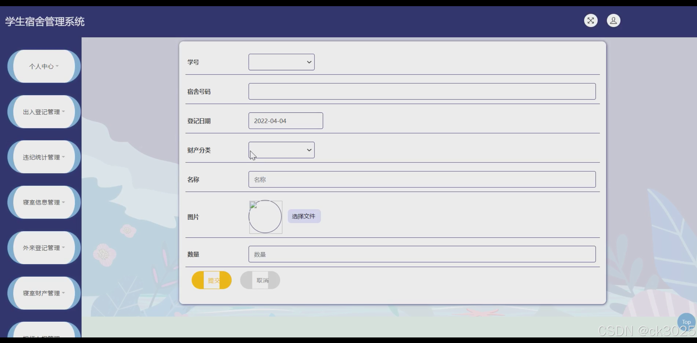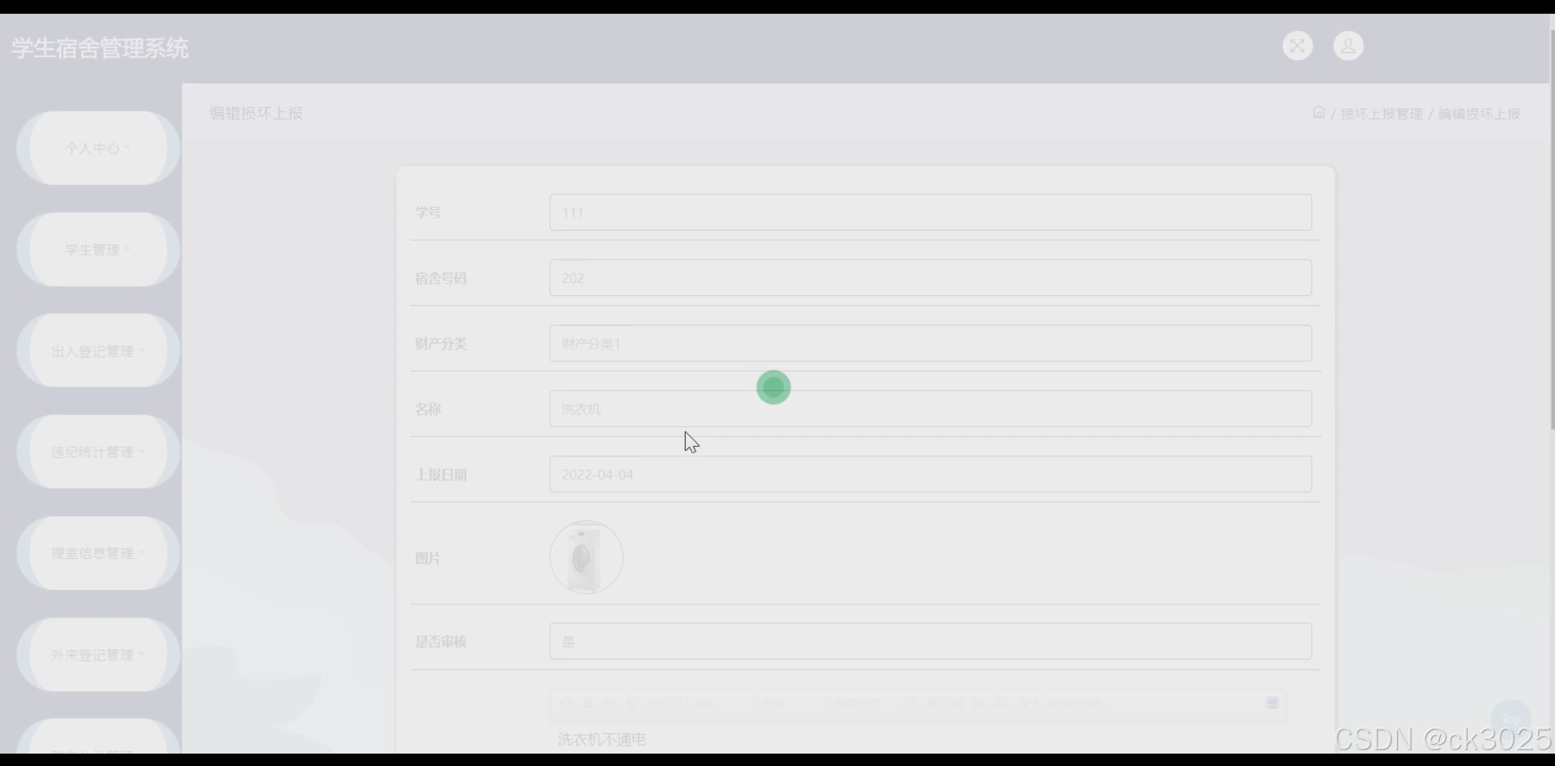 | 学生,寝室信息,违规事件,出入登记,外来登记,财产分类,寝室财产,损坏上报 |