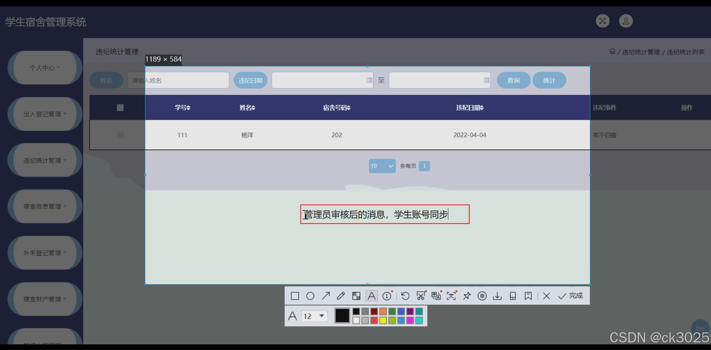 - 记录寝室内的违规事件,如晚归、使用违禁电器等,支持管理员录入违规信息,并自动通知相关学生进行整改。