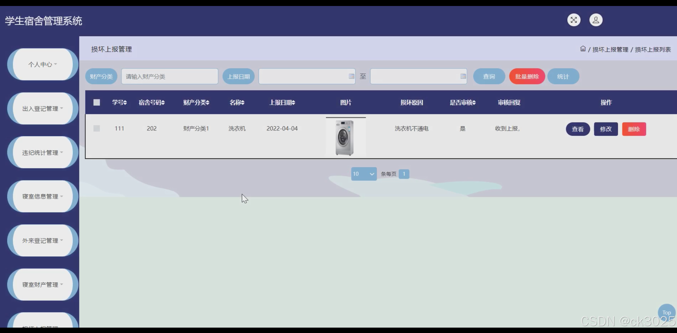 - 提供损坏上报功能,学生可通过系统上报寝室财产的损坏情况,管理员接收后安排维修或更换。