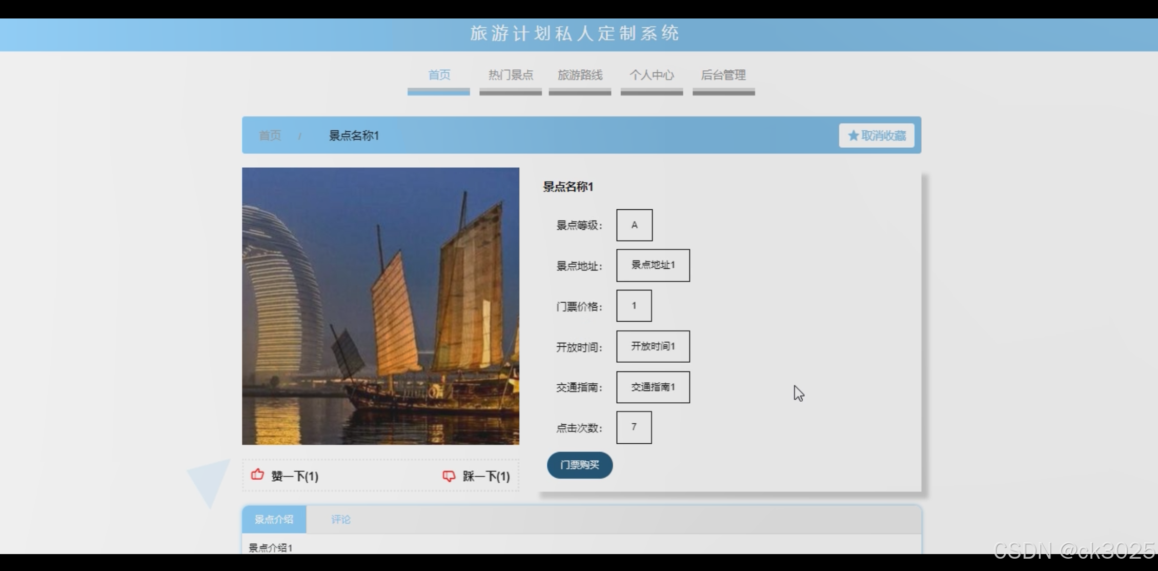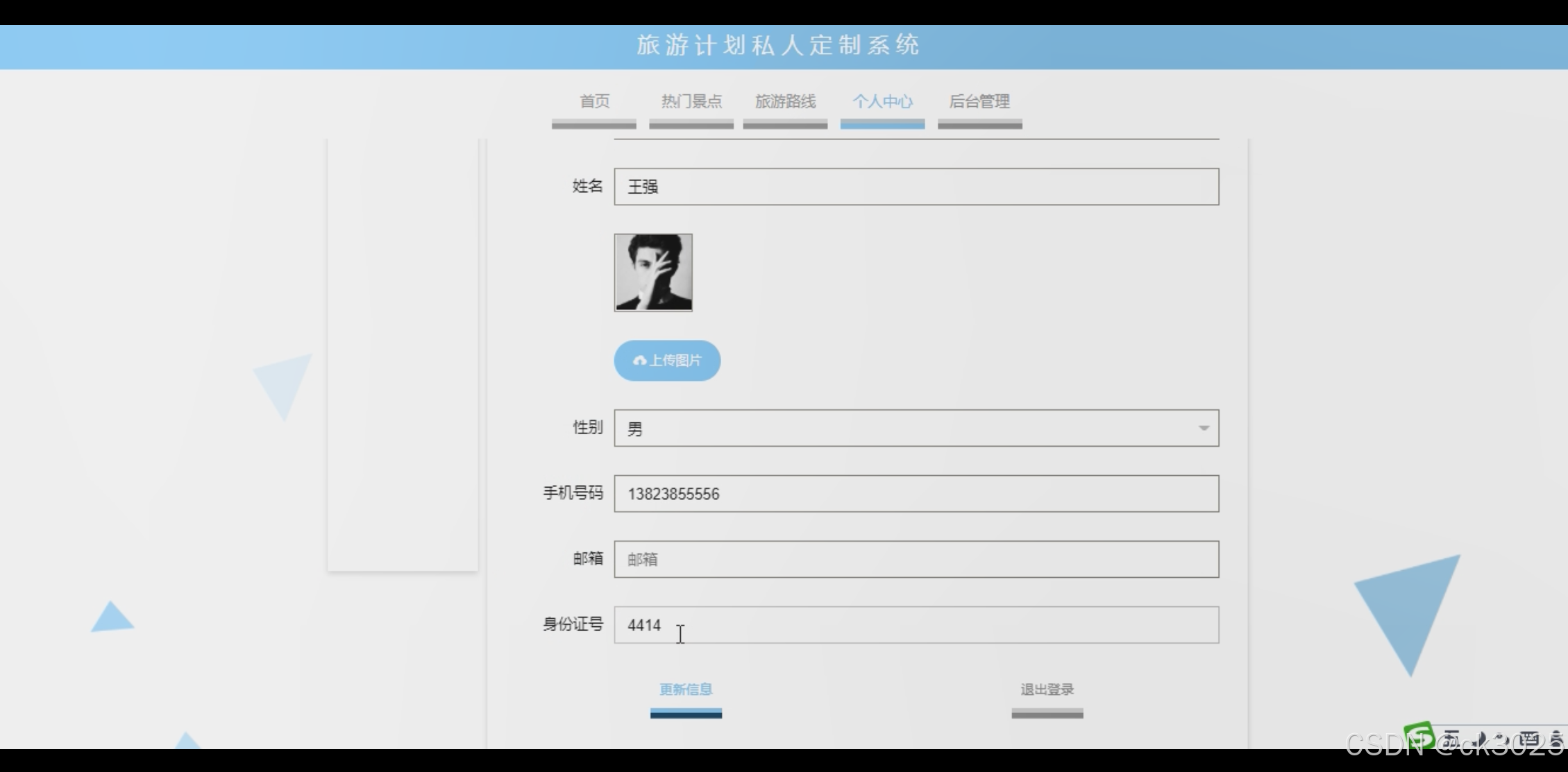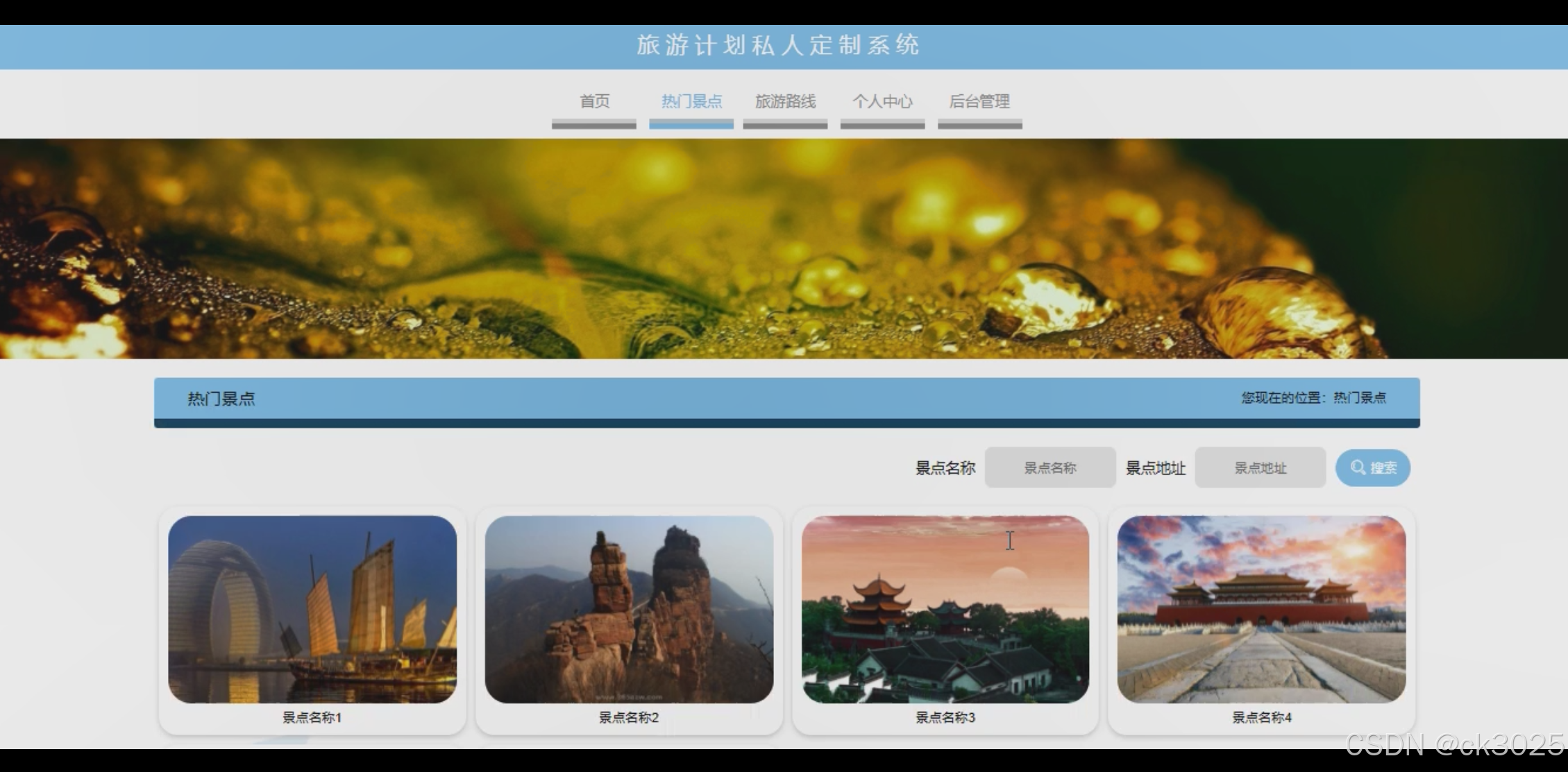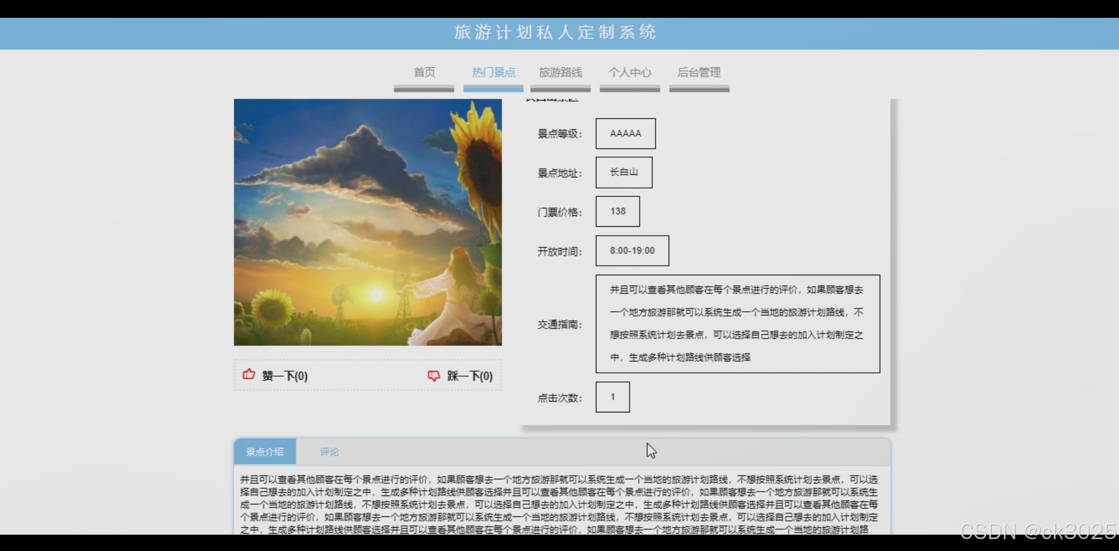 - 成功开发基于 Springboot 的旅游管理系统,实现旅游管理业务高效运行与用户便捷使用,显著提升旅游管理系统的运行效率与服务水平。为用户打造优质的旅游信息获取与订单管理平台,为旅游管理部门与服务提供商创造高效的工作管理工具。