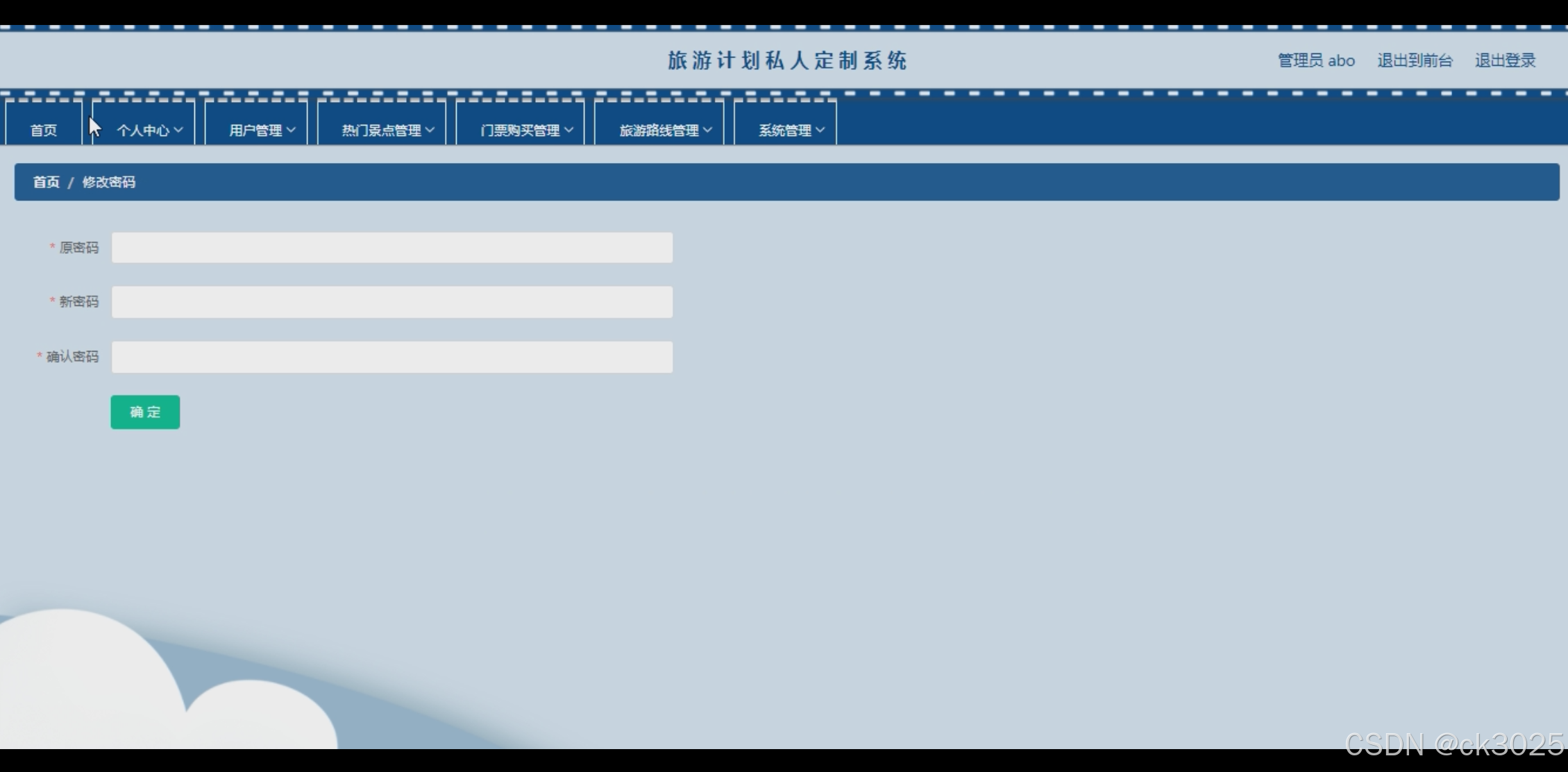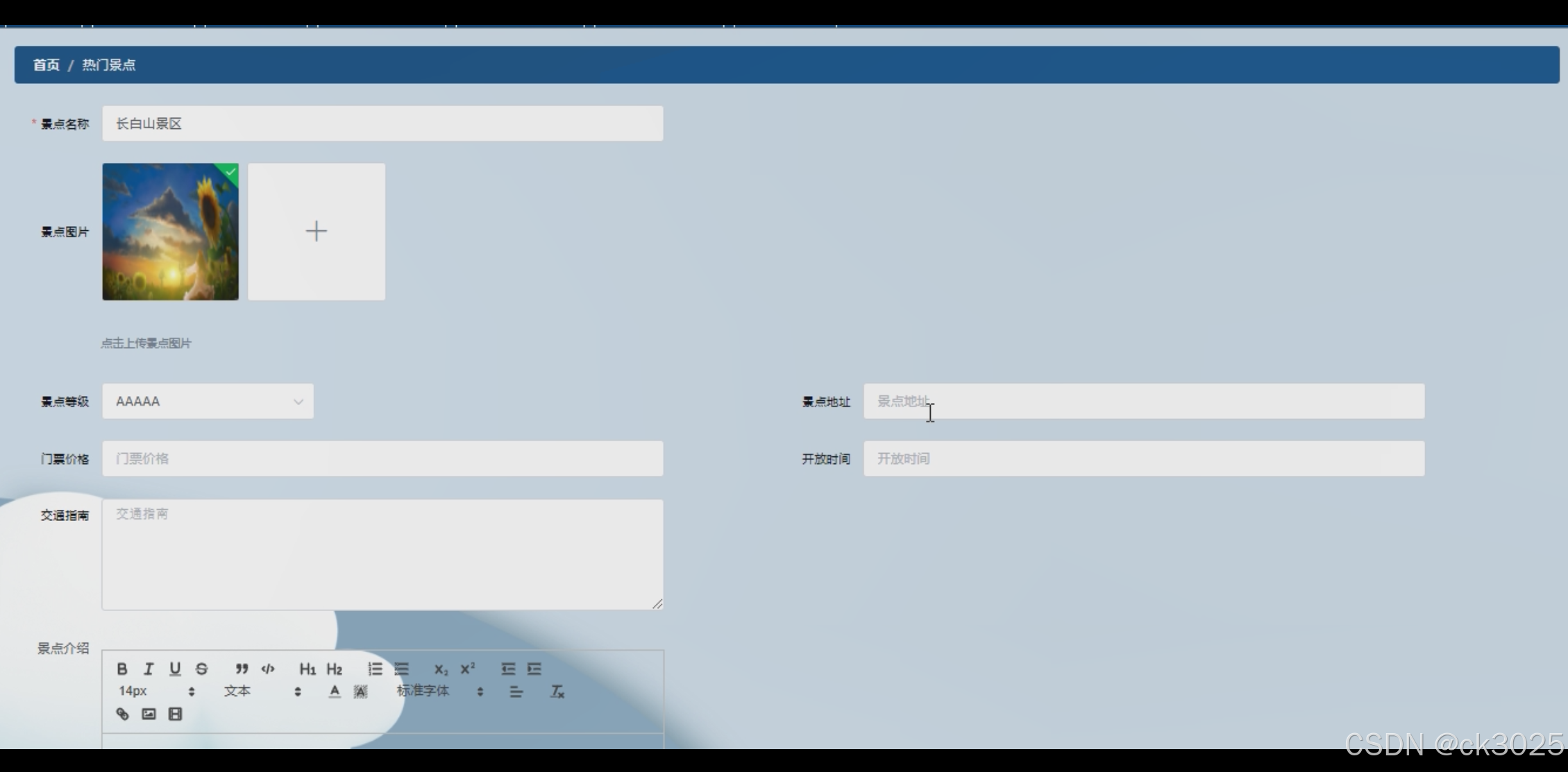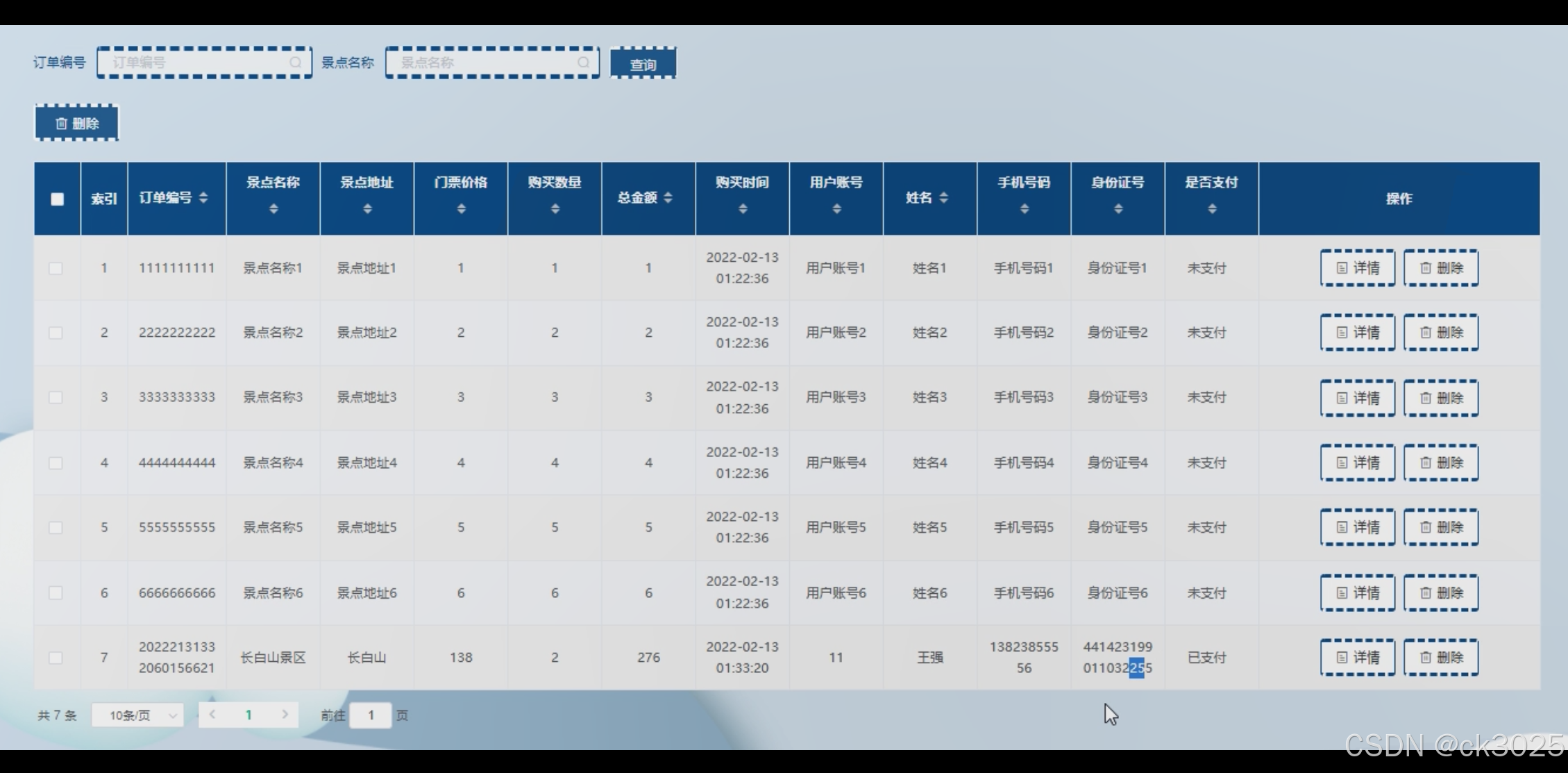 - 成功开发基于 Springboot 的旅游管理系统,实现旅游管理业务高效运行与用户便捷使用,显著提升旅游管理系统的运行效率与服务水平。为用户打造优质的旅游信息获取与订单管理平台,为旅游管理部门与服务提供商创造高效的工作管理工具。