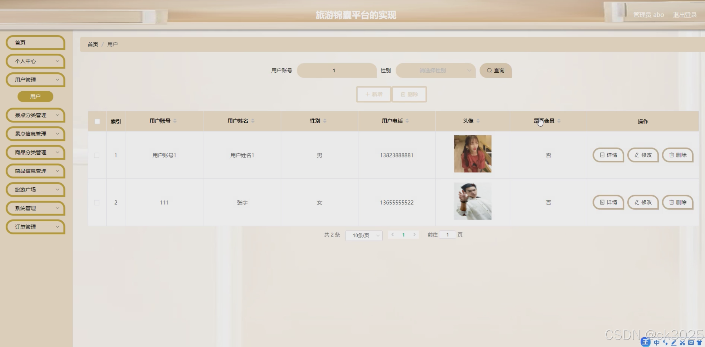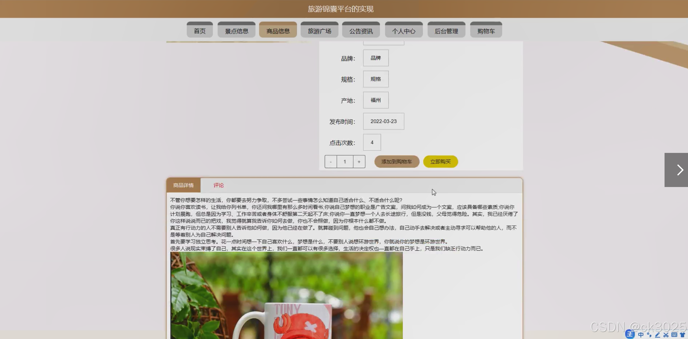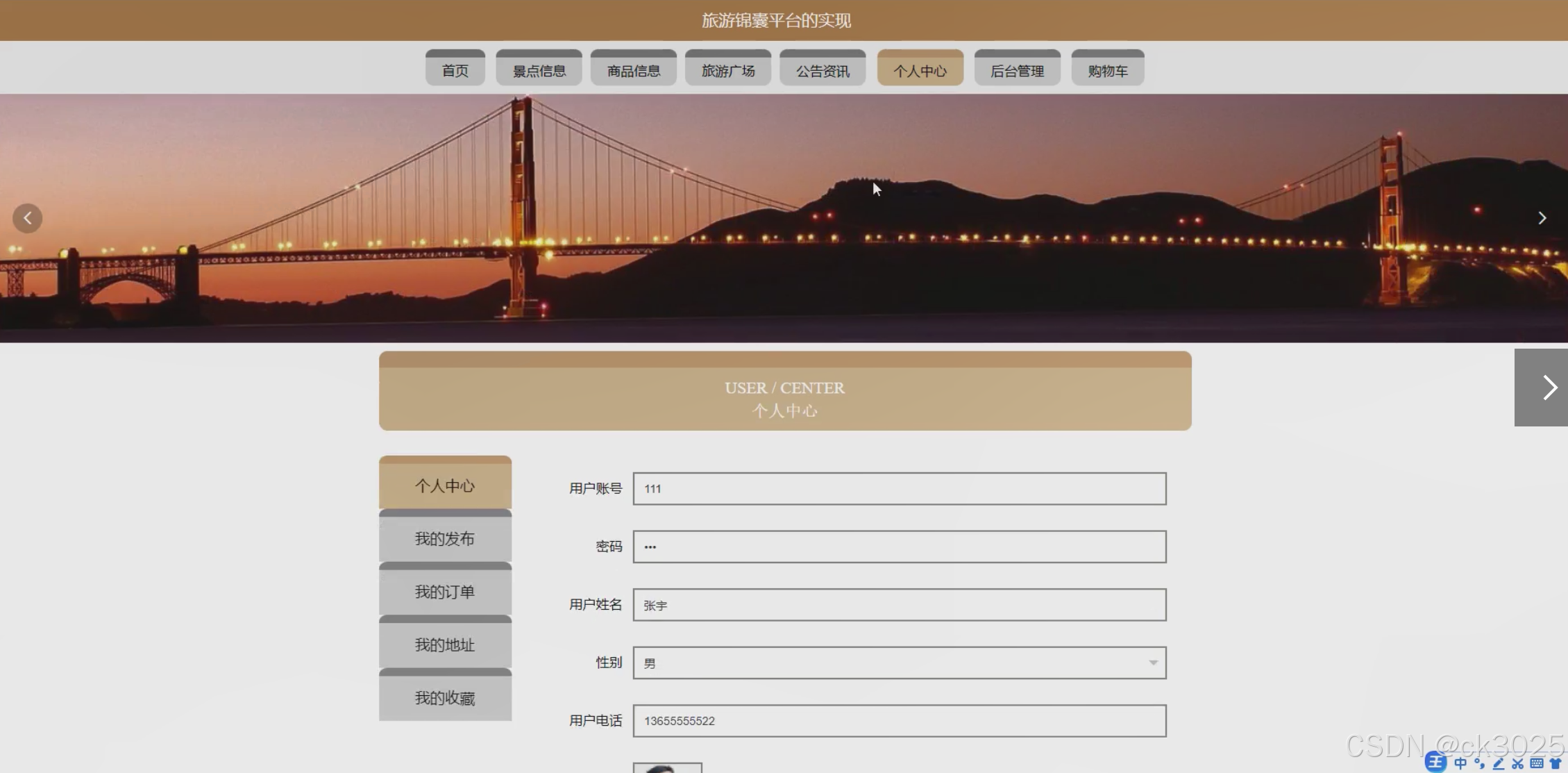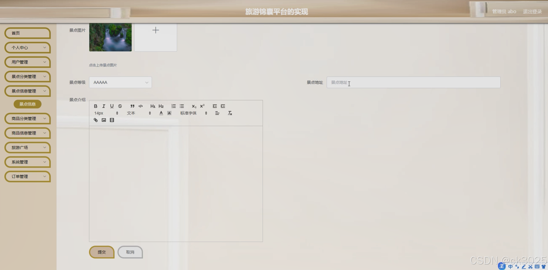 景点管理方通过平台及时更新景点信息,发布景点活动,回复用户咨询。旅游商品供应商管理商品信息,包括上新、下架商品,处理订单,与用户沟通商品售后事宜。系统实现用户管理、景点分类管理、景点信息管理、商品分类管理、商品信息管理、订单管理、数据分析管理等全流程信息化管理,显著提升旅游锦囊平台的运行效率与服务水平,为旅游服务工作的高效开展提供有力支持。