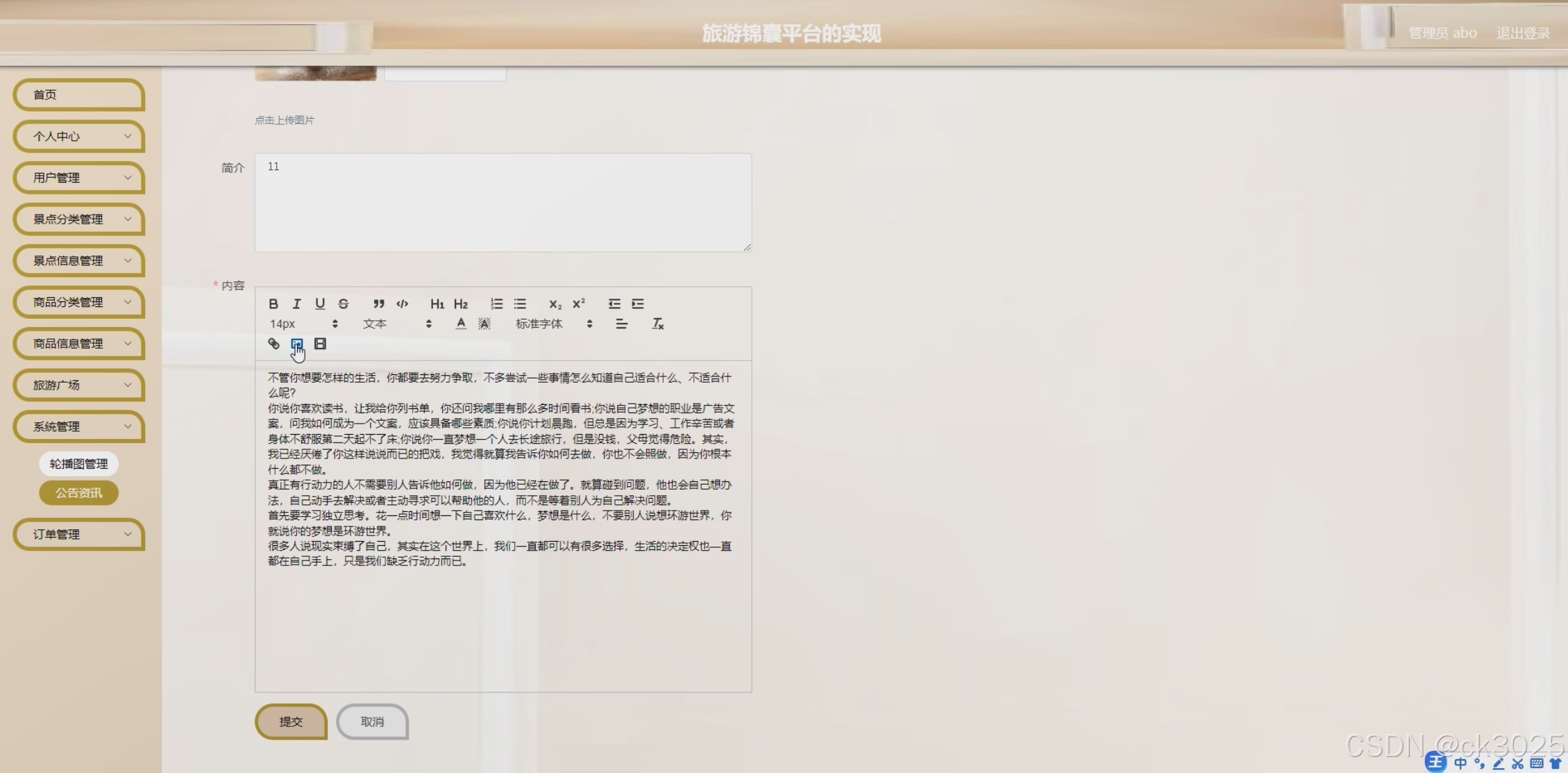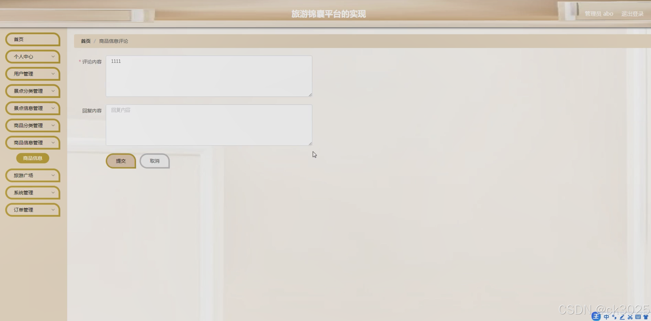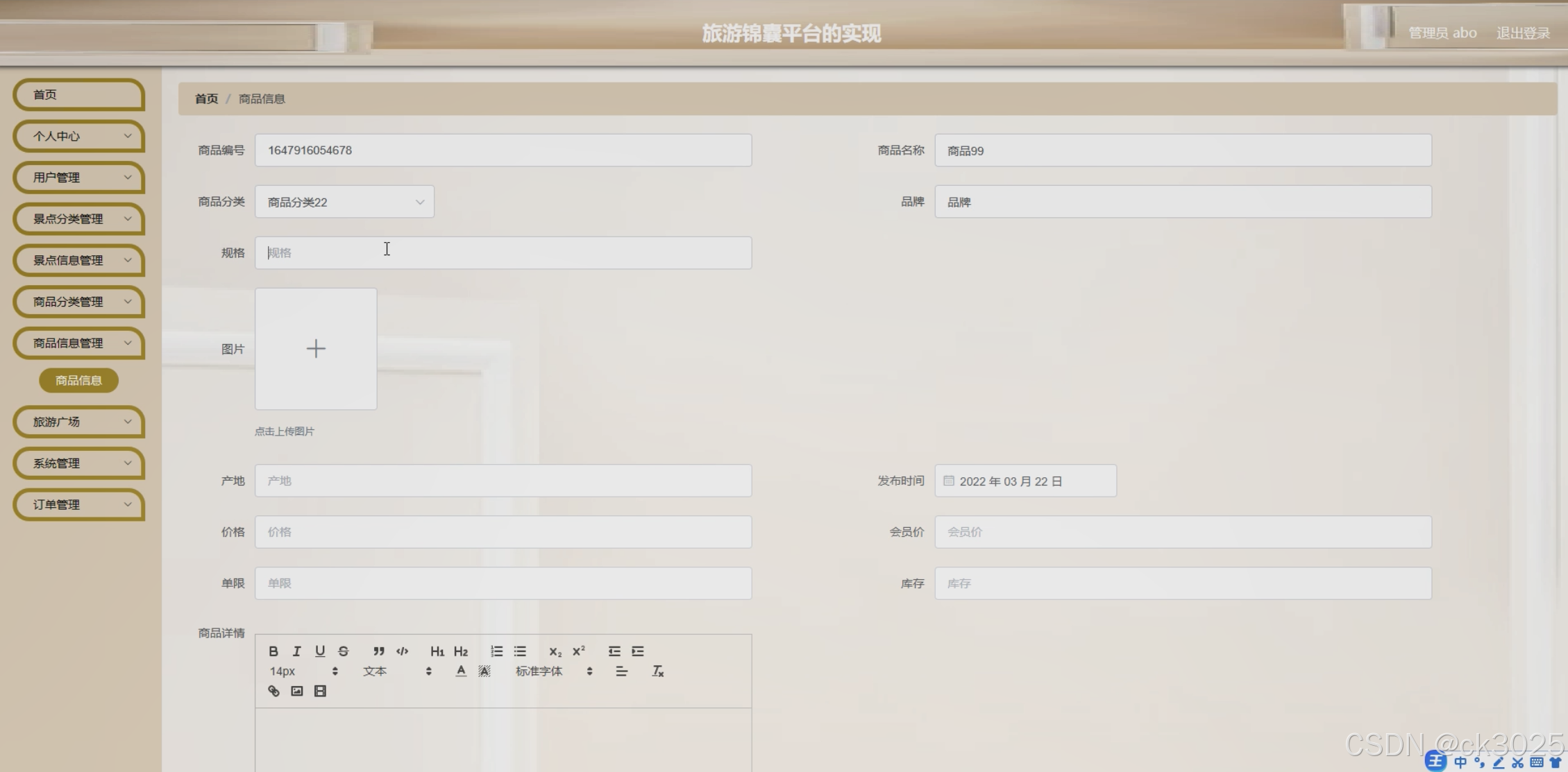 景点管理方通过平台及时更新景点信息,发布景点活动,回复用户咨询。旅游商品供应商管理商品信息,包括上新、下架商品,处理订单,与用户沟通商品售后事宜。系统实现用户管理、景点分类管理、景点信息管理、商品分类管理、商品信息管理、订单管理、数据分析管理等全流程信息化管理,显著提升旅游锦囊平台的运行效率与服务水平,为旅游服务工作的高效开展提供有力支持。