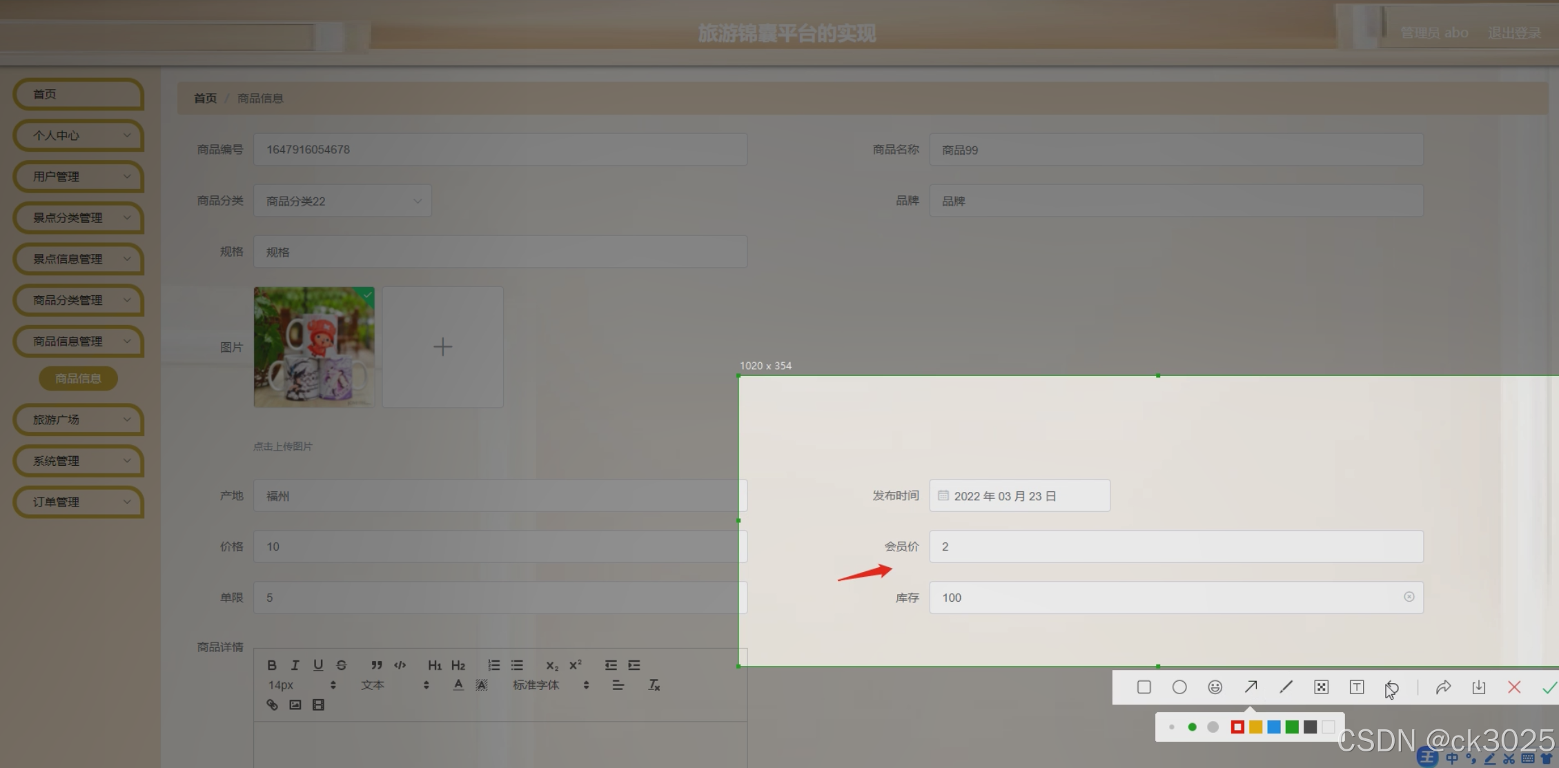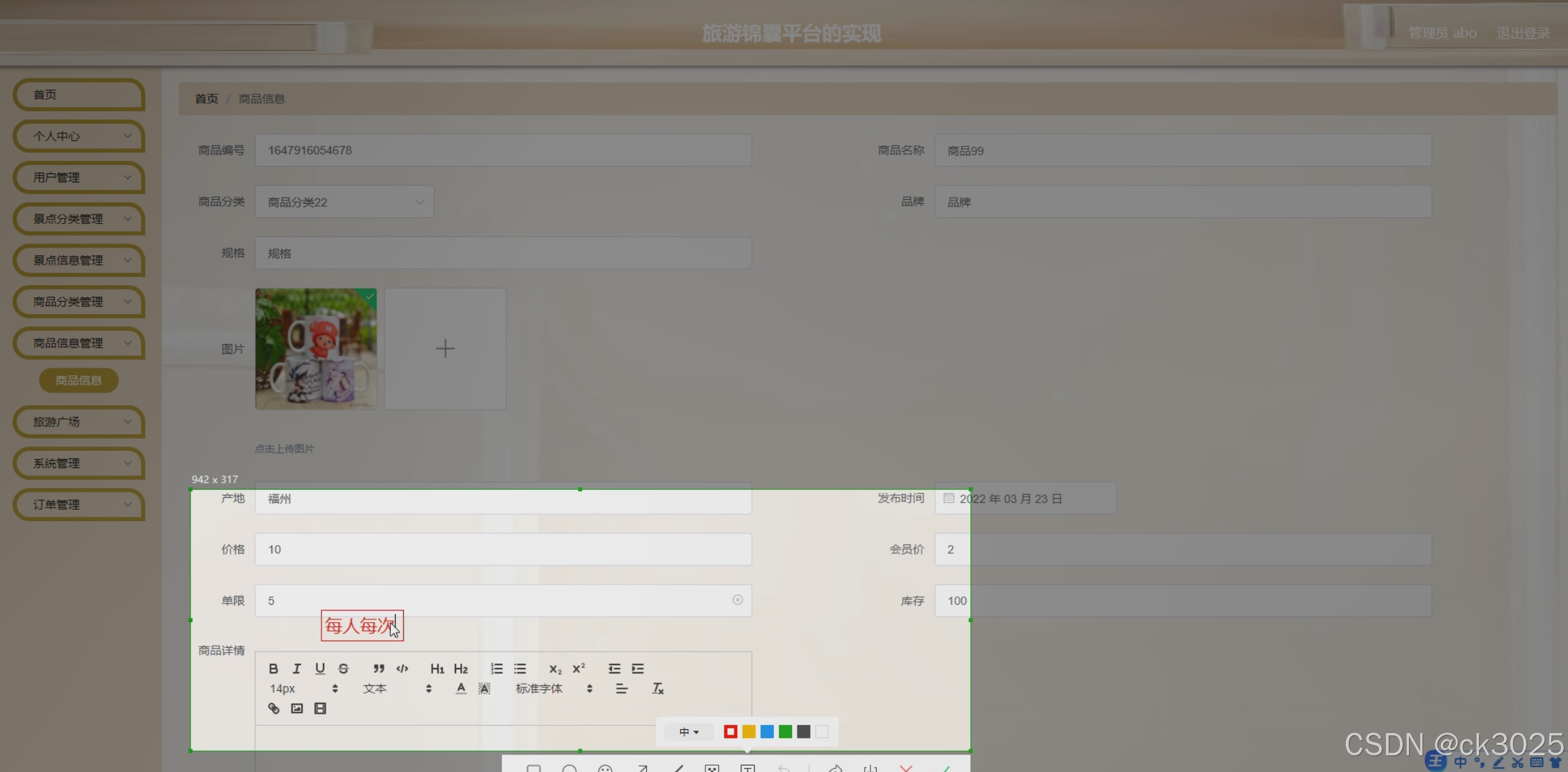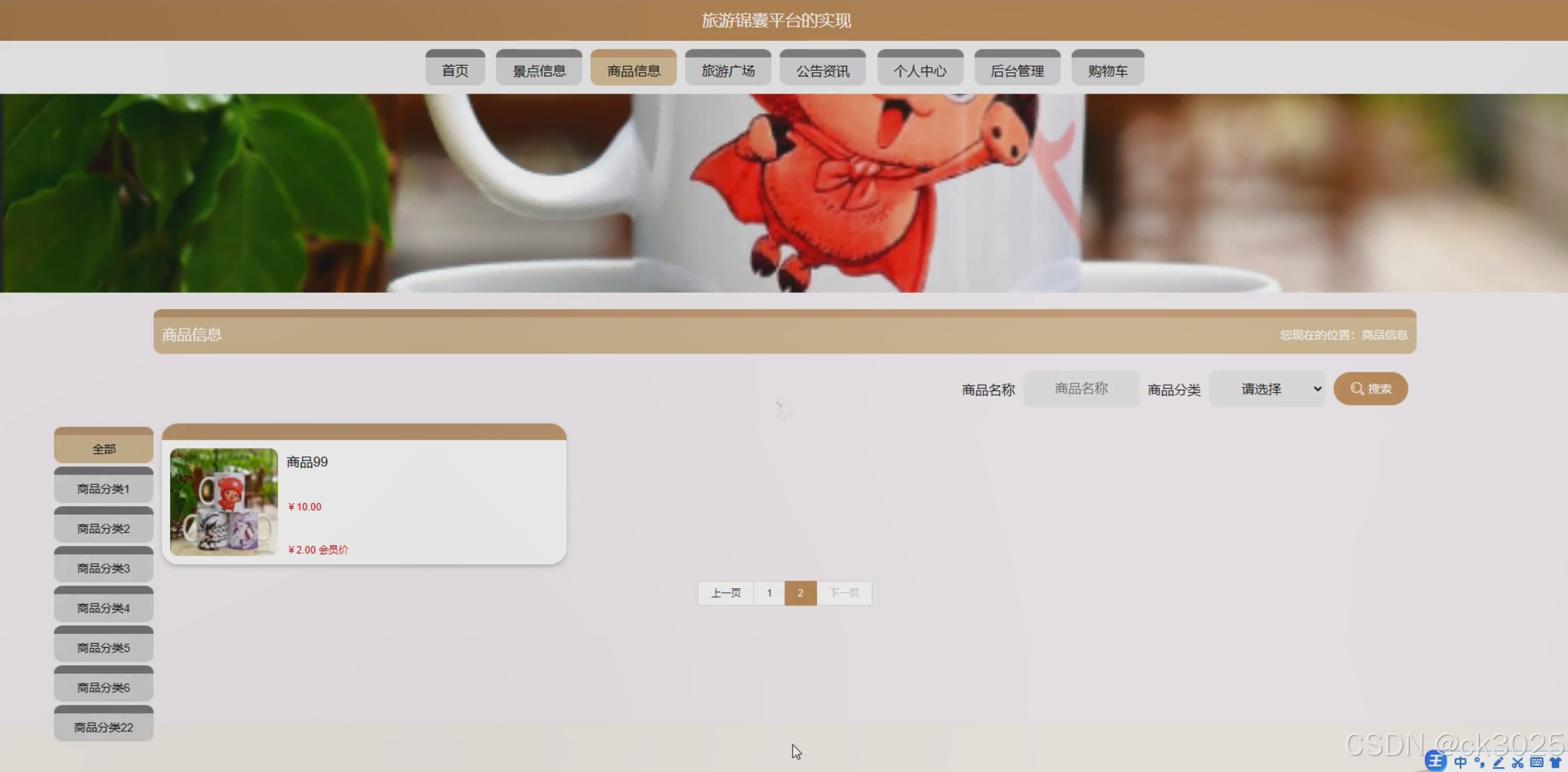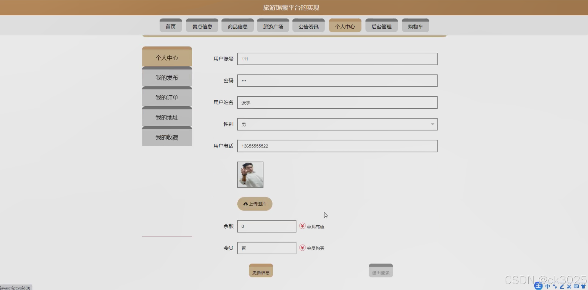 景点管理方通过平台及时更新景点信息,发布景点活动,回复用户咨询。旅游商品供应商管理商品信息,包括上新、下架商品,处理订单,与用户沟通商品售后事宜。系统实现用户管理、景点分类管理、景点信息管理、商品分类管理、商品信息管理、订单管理、数据分析管理等全流程信息化管理,显著提升旅游锦囊平台的运行效率与服务水平,为旅游服务工作的高效开展提供有力支持。