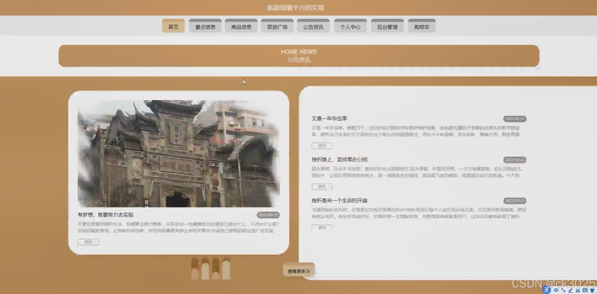 - 成功开发基于 Springboot 的旅游锦囊平台,实现旅游信息与商品服务业务高效运行与用户便捷使用,显著提升旅游锦囊平台的运行效率与服务水平。为用户打造优质的旅游信息获取与商品购买平台,为景点管理方与供应商创造高效的工作管理工具。