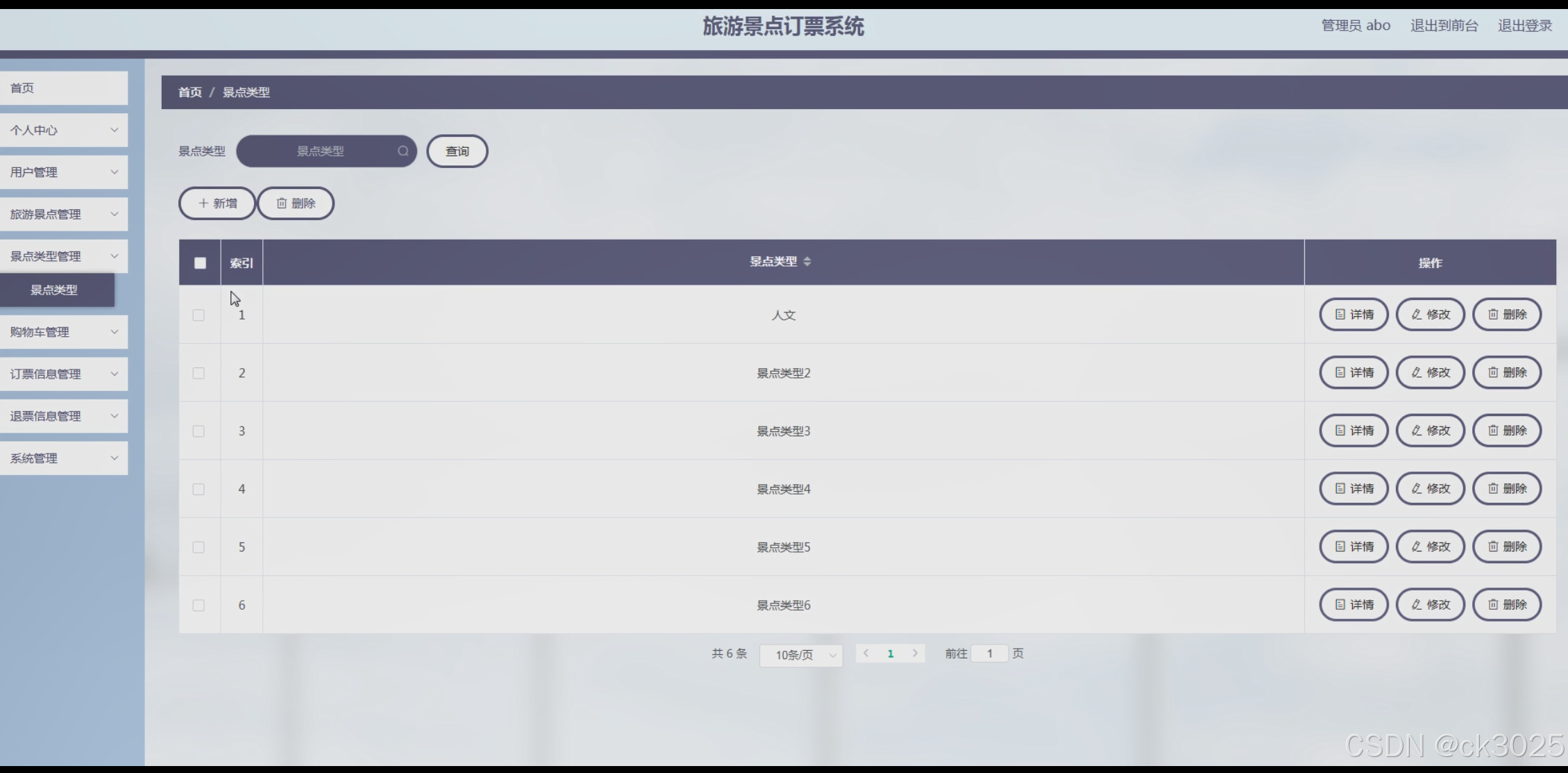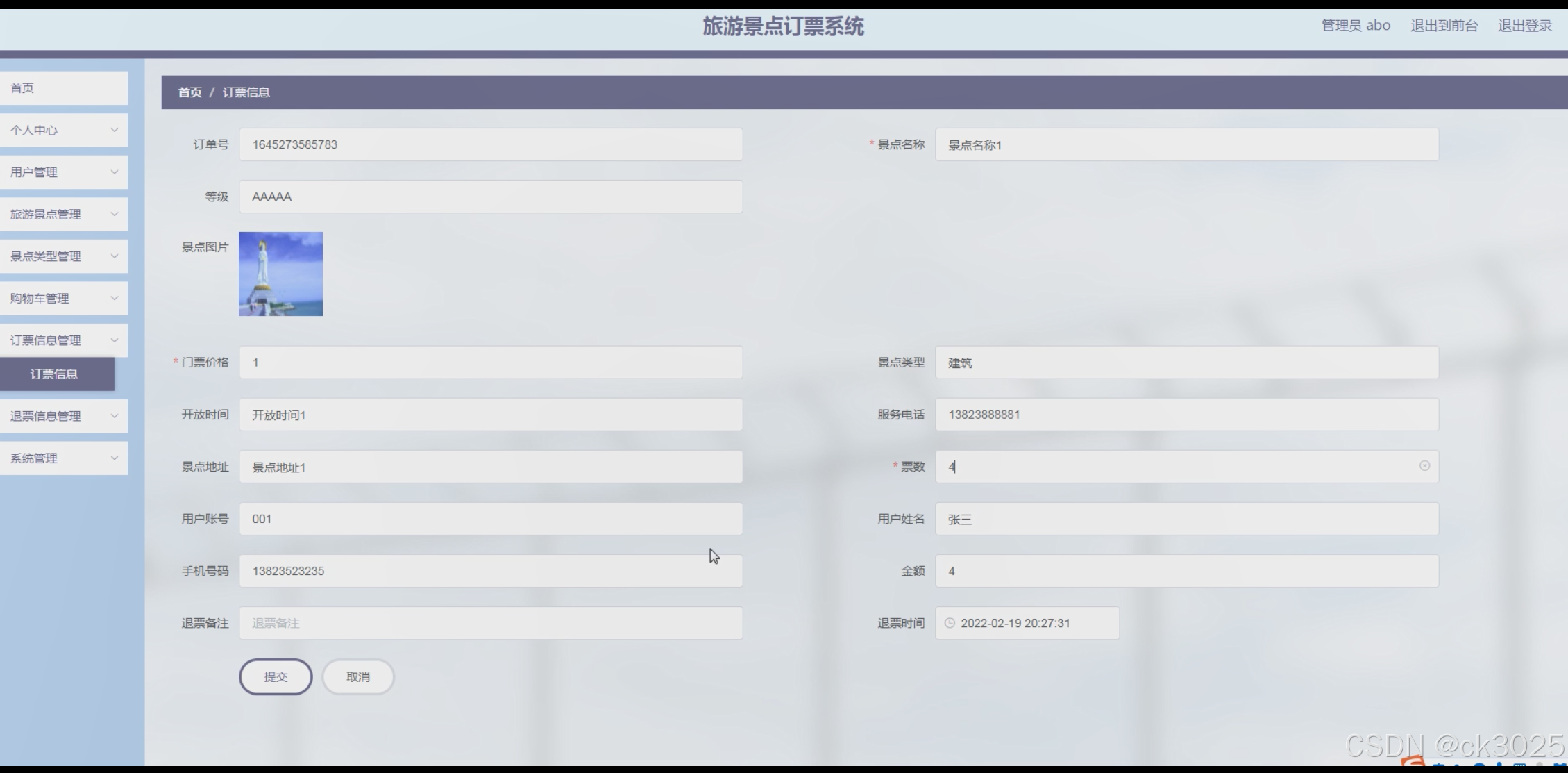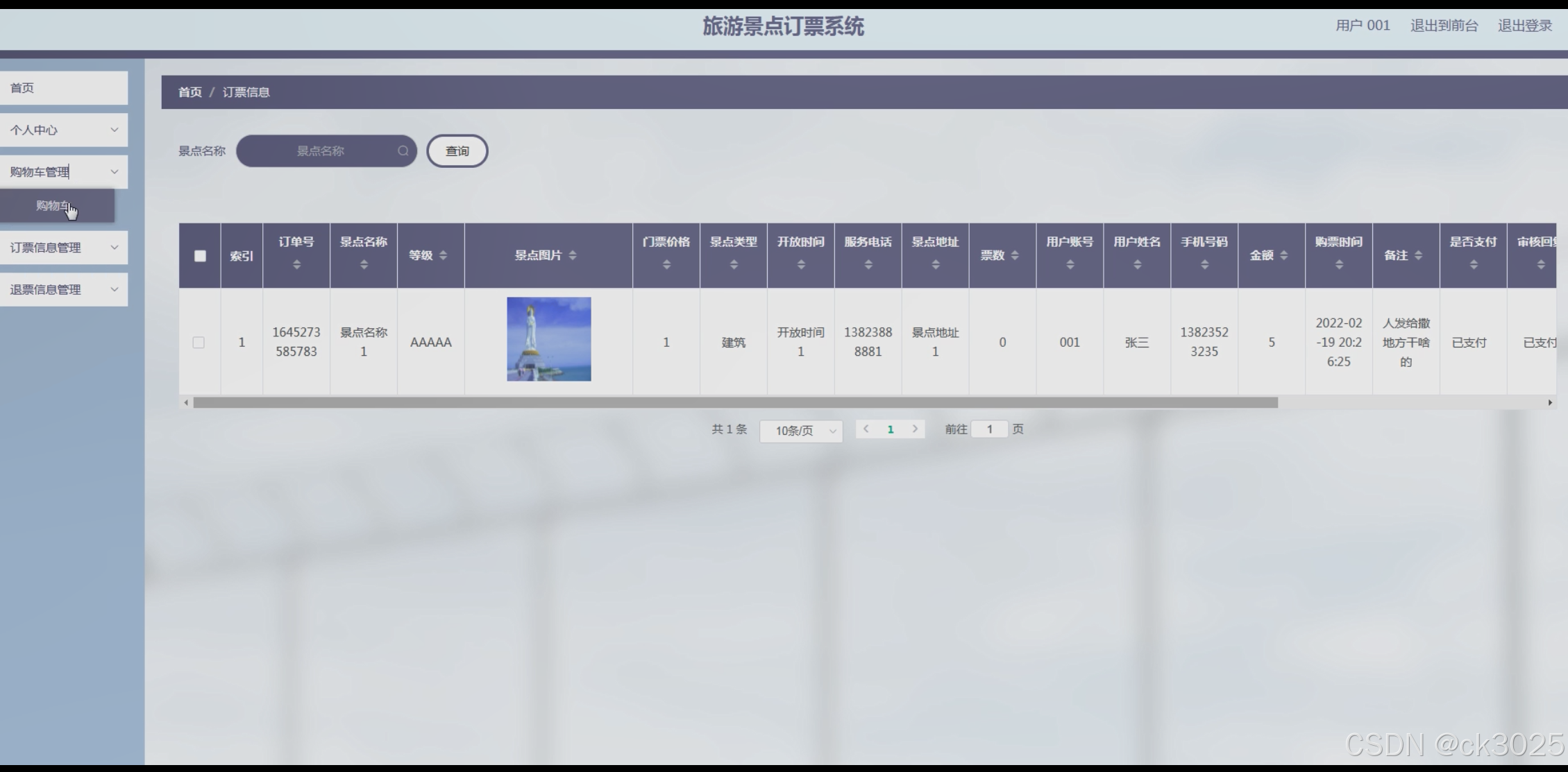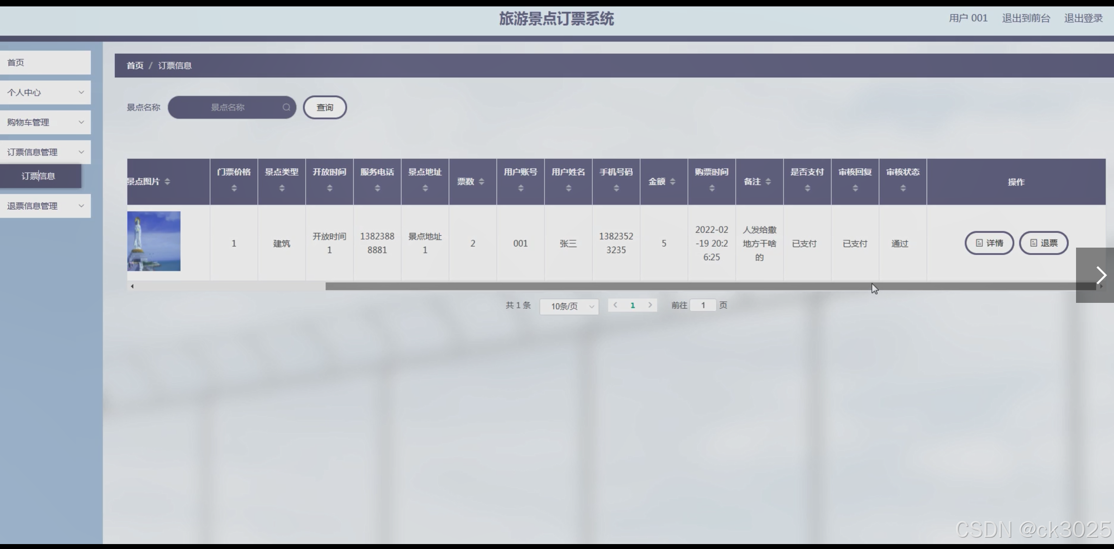 旅游景点管理方通过系统实时监控门票销售数据,根据销售趋势调整票务政策,如推出优惠活动、设置不同时段票价等。处理用户退票申请,根据退票规则进行审核与退款操作。系统实现用户管理、景点类型管理、旅游景点管理、购物车管理、订票信息管理、退票信息管理、数据分析管理等全流程信息化管理,显著提升旅游景点订票系统的运行效率与服务水平,为旅游景点票务管理工作的高效开展提供有力支持。