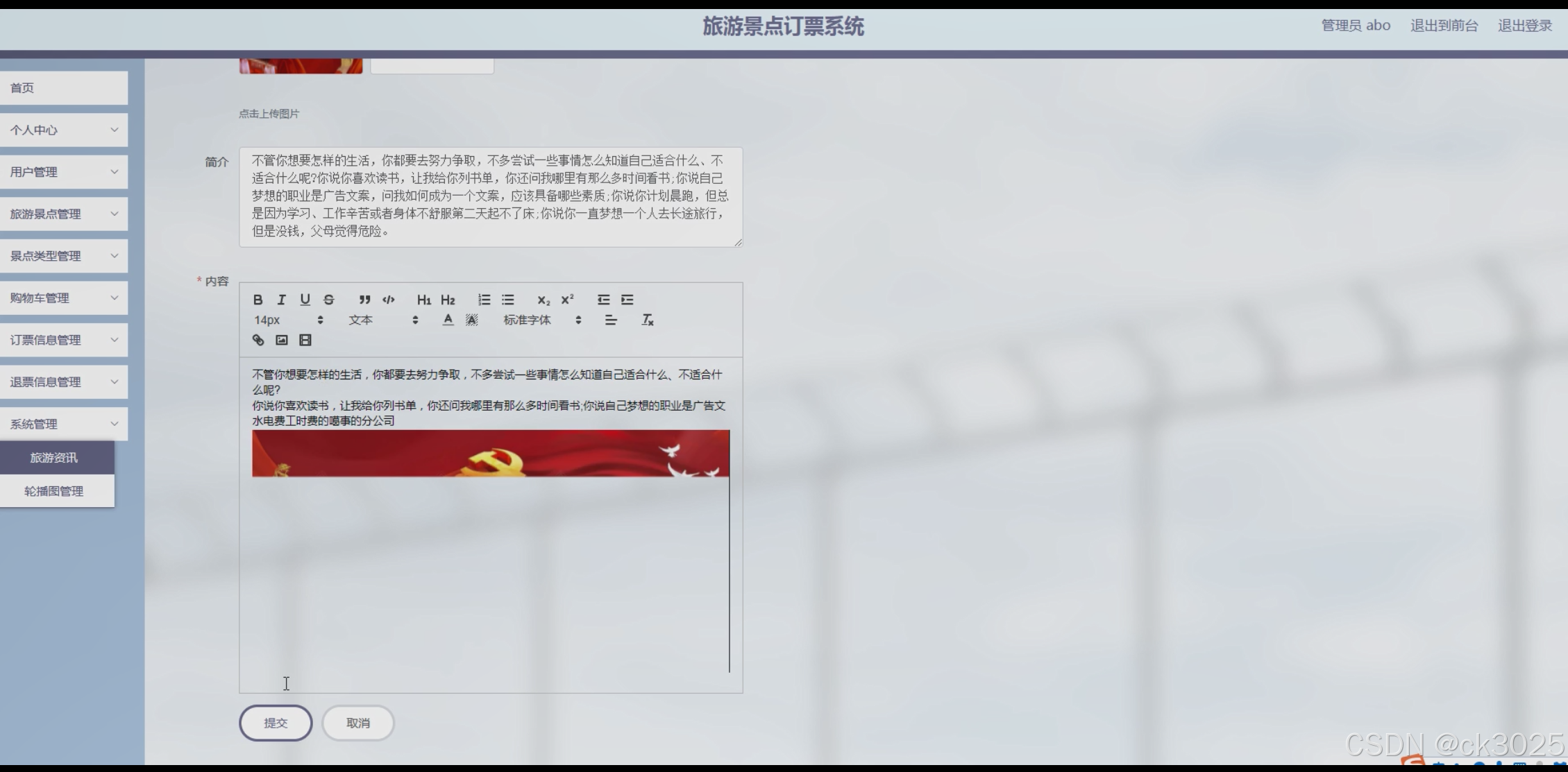 本项目旨在运用 Springboot 框架构建一体化旅游景点订票系统,服务用户与旅游景点管理方。用户通过系统可便捷注册登录,进入景点类型板块。系统提供细致分类,按自然风光类(如山川、湖泊、海滨浴场)、历史人文类(如古迹遗址、博物馆、名人故居)、主题娱乐类(如游乐园、动物园、科技馆)等,方便用户快速定位心仪景点类型。在旅游景点板块,用户可查看每个景点的详细信息,包括名称、地理位置、开放时间、门票价格、特色景观介绍、游客评价等。