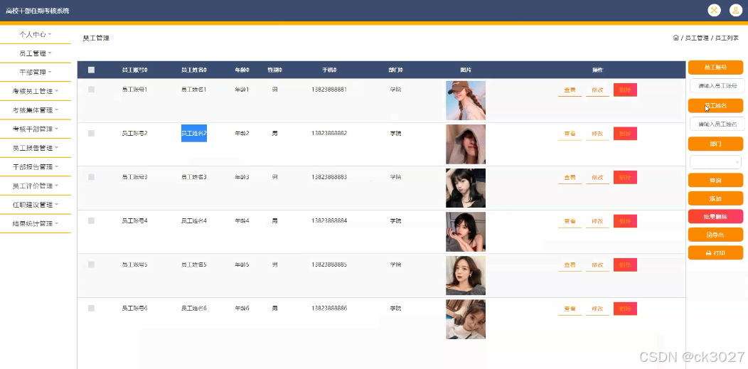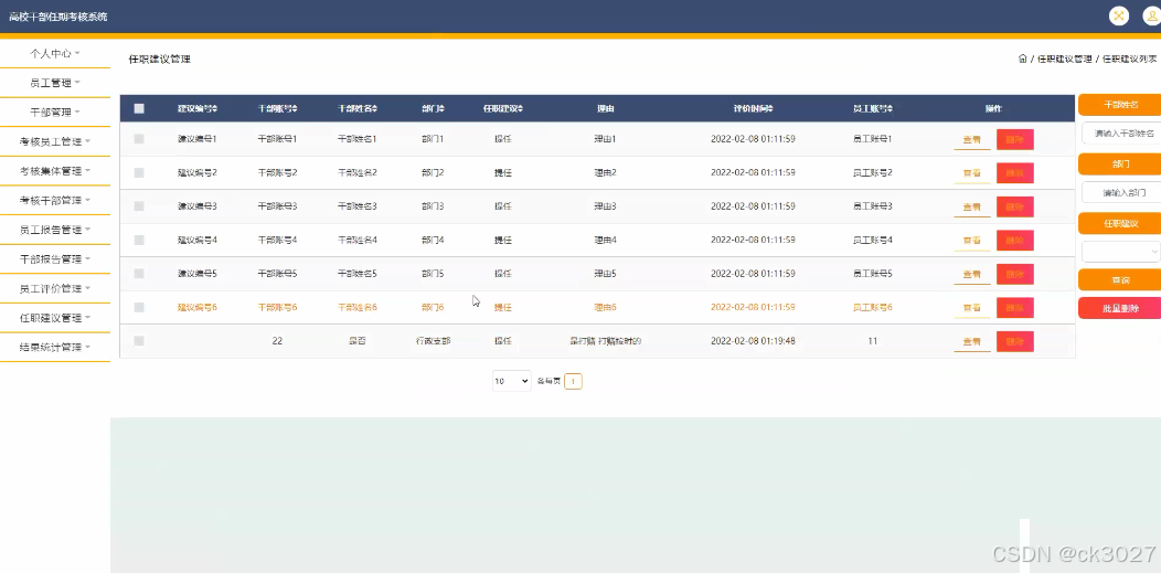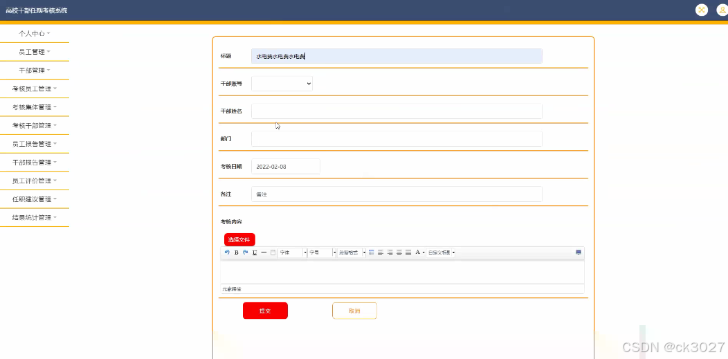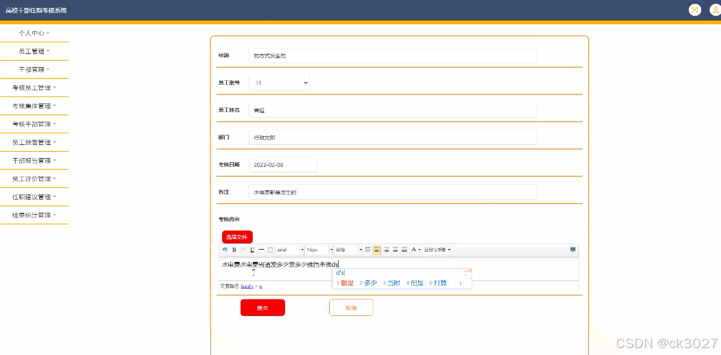- 考核干部与考核员工:系统需支持对干部和员工的任期考核,包括考核指标的设定、考核数据的录入、考核结果的计算等。