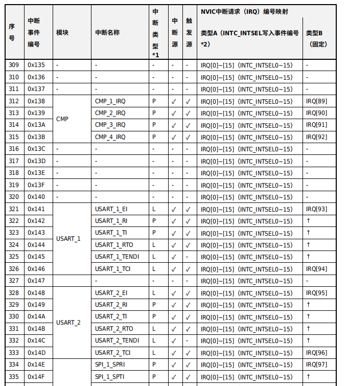 由上表可知,中断请求编号映射有两种方法,方法A是16个可编程的中断号,比如我串口1空闲中断可以用INT000_IRQn,串口2空闲中断INT001_IRQn,定时器溢出中断可以用INT002_IRQn,...
