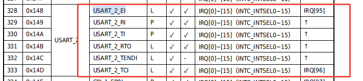 我们再来观察此表类型B,我们以USART_2_EI这个中断举例。我们想用类型B的方法申请中断,就只用固定的就只能用IRQ[95]这个编号申请。