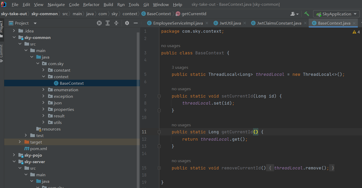 在jwt拦截器中获取到了ID,但如何传给service呢?这里要引入一个新的技术ThreadLocal