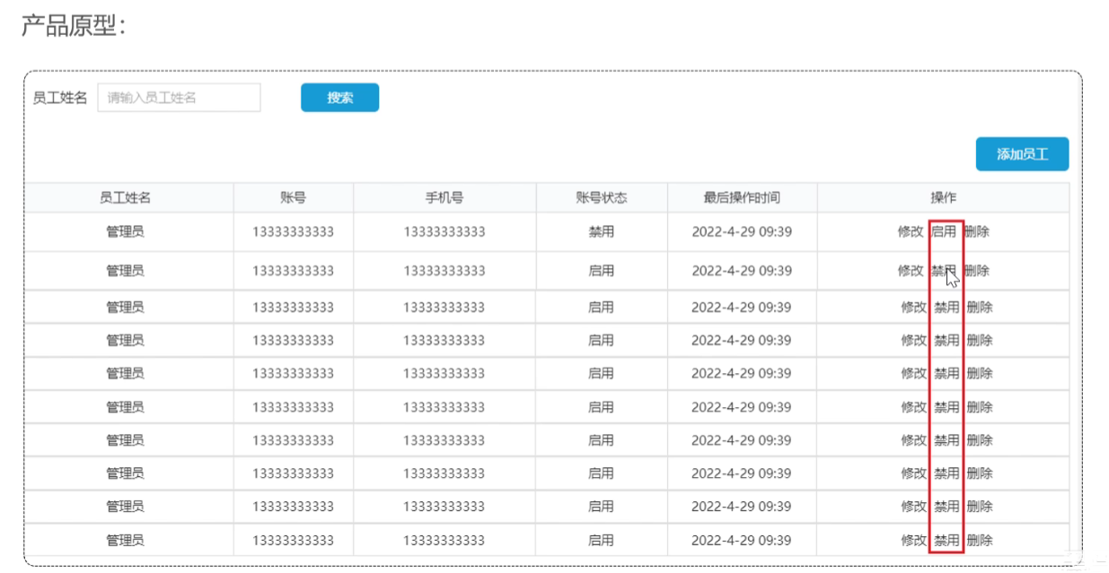 log.info("启用禁用员工账号:{}, {}", status, id);