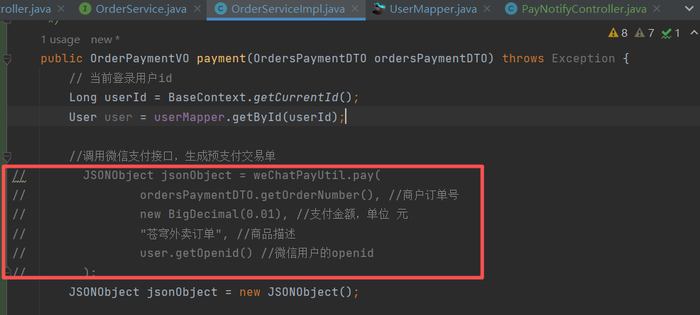 可以将OrderServiceImpl中的payment方法里的调用微信支付接口注释掉,重新new一个空的JSONObject对象