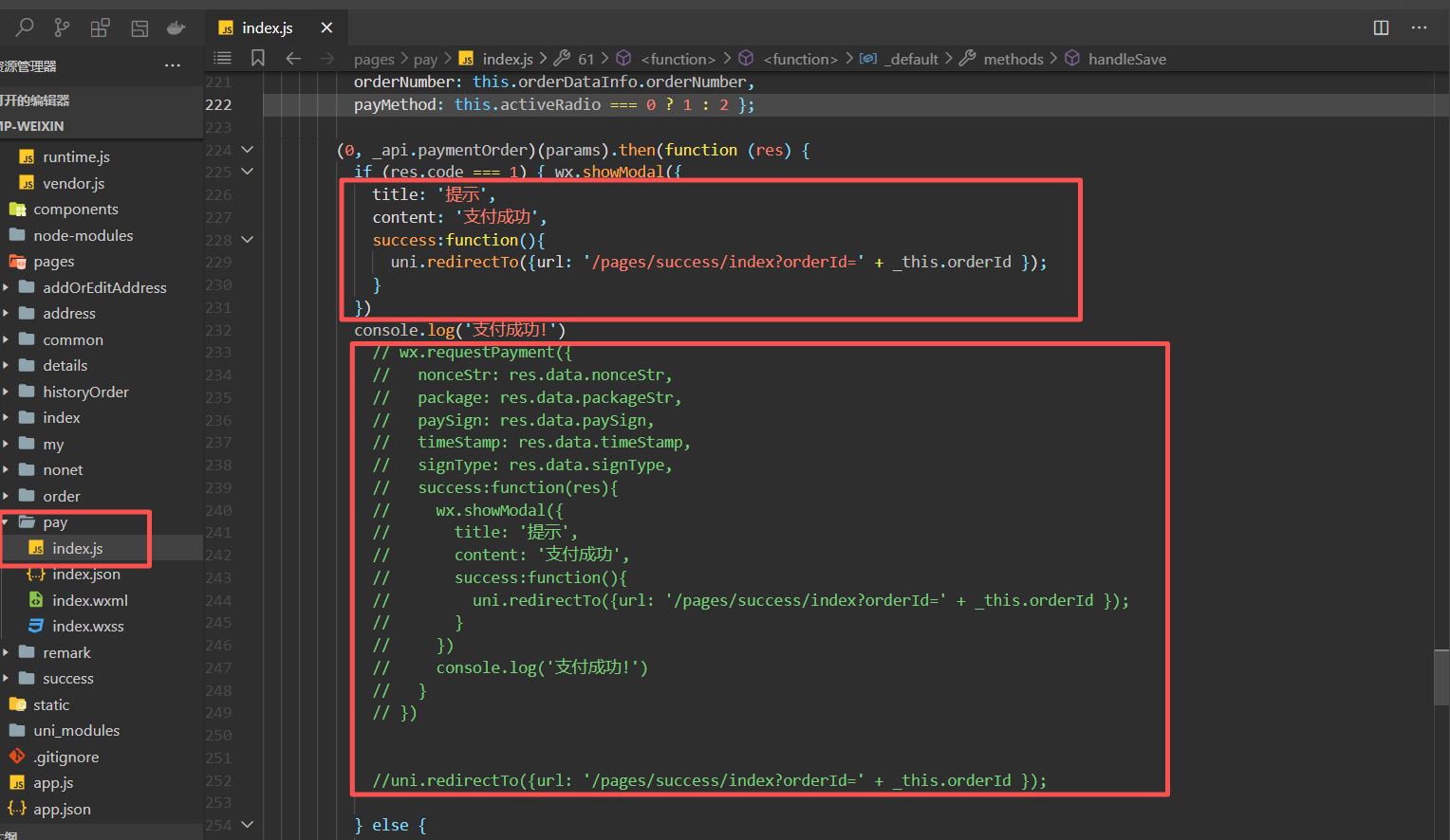 在前端程序中的pay中直接修改代码如下重新编译即可