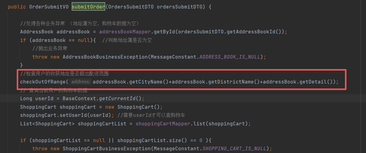 6、在OrderServiceImpl的submitOrder方法中调用上面的校验方法