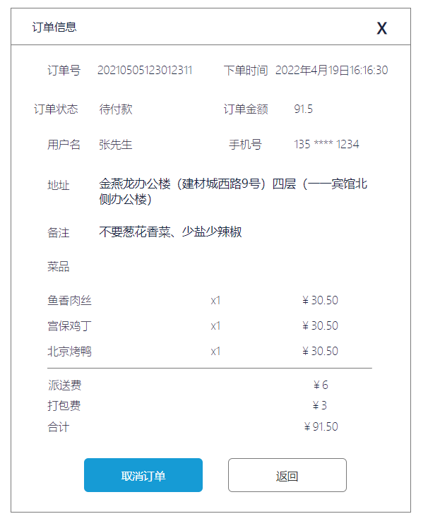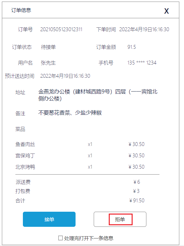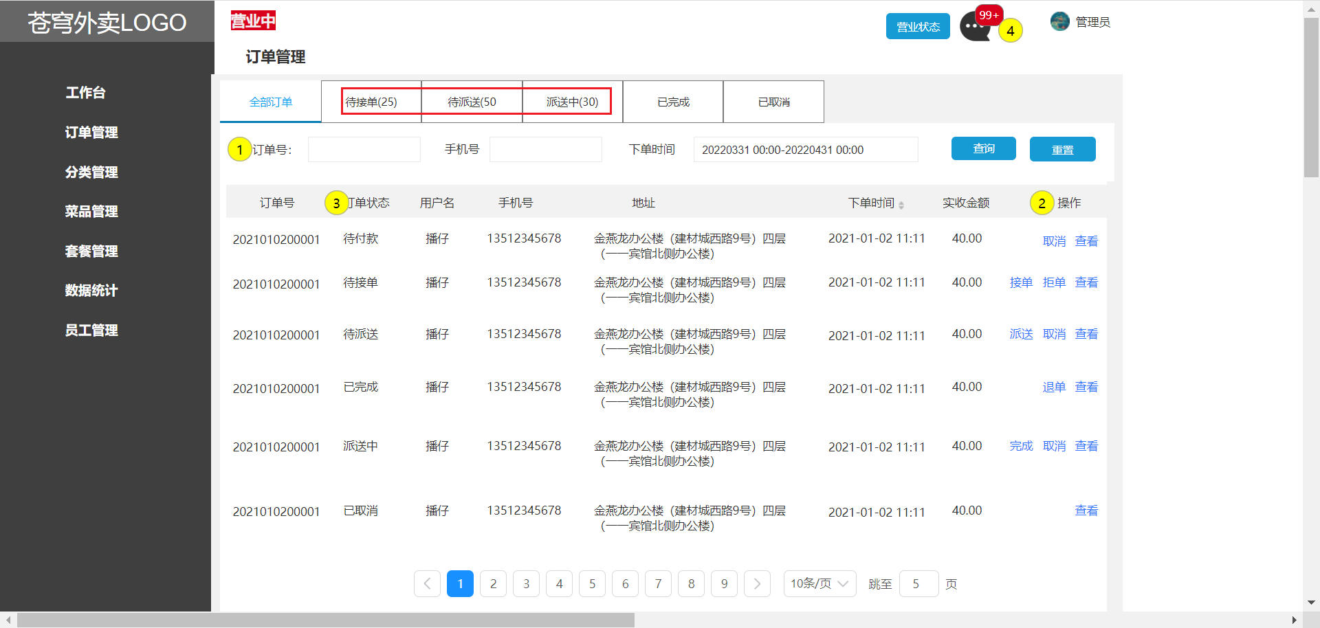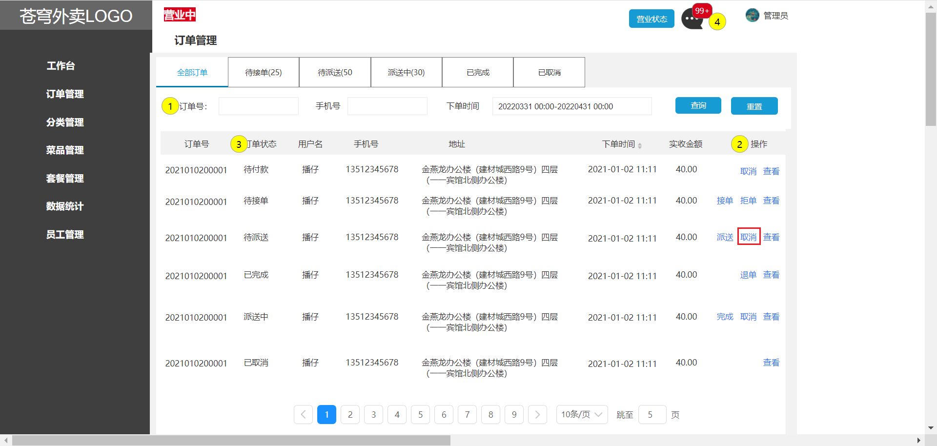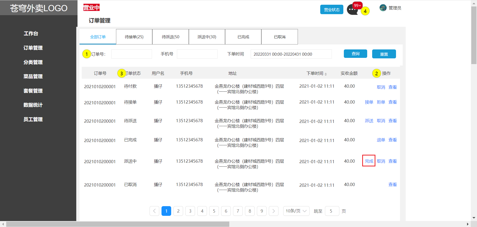 - 只有状态为“待派送”的订单可以执行派送订单操作