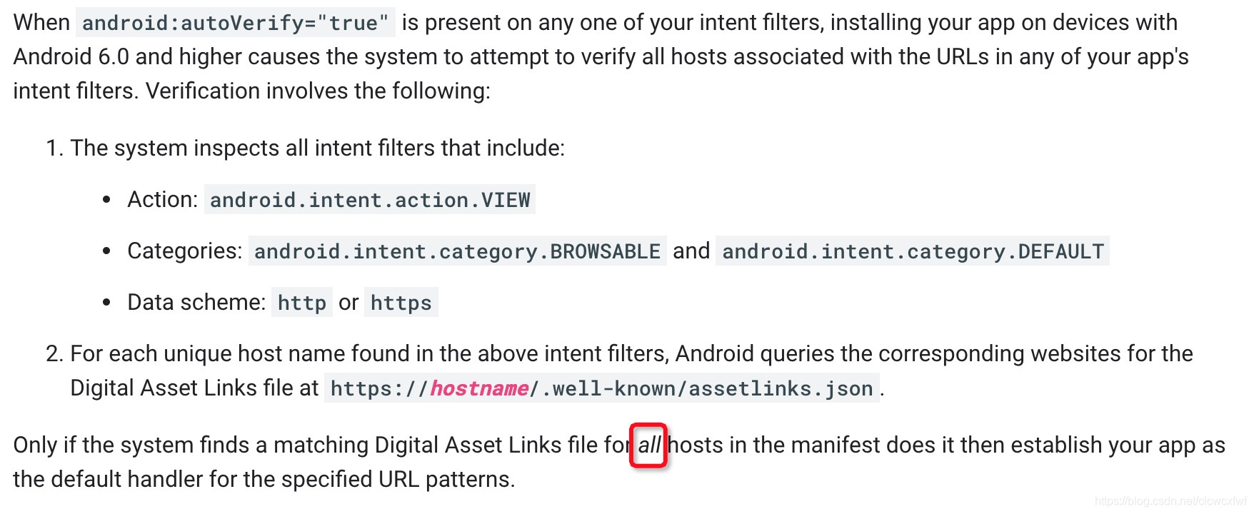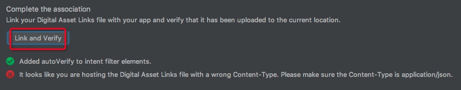 当我们在intent-filter里声明android:autoVerify="true”(只需要声明一个)后,安装app的时候,Android系统会验证所有我们声明的host。它会去https://hostname/.well-known/assetlinks.json 这个地方下载文件,然后做校验。