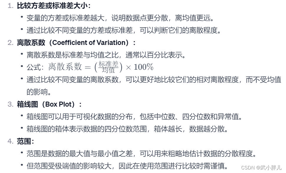 - 使用场景: 离散系数在比较不同尺度或单位的数据集时很有用,因为它是无量纲的,消除了尺度的影响。它对于需要考虑不同数据集相对分散程度而不仅仅是绝对分散程度的情况很有帮助。离散系数尤其在比较变异性较大的数据集时更具优势。