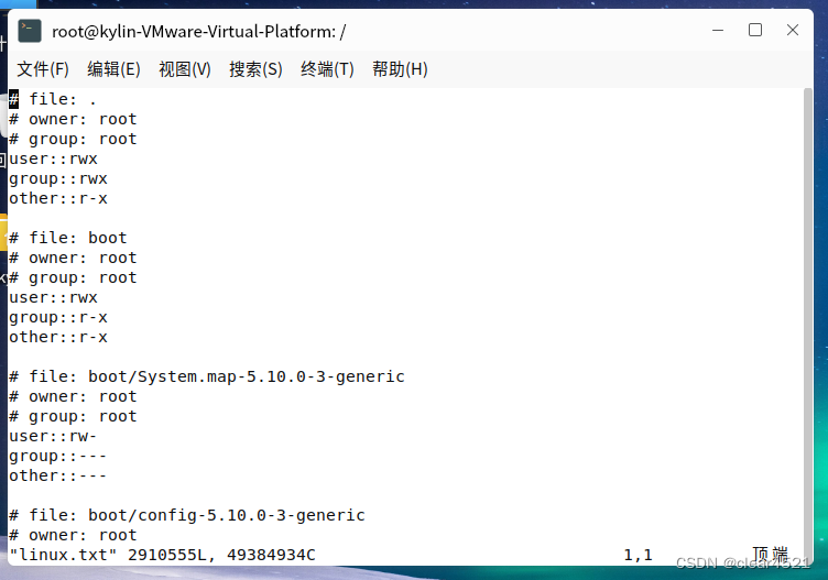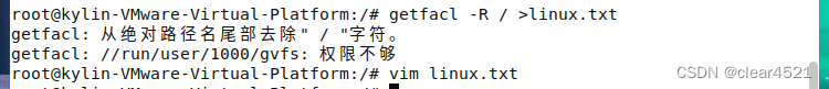 2.#sudo getfacl -p -R / >linux.txt 把该系统的权限导出到linux.txt文件中,该过程时间较久,等待执行完成: