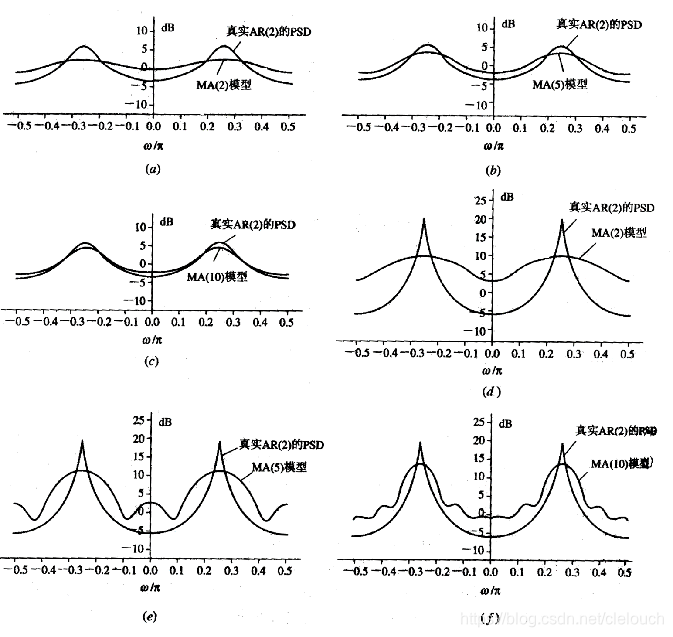 下图表示的是用MA模型估计二阶AR信号功率谱的例子。